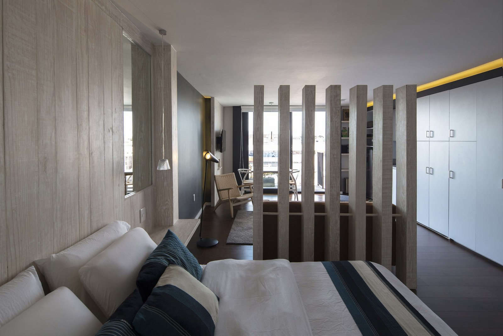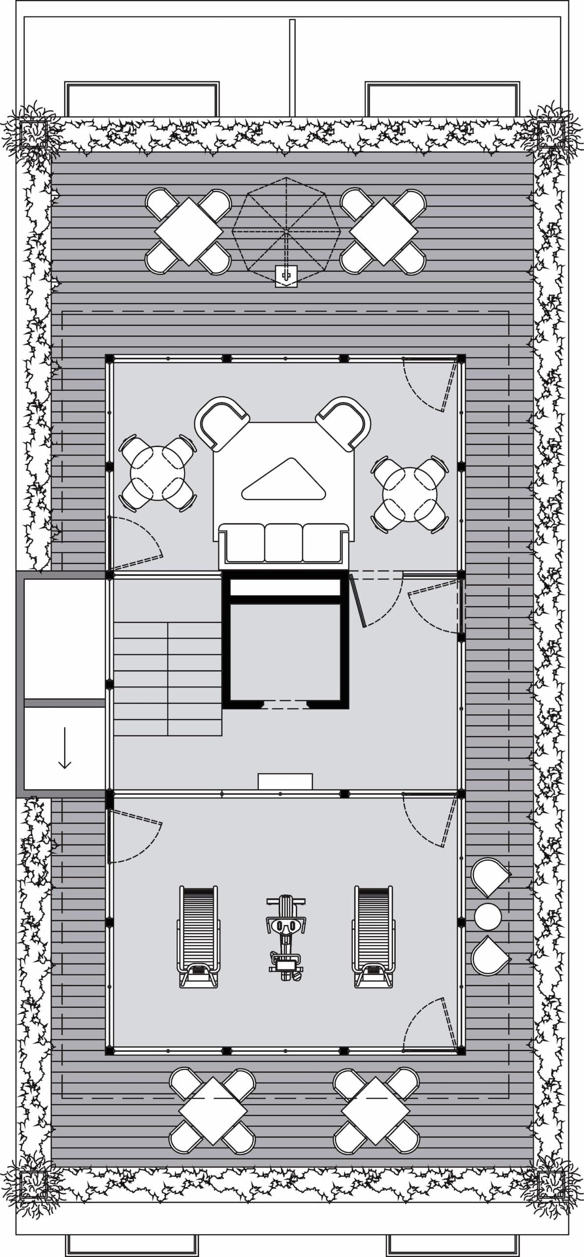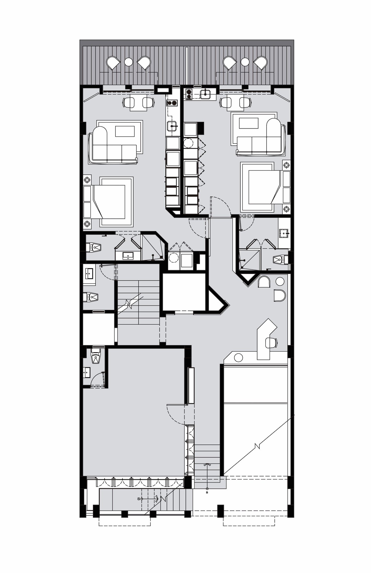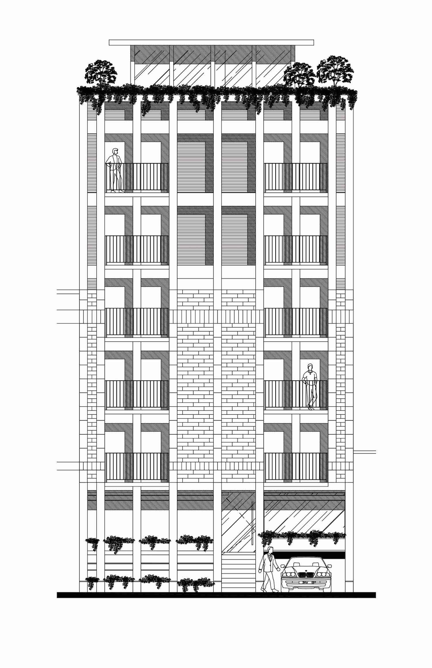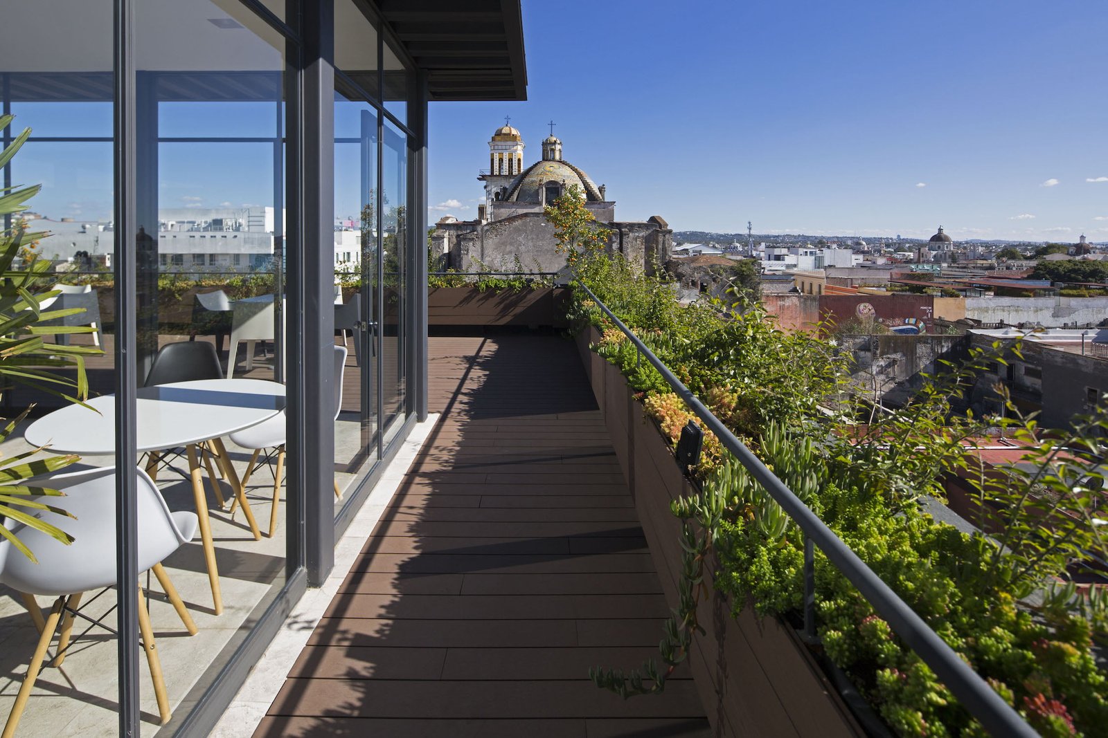 El programa de este edificio de seis niveles incluye locales comerciales, un roofgarden con vistas privilegiadas de la ciudad y veintidós departamentos de hasta 45 m2, cada uno con baño completo, sala, comedor, cocineta y balcón. En el nivel superior se encuentran las amenidades con gimnasio, asador y terraza.
