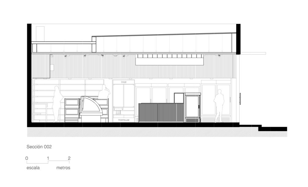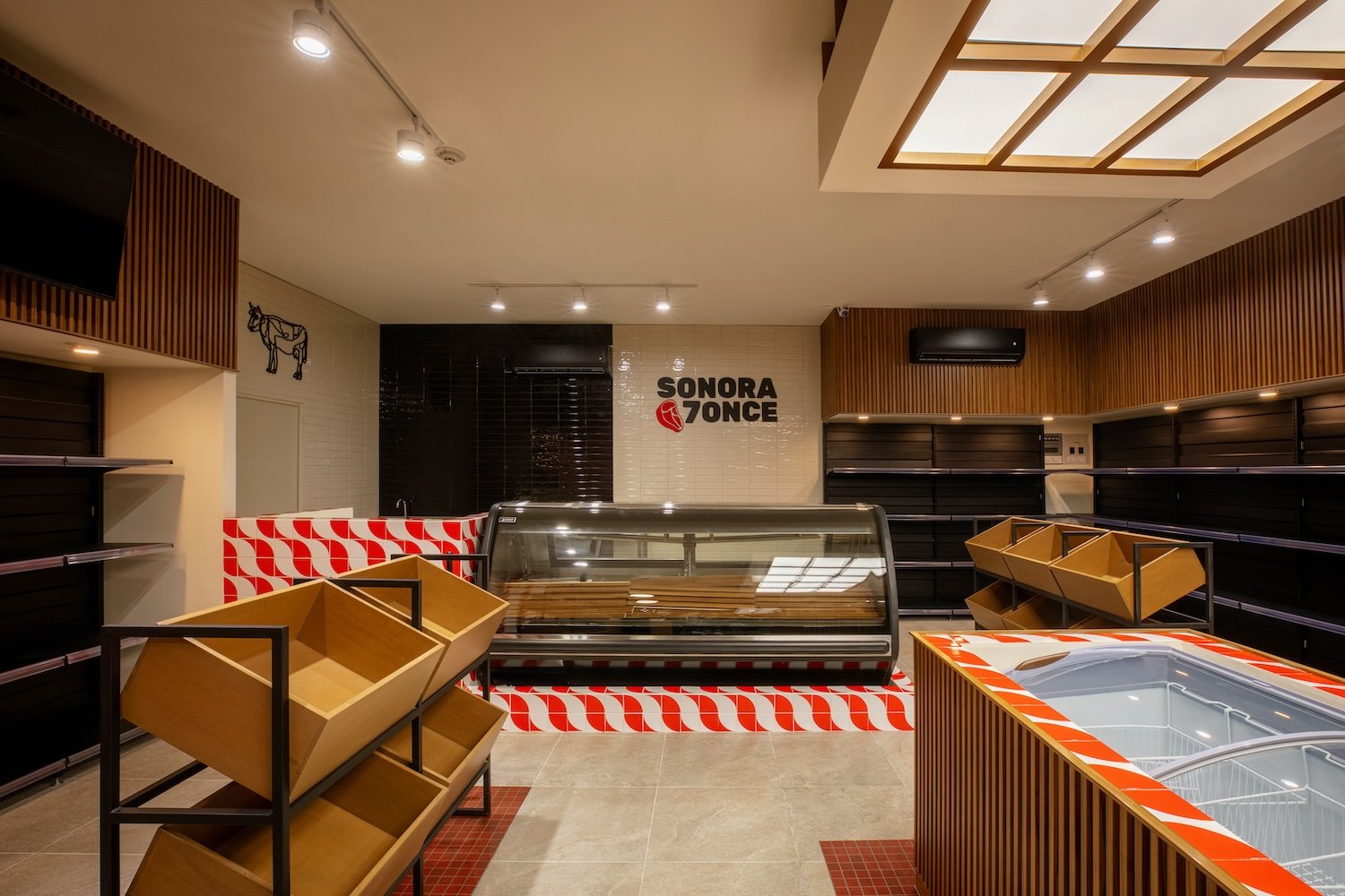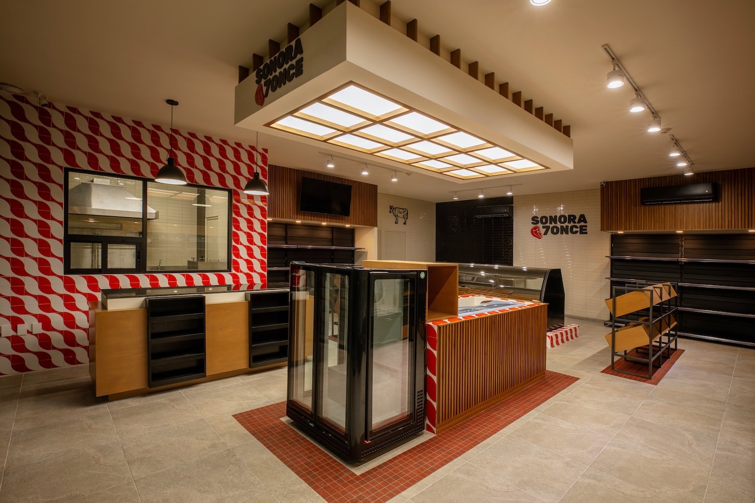 Ubicado en un local comercial de 100.00 m² en Mazatlán, el programa requería precisión: tienda, área de caja, carnicería con vitrina y preparación, zona de grill, medio baño y almacenamiento. El primer reto fue ordenar estos espacios sin sacrificar fluidez ni jerarquía visual. Se diseñó una distribución que permite recorridos intuitivos, visibilidad transversal desde el acceso hasta el fondo, y una lectura clara de las funciones desde cualquier punto del local. El espacio se organiza como un recorrido contenido, donde el cliente, transita frente a cada unidad de exhibición antes de llegar a la caja.