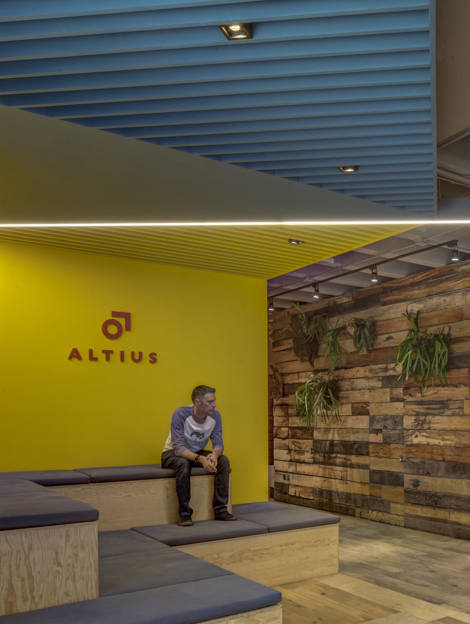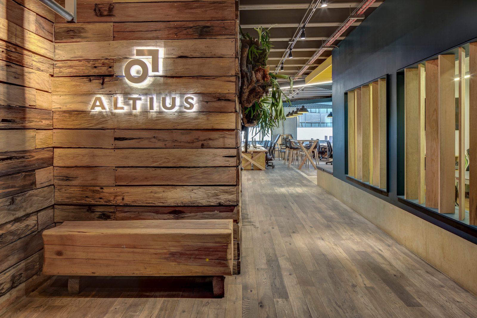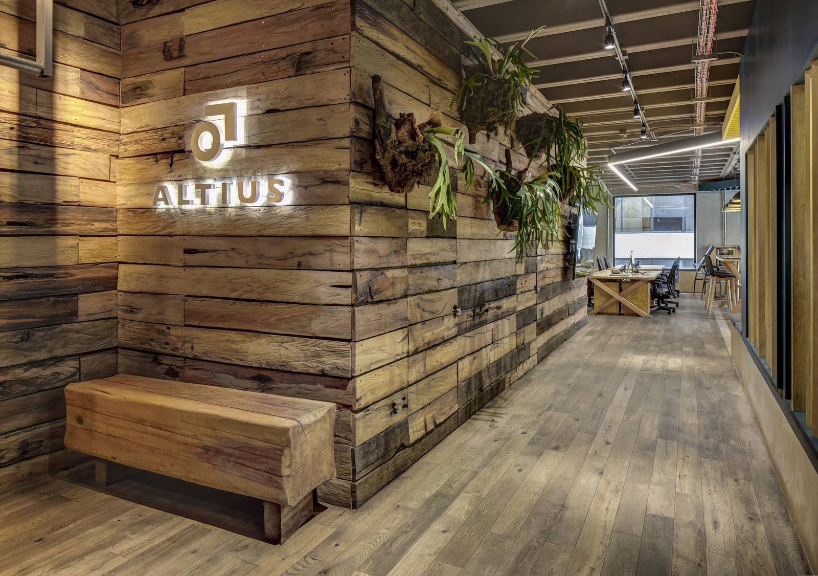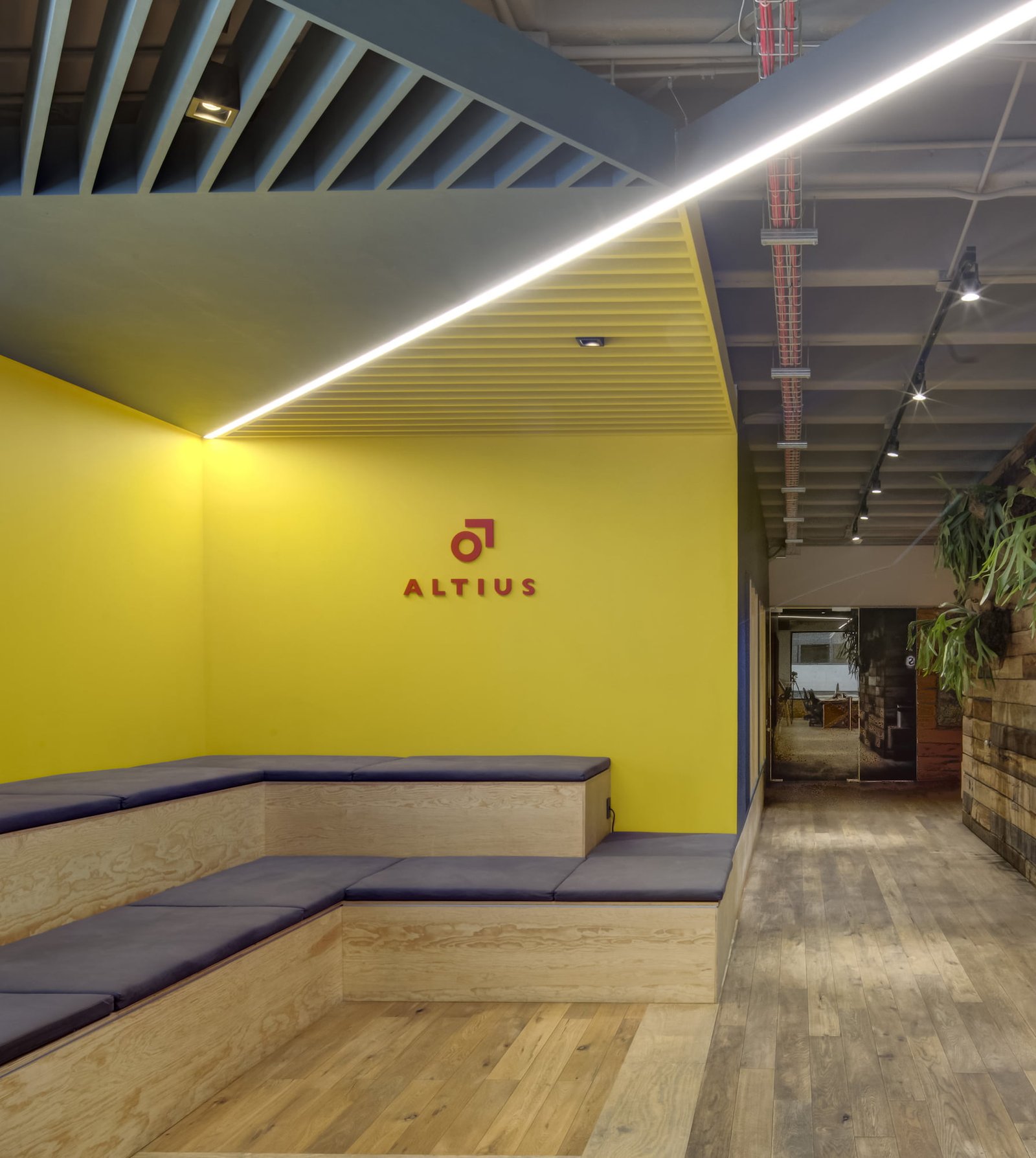 La entrada es a través de un lobby, envuelto por un muro de madera rústico, que se despliega y se convierte en el pasillo y conduce al área común. Aquí, el elemento principal es una grada en triplay de pino, forrada de cojines en los asientos para hacerla cómoda: un espacio dinámico para trabajar, realizar juntas y conferencias. En el resto de área se ubica la zona de trabajo común con mesas continuas de OSB laqueado y, frente a ella, se ubican secciones privadas con puertas de vidrio. El uso de la madera rústica y OSB además de ser materiales reciclados que otorgan sustentabilidad al proyecto, otorgan una personalidad distintiva de las oficinas de Altius, junto con los plafones asimétricos de color azul y una línea continua de luz LED que cubren tan sólo una parte de la losa encasetonada expuesta.