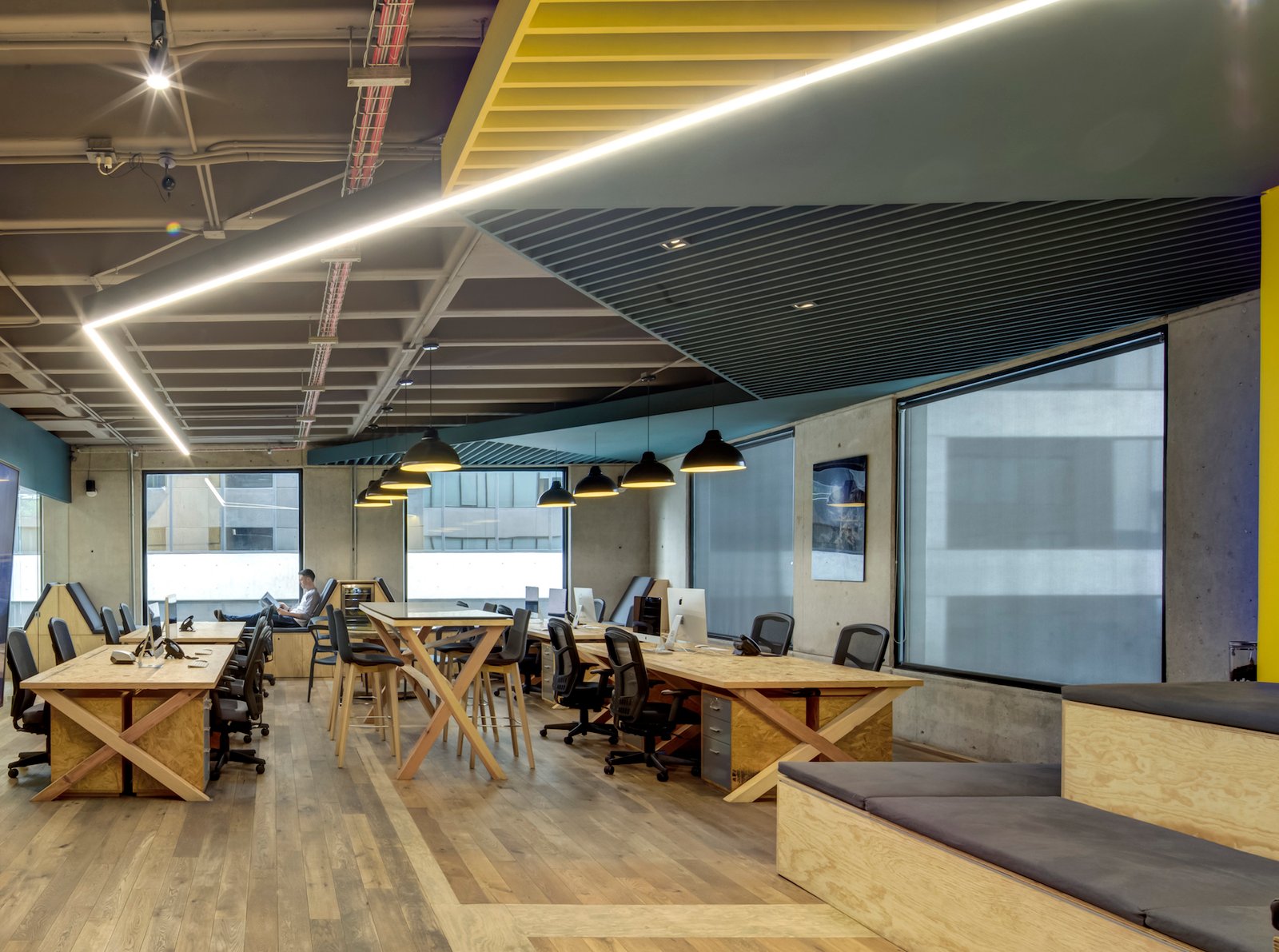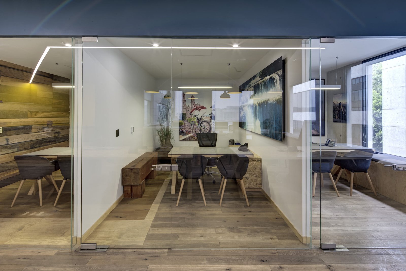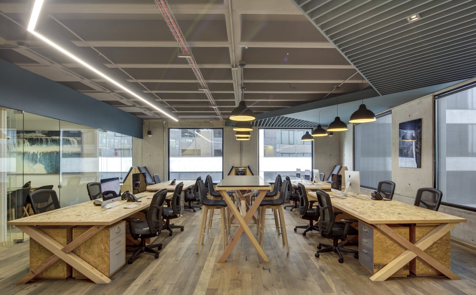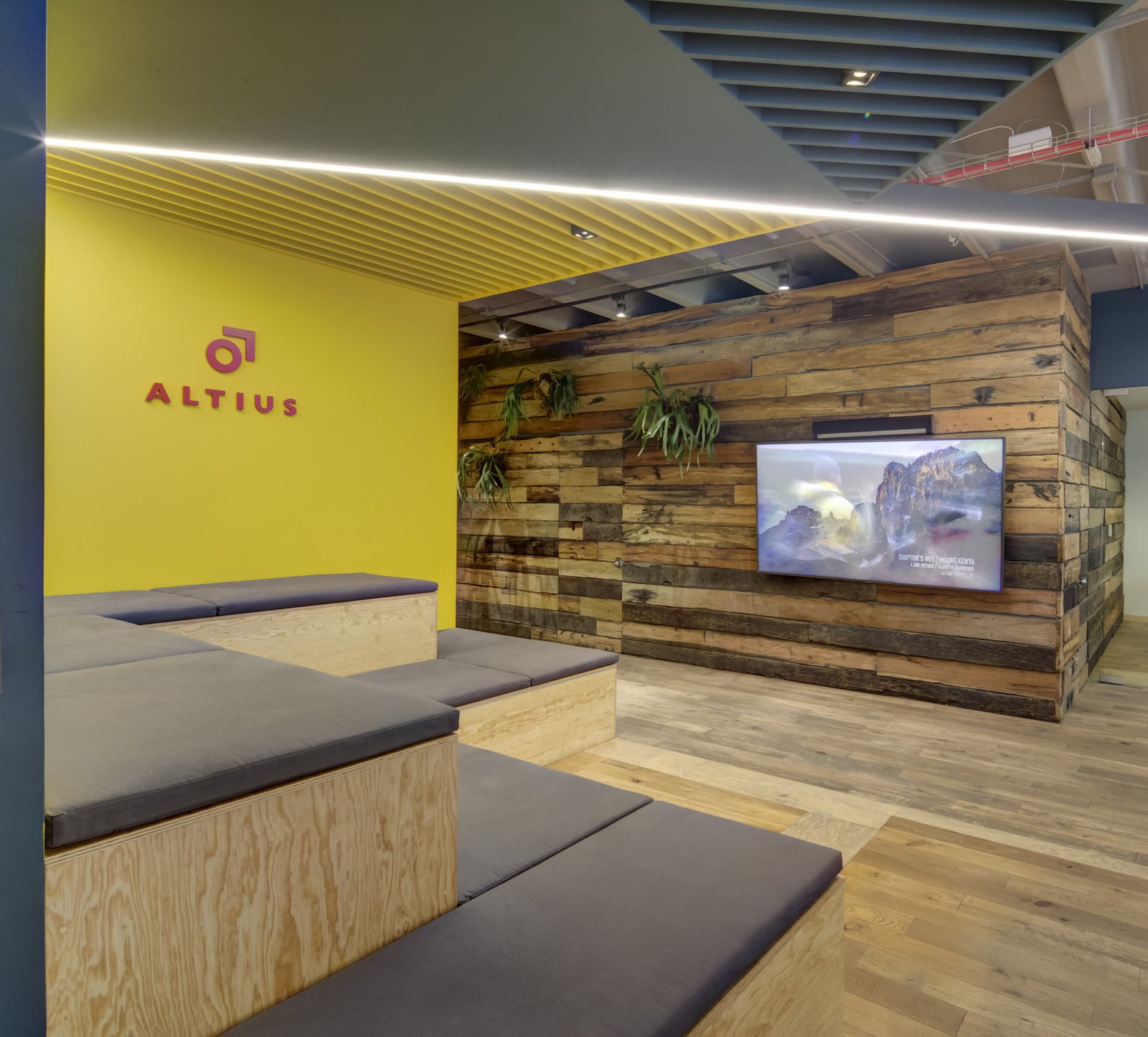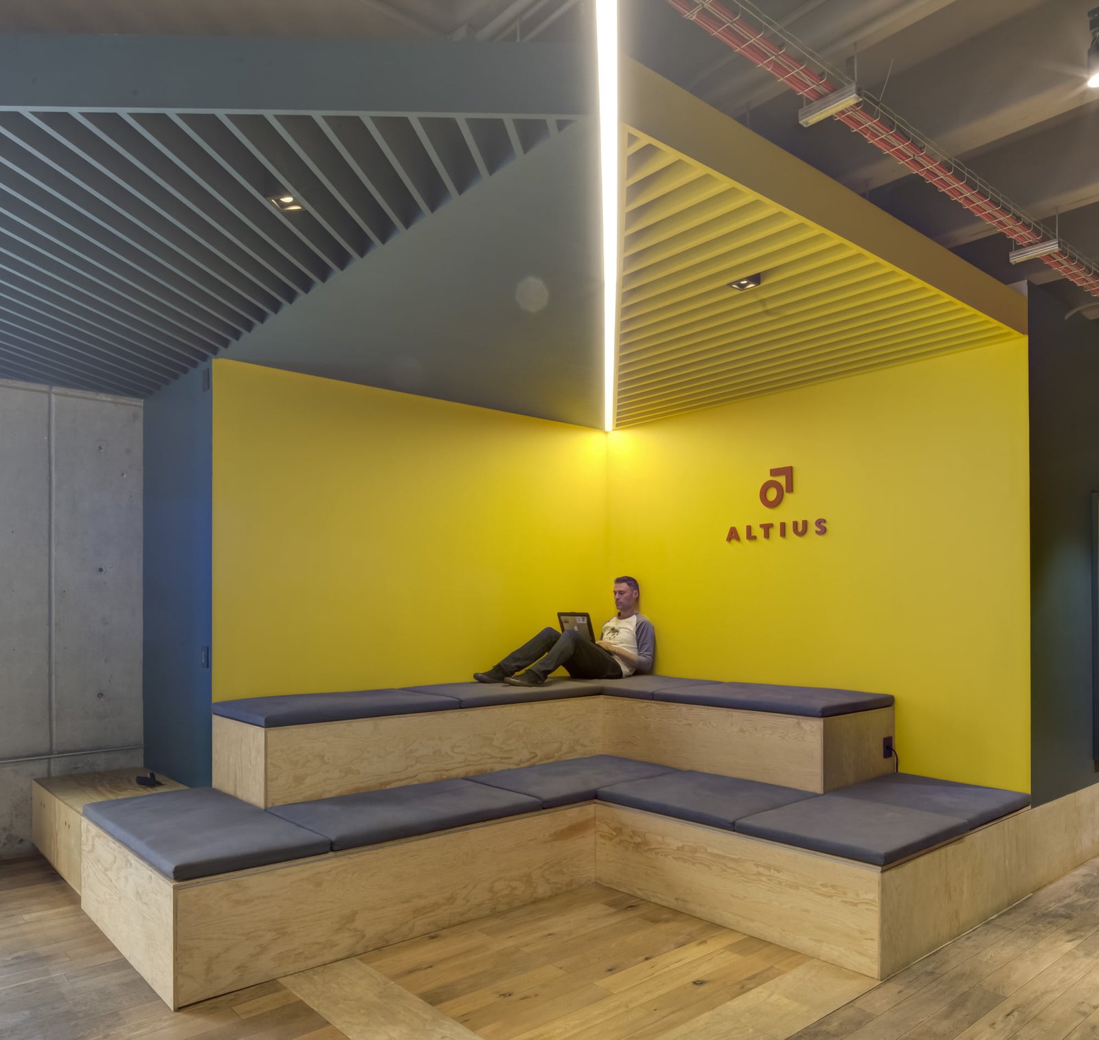 La entrada es a través de un lobby, envuelto por un muro de madera rústico, que se despliega y se convierte en el pasillo y conduce al área común. Aquí, el elemento principal es una grada en triplay de pino, forrada de cojines en los asientos para hacerla cómoda: un espacio dinámico para trabajar, realizar juntas y conferencias. En el resto de área se ubica la zona de trabajo común con mesas continuas de OSB laqueado y, frente a ella, se ubican secciones privadas con puertas de vidrio. El uso de la madera rústica y OSB además de ser materiales reciclados que otorgan sustentabilidad al proyecto, otorgan una personalidad distintiva de las oficinas de Altius, junto con los plafones asimétricos de color azul y una línea continua de luz LED que cubren tan sólo una parte de la losa encasetonada expuesta.