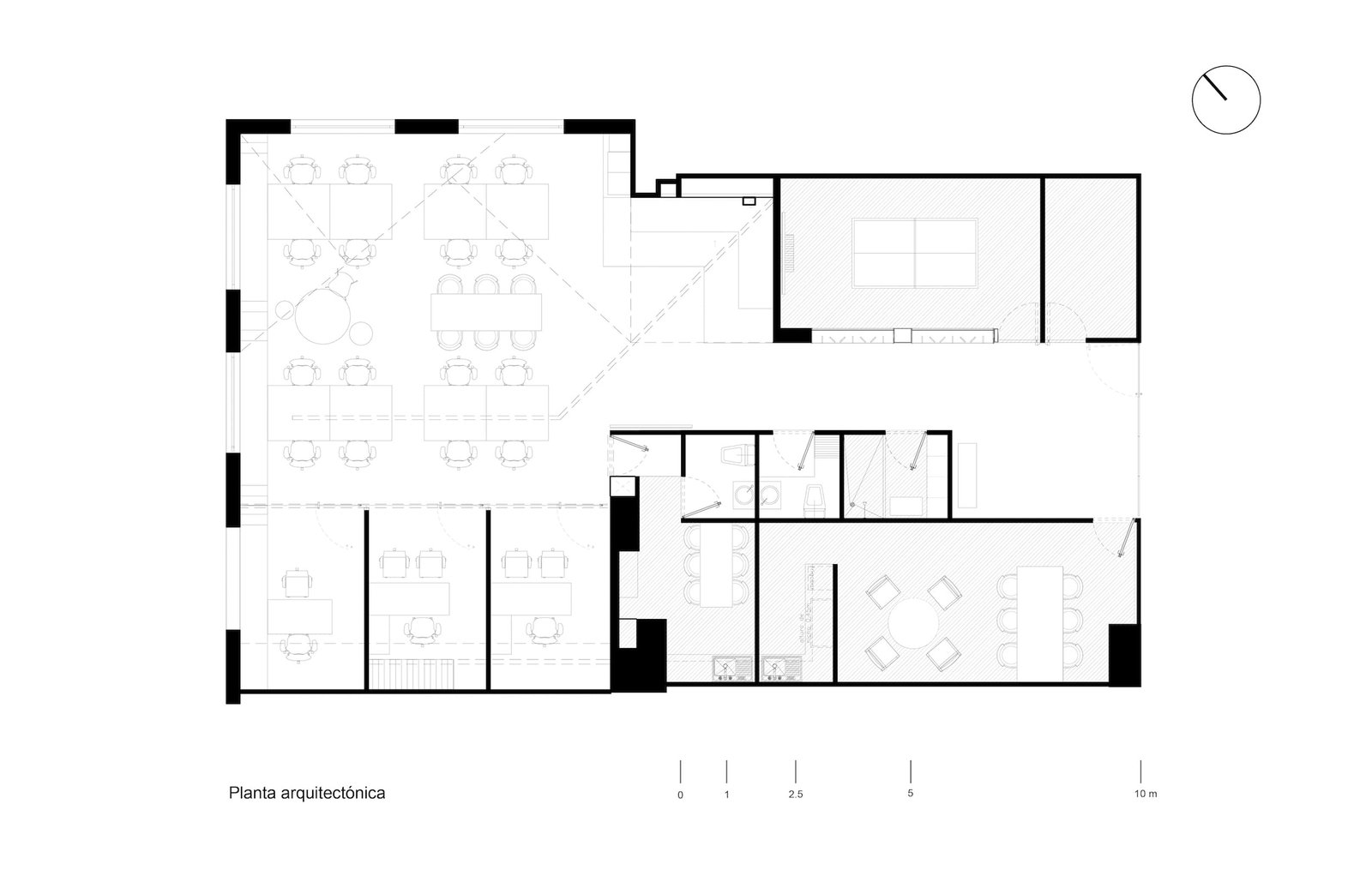 Con la finalidad de alcanzar un resultado óptimo, se analizó la relación de flujos entre cada una de las diferentes áreas; la iluminación natural que recibirían y las formas de trabajar específicas de la empresa y sus colaboradores. Este análisis fue el sustento y guía para decidir los trazos, formas, colores y acabados de diseño que contribuyeran a obtener un funcionamiento óptimo y lograr ambientes adecuados de trabajo.