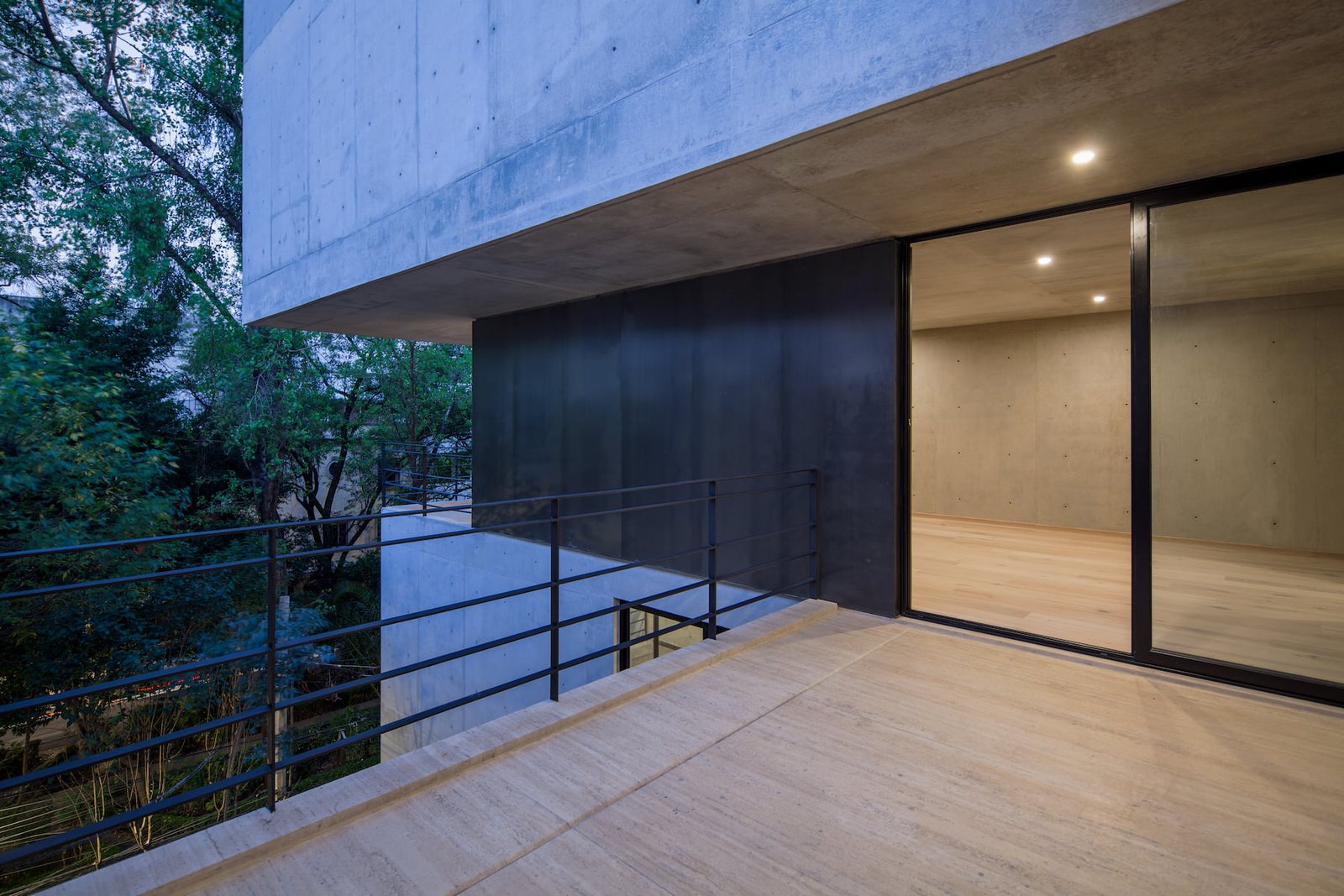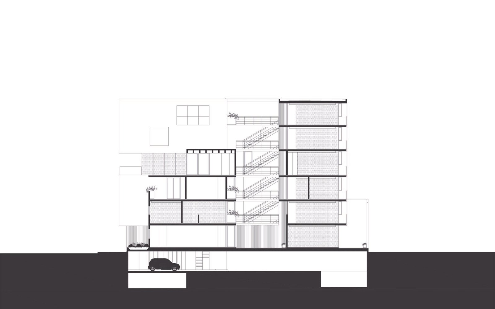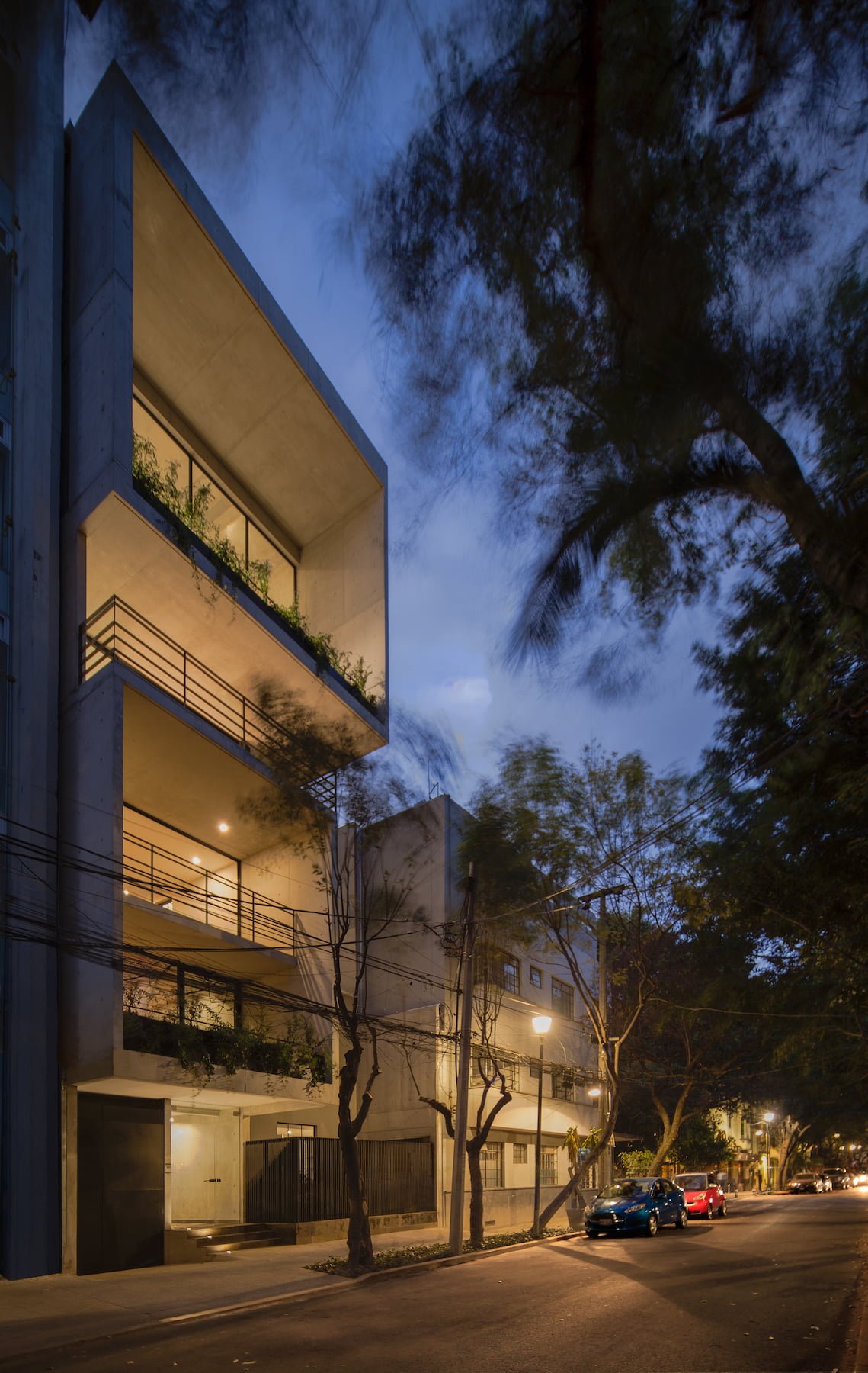En la parte posterior del predio el edificio se remete en su fachada poniente para generar una serie de terrazas que dan protección solar y aprovechan las vistas hacia el parque España.