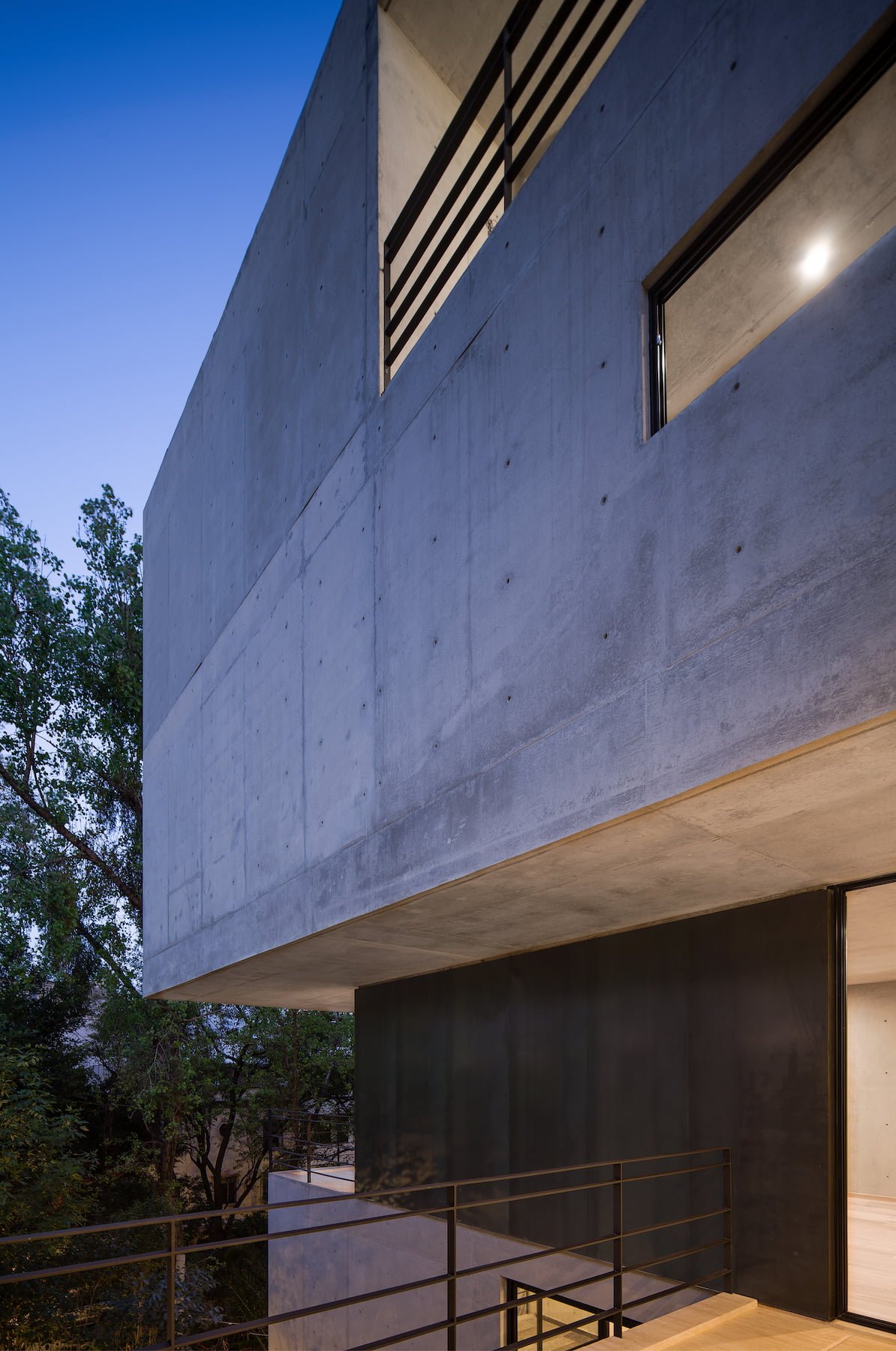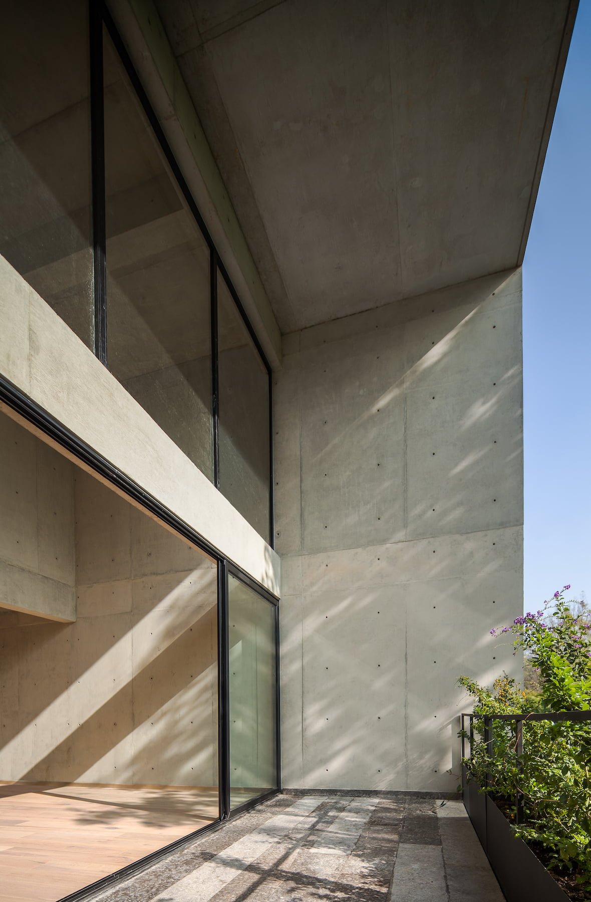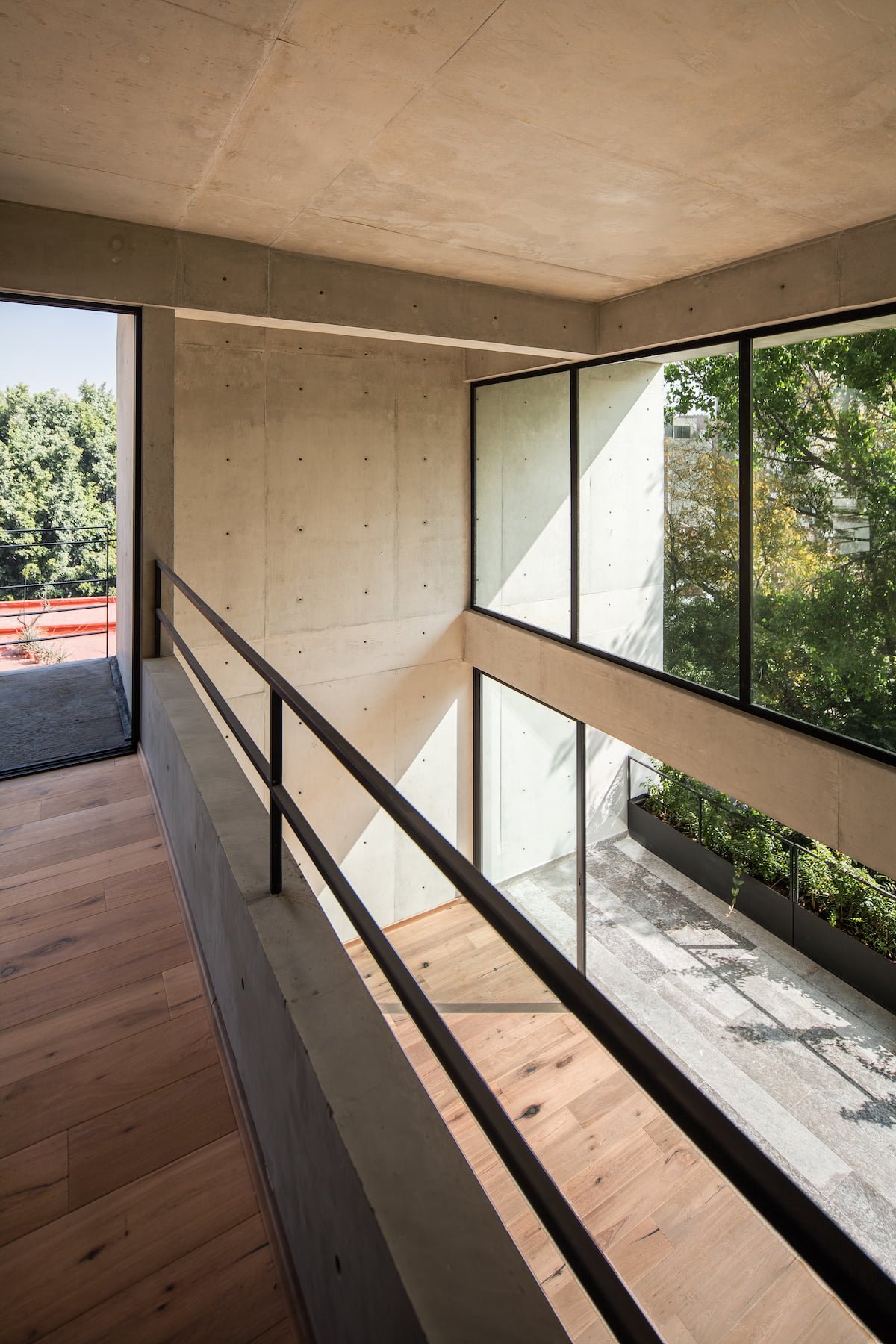 El proyecto se resolvió en dos grandes volúmenes, a manera de cajas de concreto aparente, orientadas hacia la avenida arbolada para logran enmarcar las mejores vistas hacia el contexto.