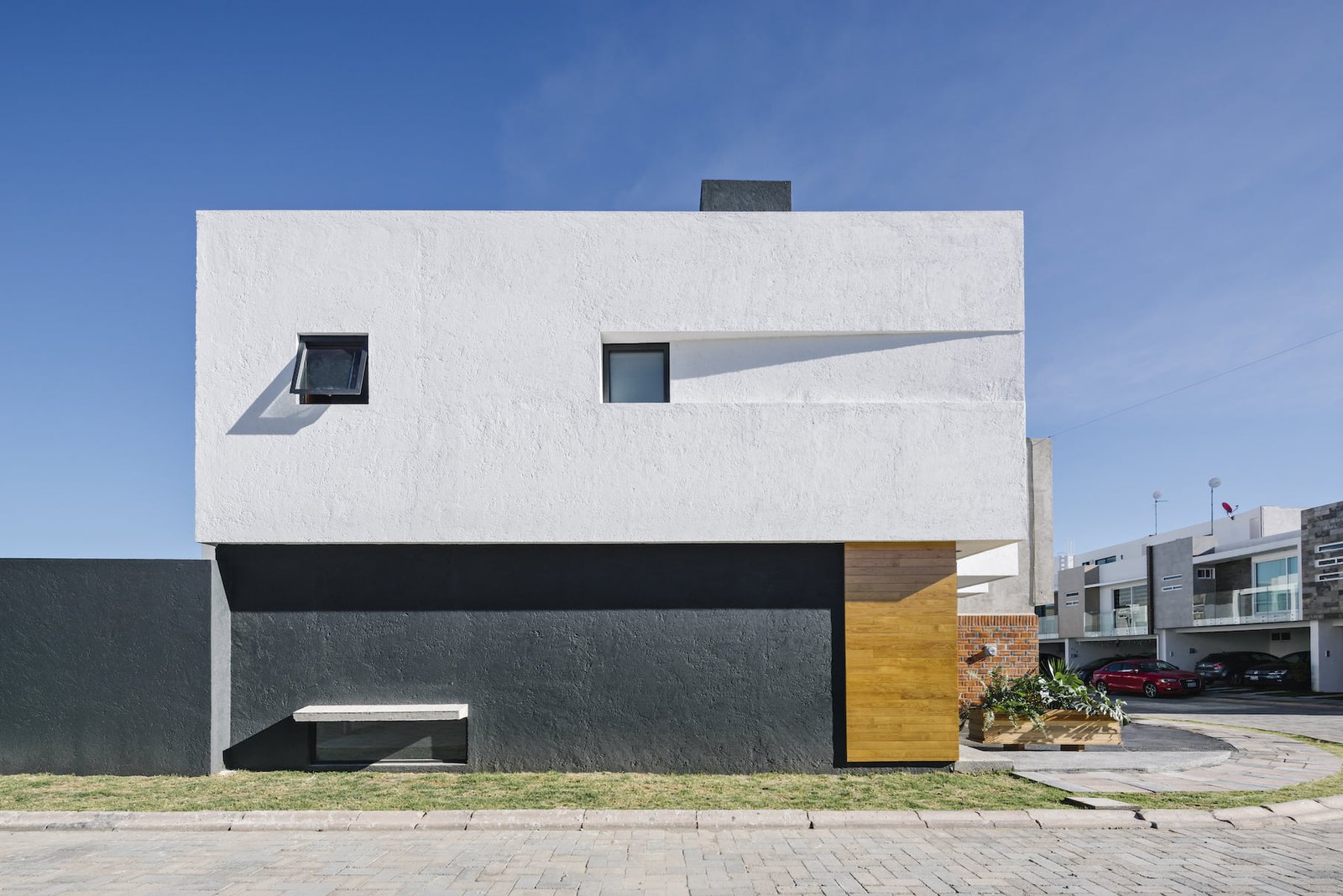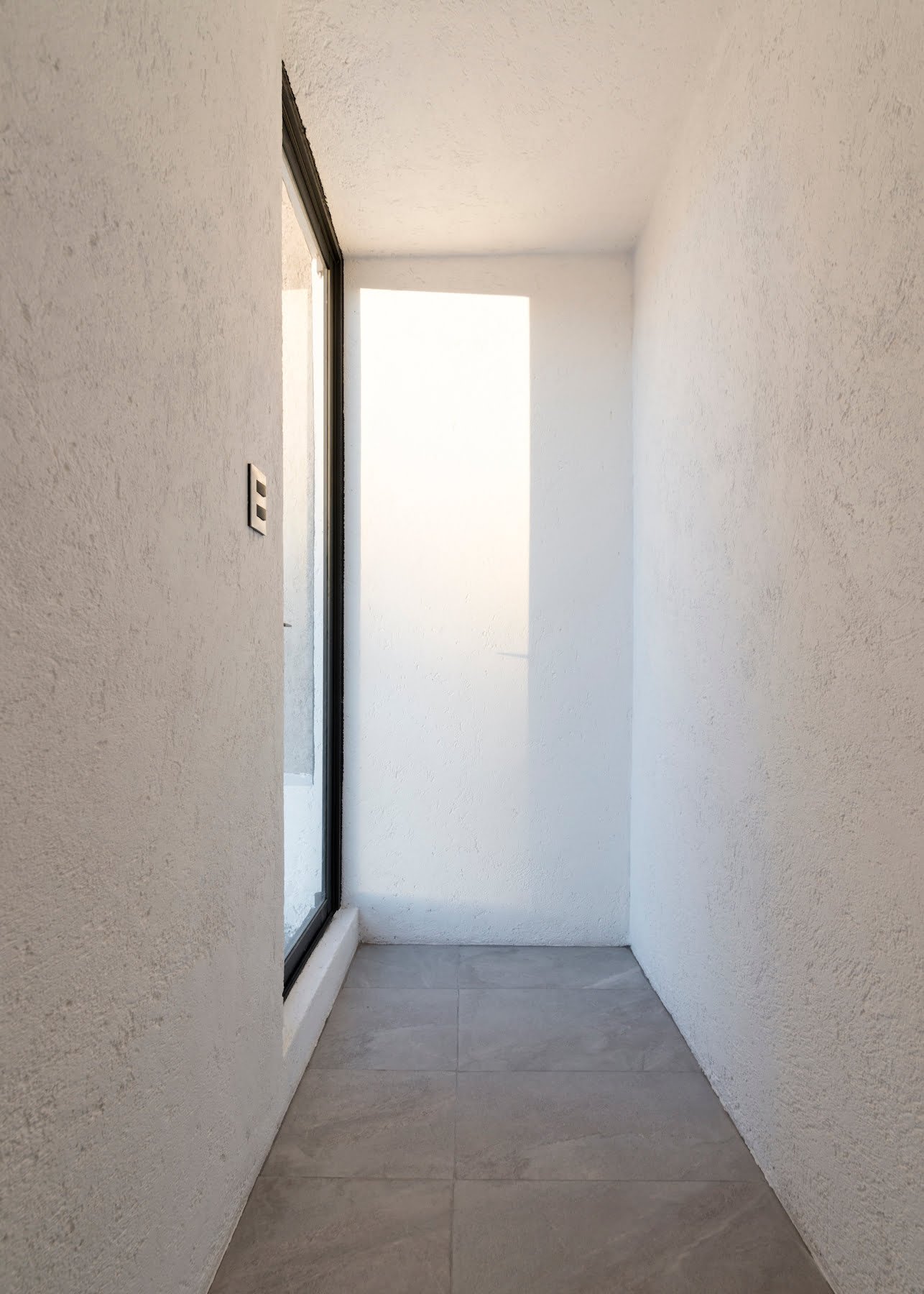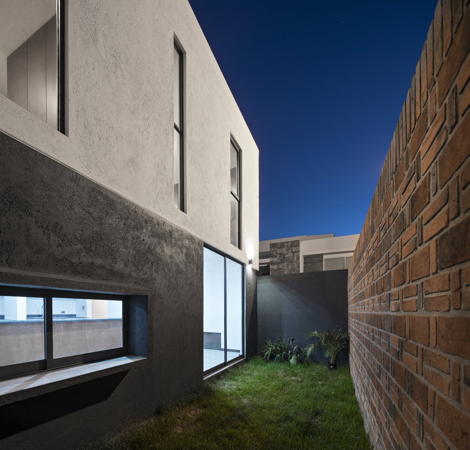 La secuencia de la casa, arranca con el acceso en esquina, retrasado y jerarquizado con una piel de madera para liberar la cochera y servicios (bodega, calentador-hidroneumático, área de lavado, tocador, despensa y cocina) concentrados al frente e integrándose a todo un basamento taciturno, para contrastar con el repellado rústico en blanco de la planta alta. La materialidad complementaria es el tabique rojo recocido en los muros colindantes, diseñados como testigos del tiempo al ser consumidos por la vegetación y el contacto con el agua y otros fenómenos de la naturaleza.