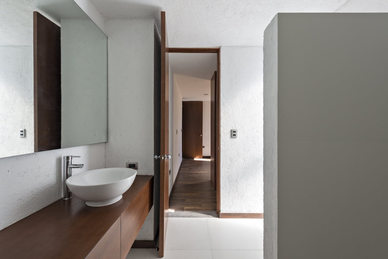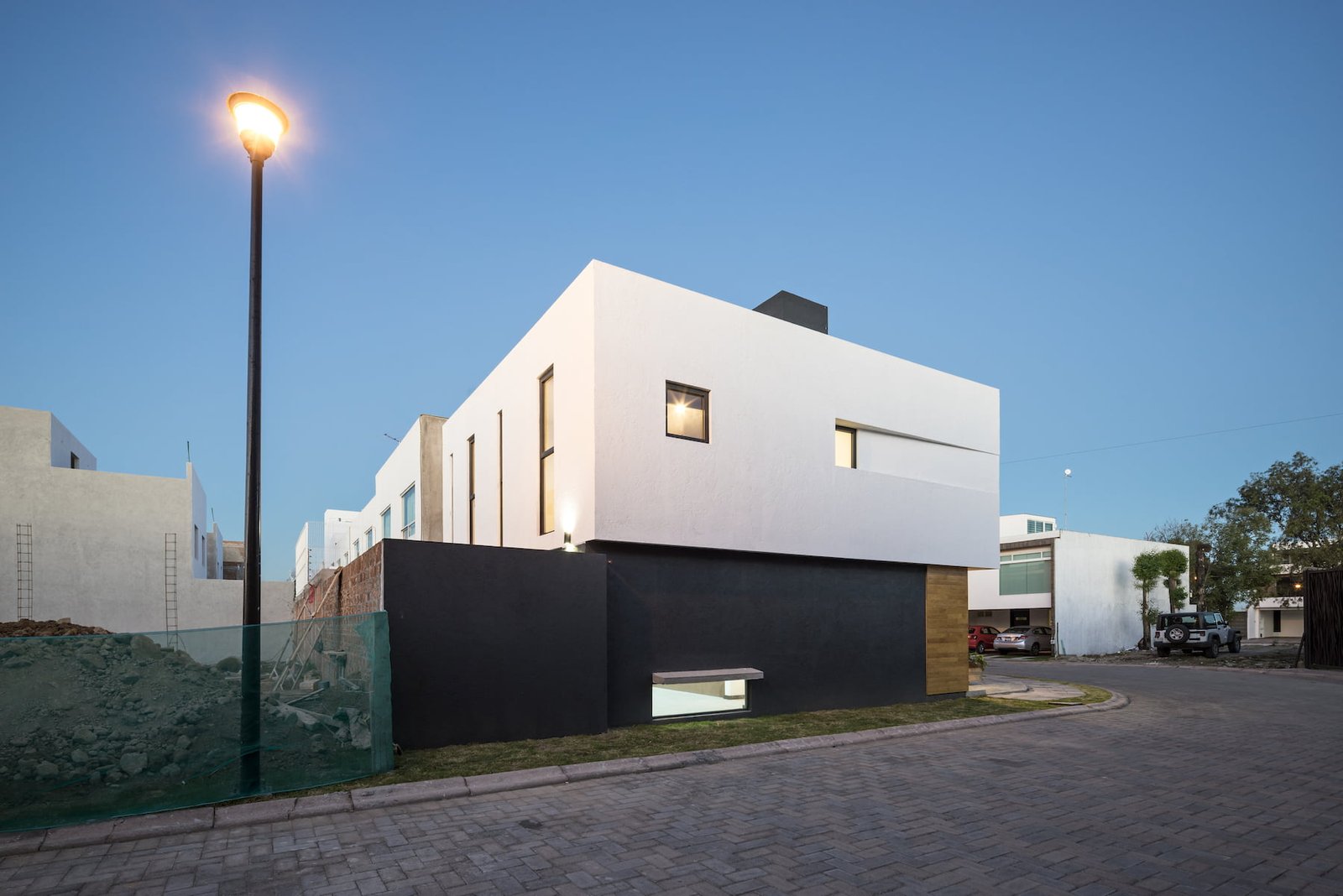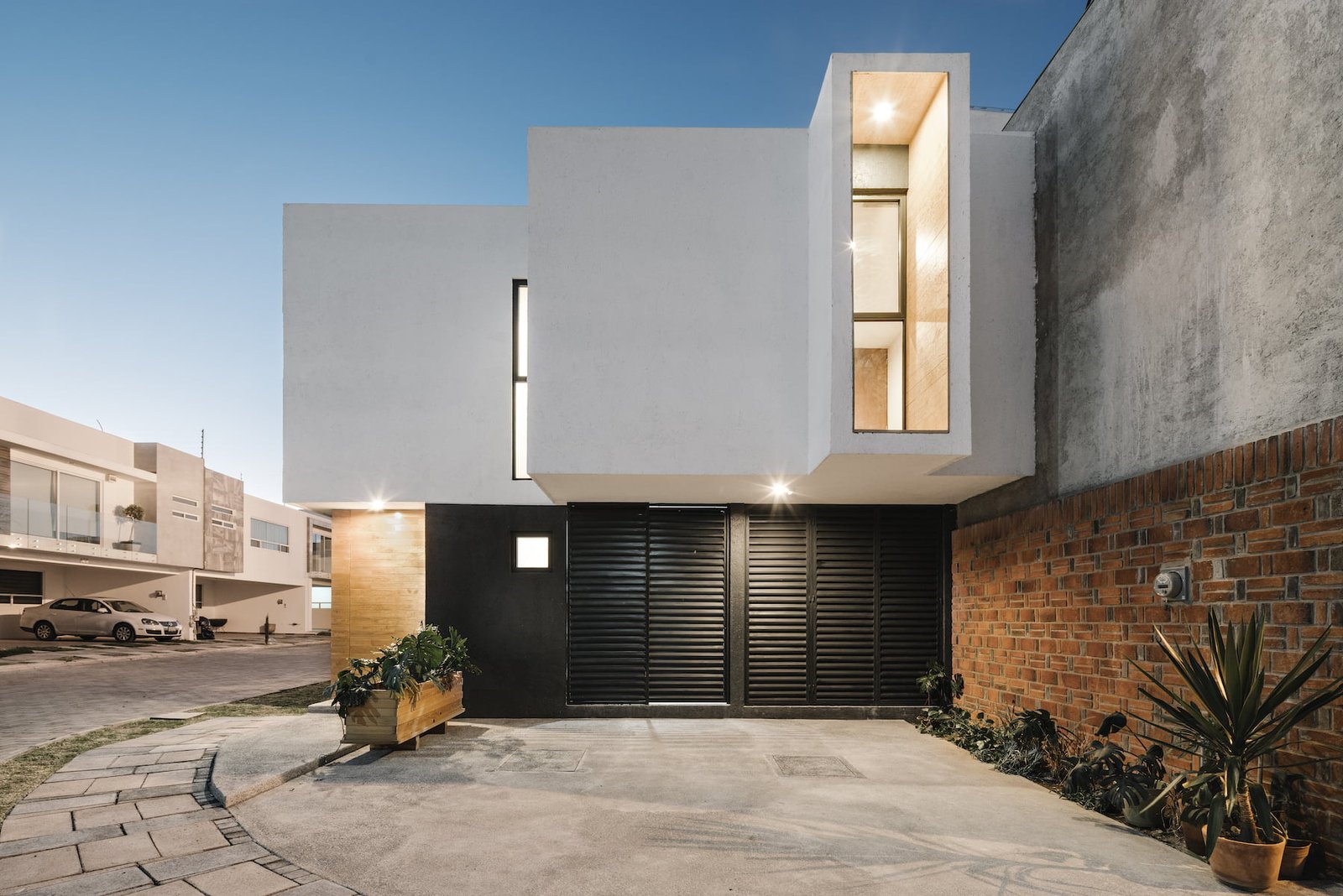 La secuencia de la casa, arranca con el acceso en esquina, retrasado y jerarquizado con una piel de madera para liberar la cochera y servicios (bodega, calentador-hidroneumático, área de lavado, tocador, despensa y cocina) concentrados al frente e integrándose a todo un basamento taciturno, para contrastar con el repellado rústico en blanco de la planta alta. La materialidad complementaria es el tabique rojo recocido en los muros colindantes, diseñados como testigos del tiempo al ser consumidos por la vegetación y el contacto con el agua y otros fenómenos de la naturaleza.