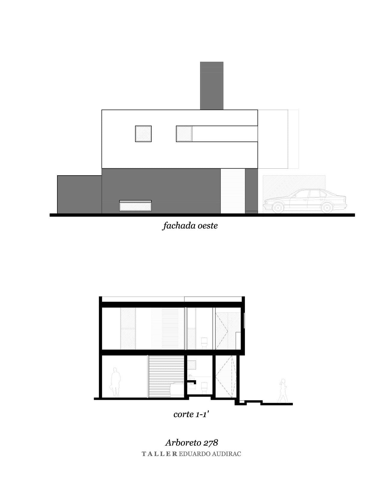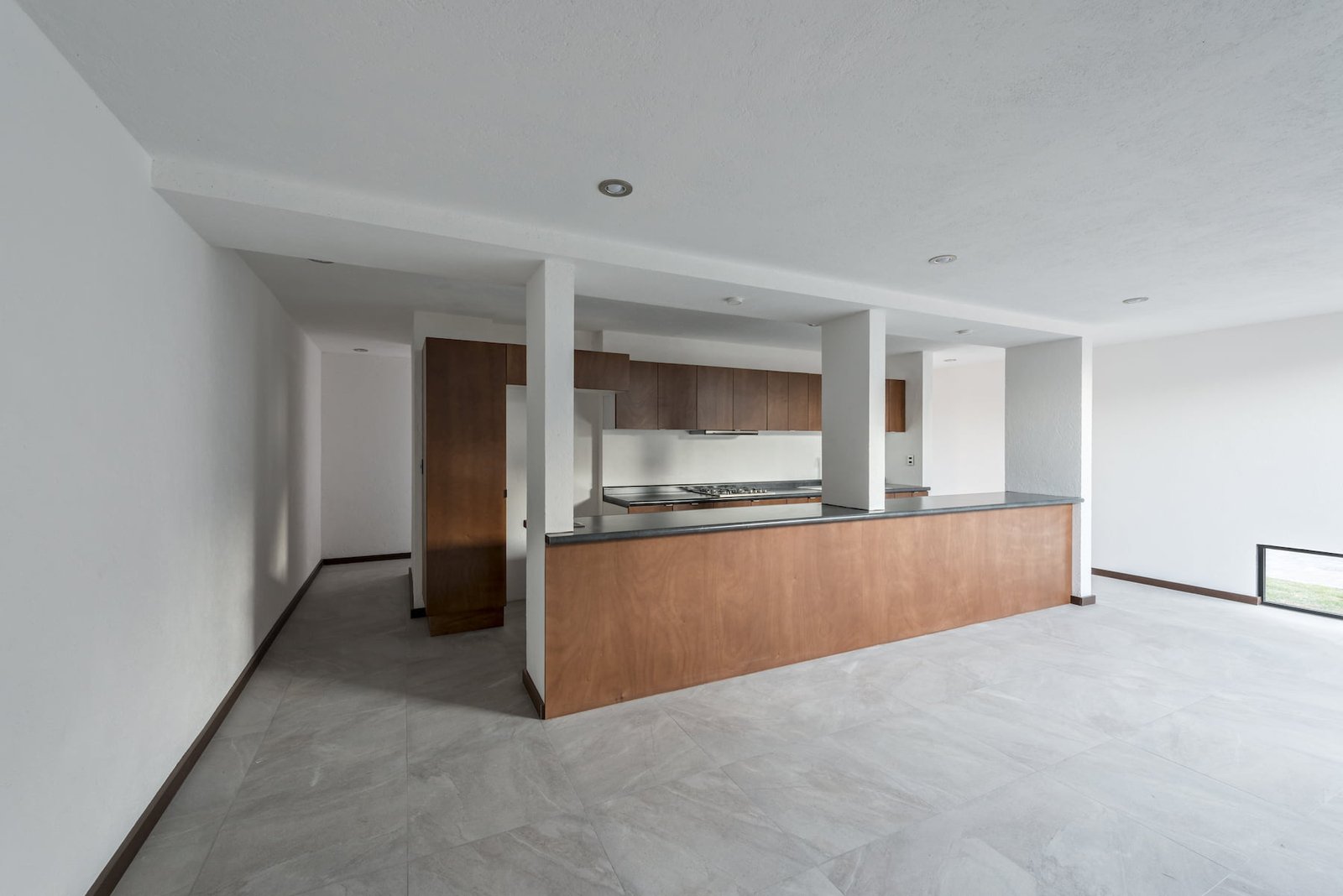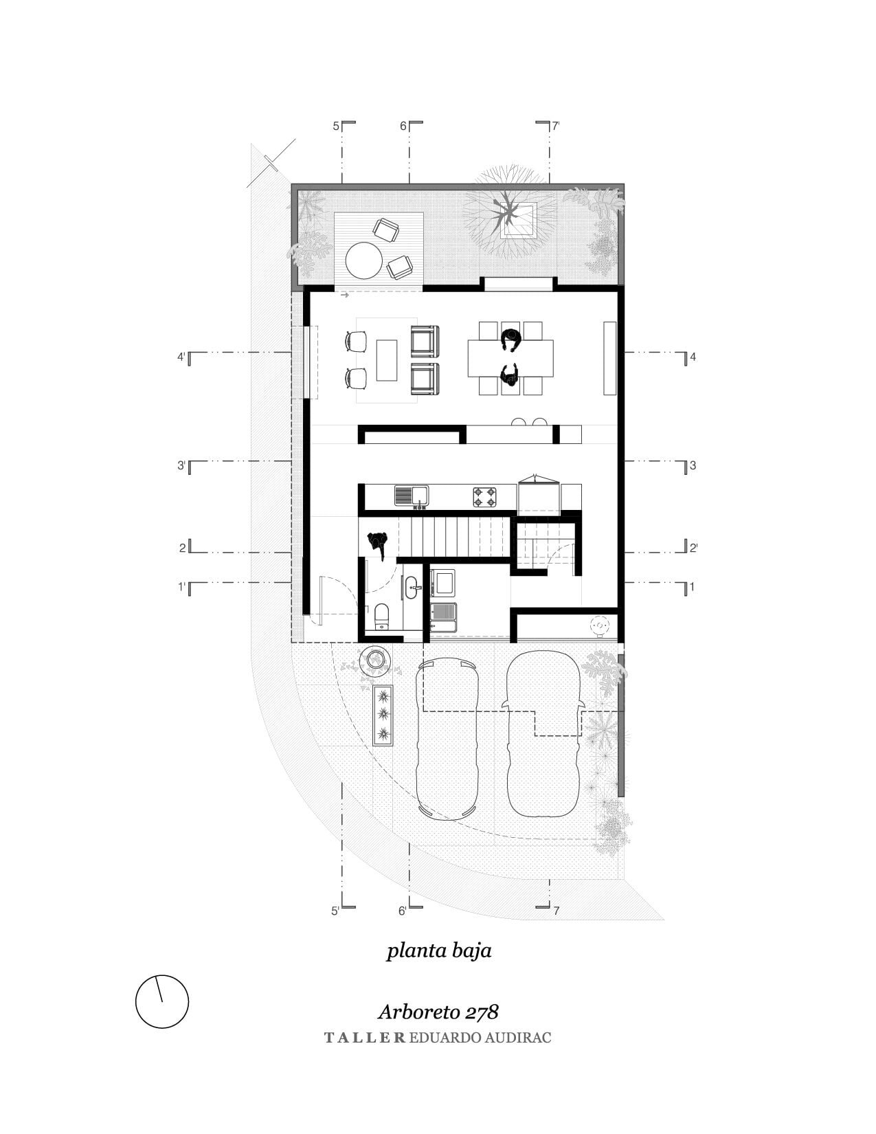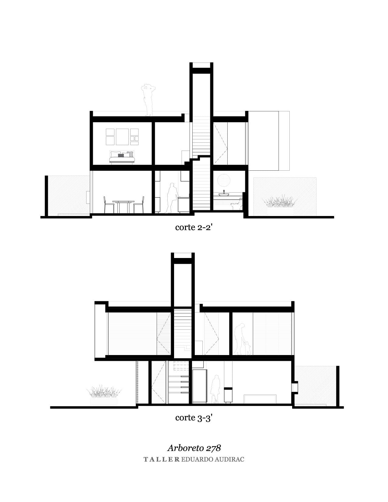 Recorriendo y continuando esta secuencia espacial. En la planta baja se proyecta un eje lineal de circulación que a manera de ‘esquema peine’ organiza la escalera y la entrada a la cocina con los servicios desde el interior de la casa; se remata con el jardín y los ‘muros testigo’ abrazando las visuales de sala-comedor-cocina.