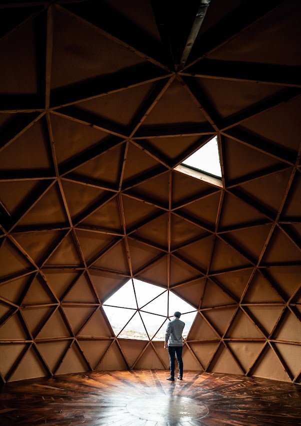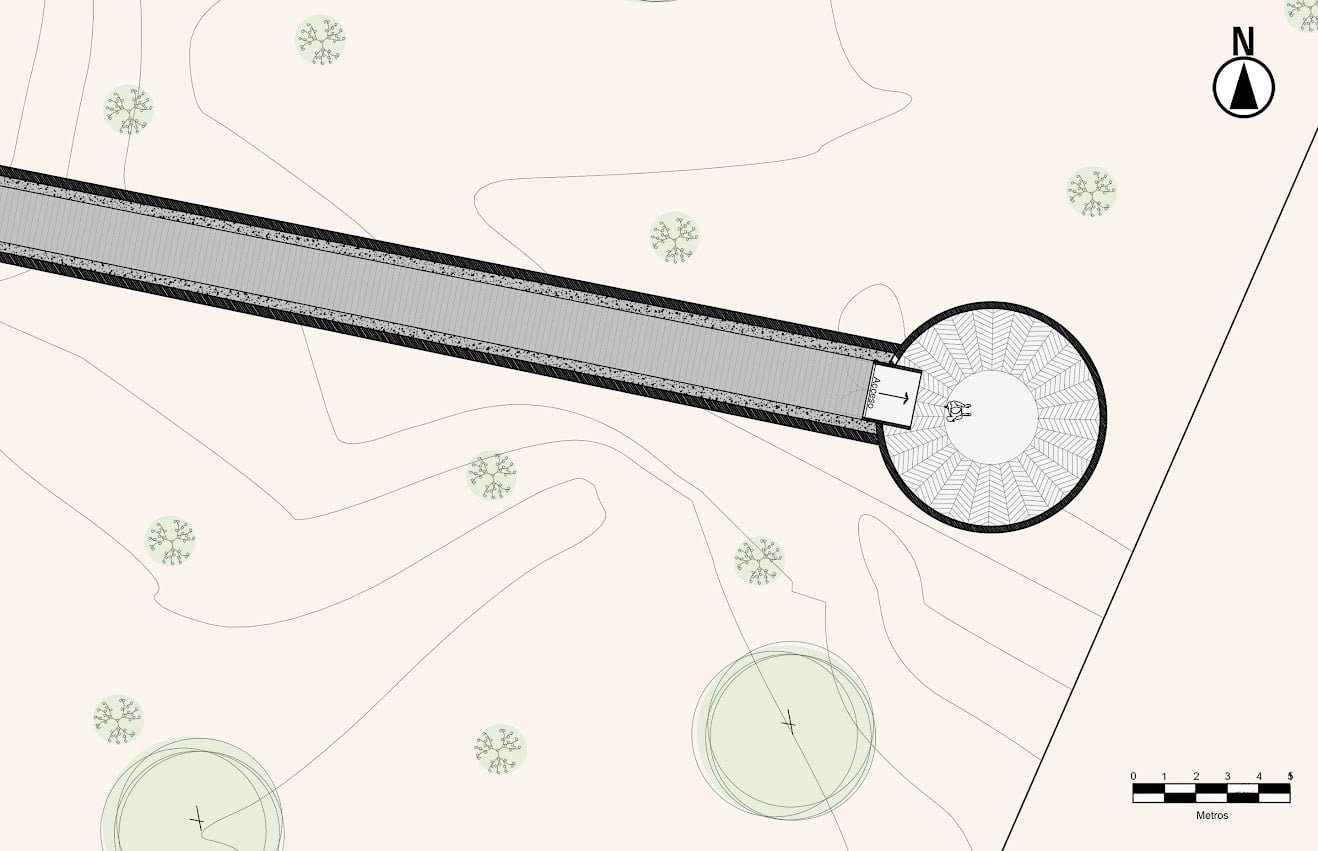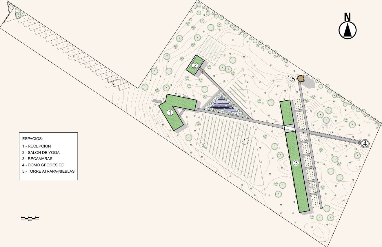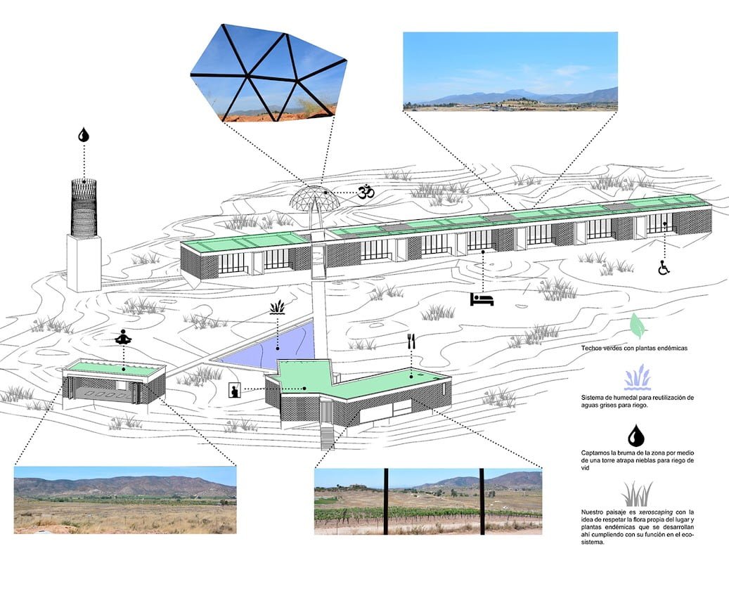 Queríamos romper con la tipología arquitectónica de un hotel que desarrolla sus servicios dentro de un mismo cuerpo volumétrico, después de analizar incesantemente el sitio y sus cualidades geográficas y naturales tomamos la decisión de proyectar su programa arquitectónico en distintas edificaciones interconectadas por medio de andadores que interactúan directamente con la naturaleza y son artífices de una invitación a vivir diferentes experiencias espirituales y arquitectónicas. Siendo estos andadores el resultado del análisis de los trazos del símbolo mantra OM, como parte de un diseño integral que busca el equilibrio entre arquitectura, naturaleza, mente y espíritu.