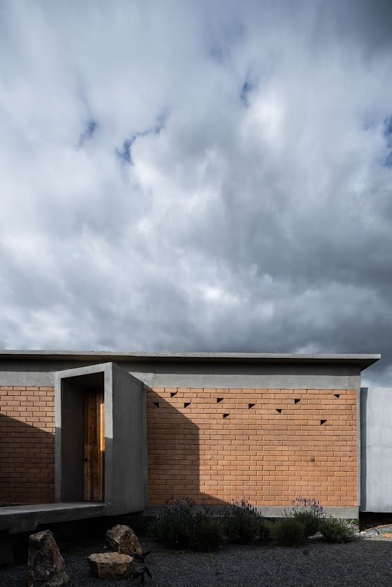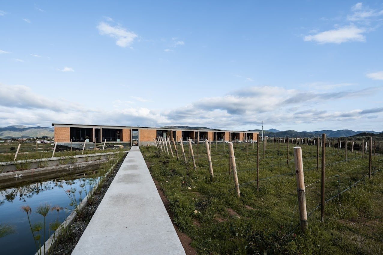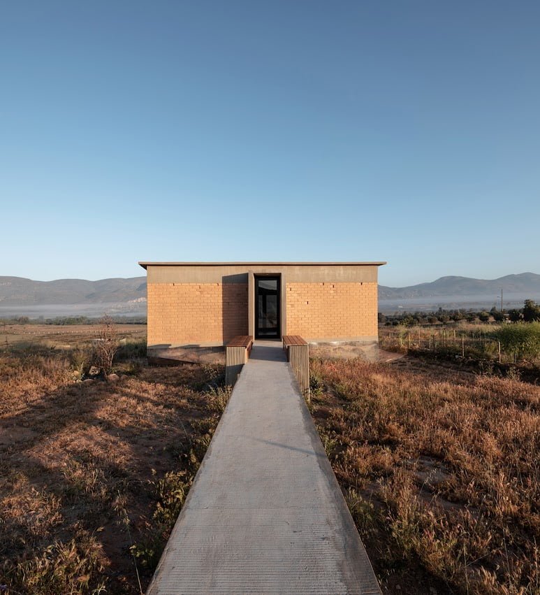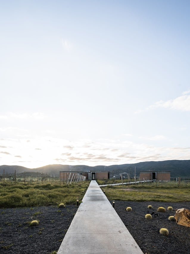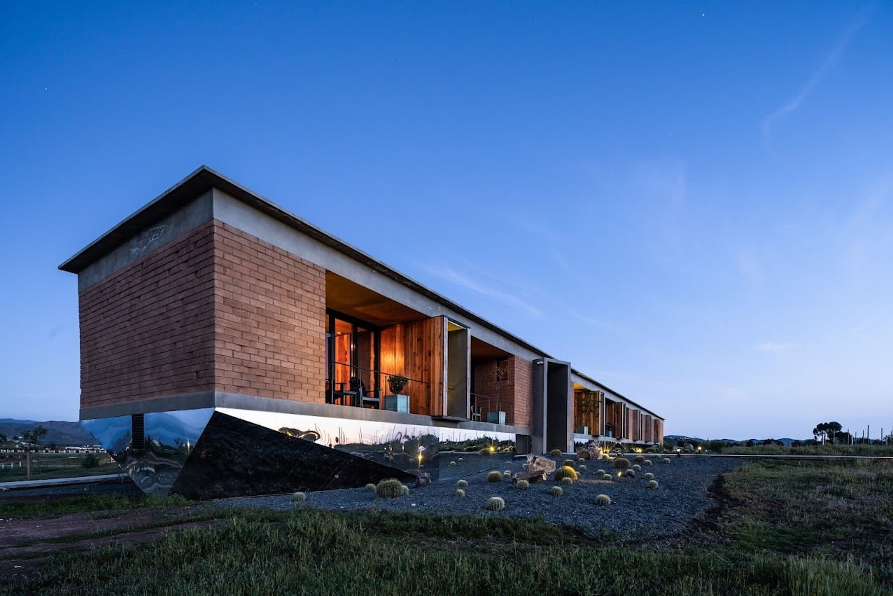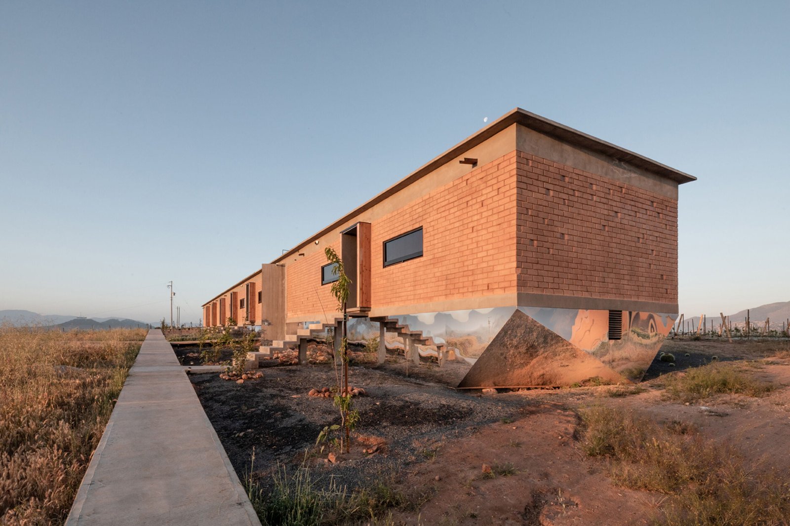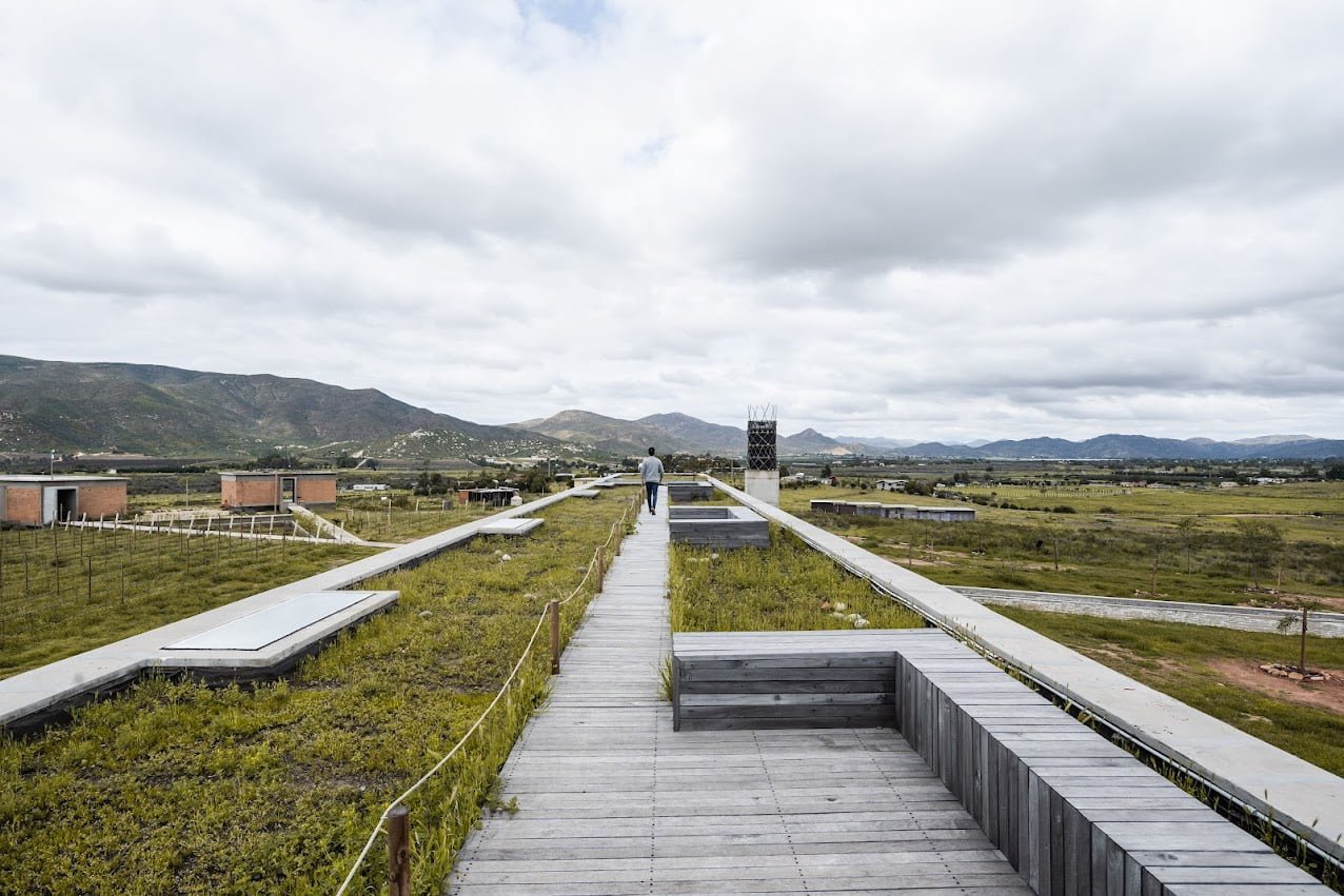El edificio principal es un volumen horizontal que se funde con su paisaje rodeado de cerros del valle y el cual cuenta con una orientación referenciada hacia una montaña majestuosa, llena de energía y la más sagrada para los kumiais una de las principales etnias de la región, este volumen alberga 8 recamaras individuales con baño , terraza, jardín y una recamara para personas con discapacidad que cuenta con su propia cocina, y rampa para la accesibilidad a todos los espacios.
