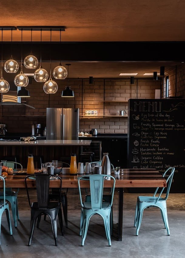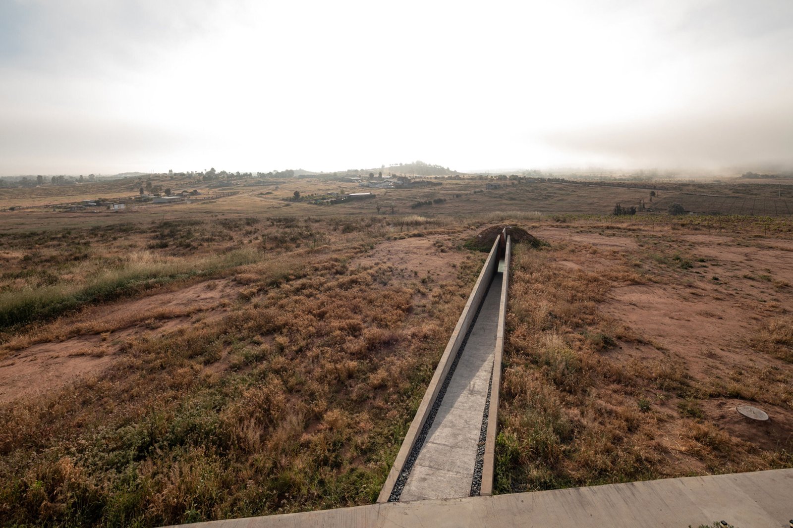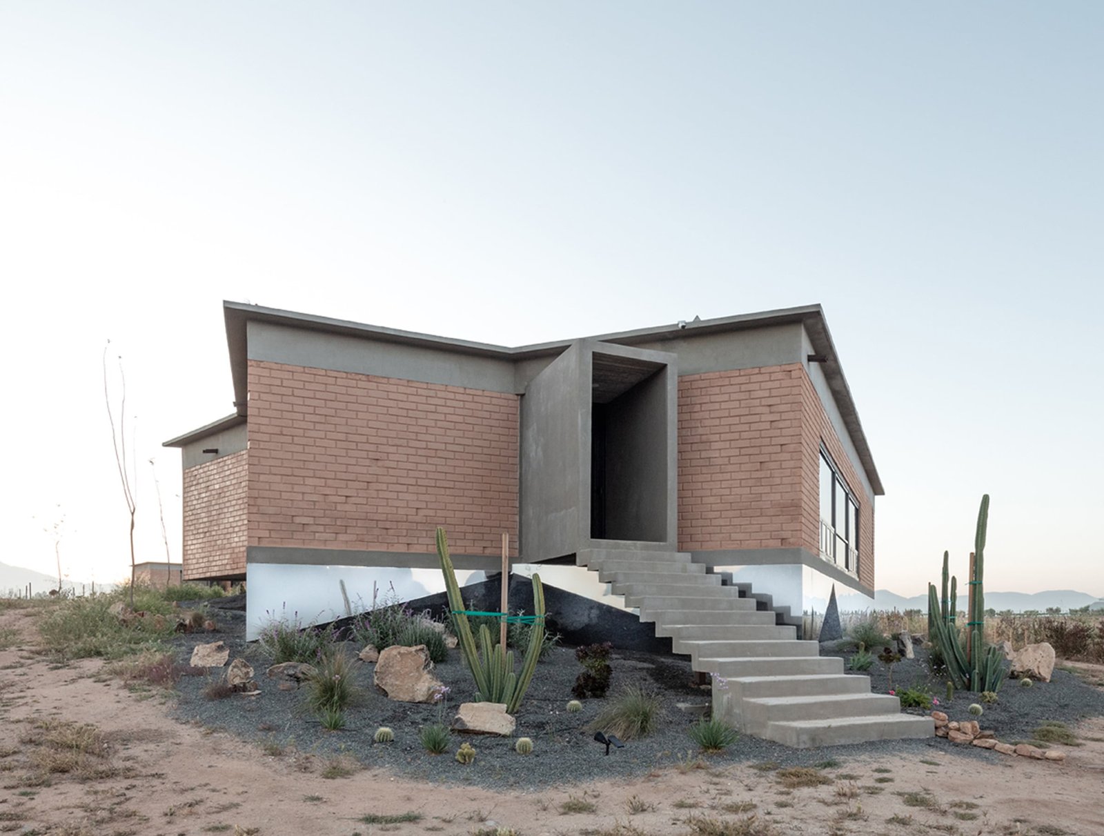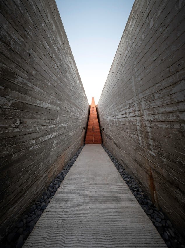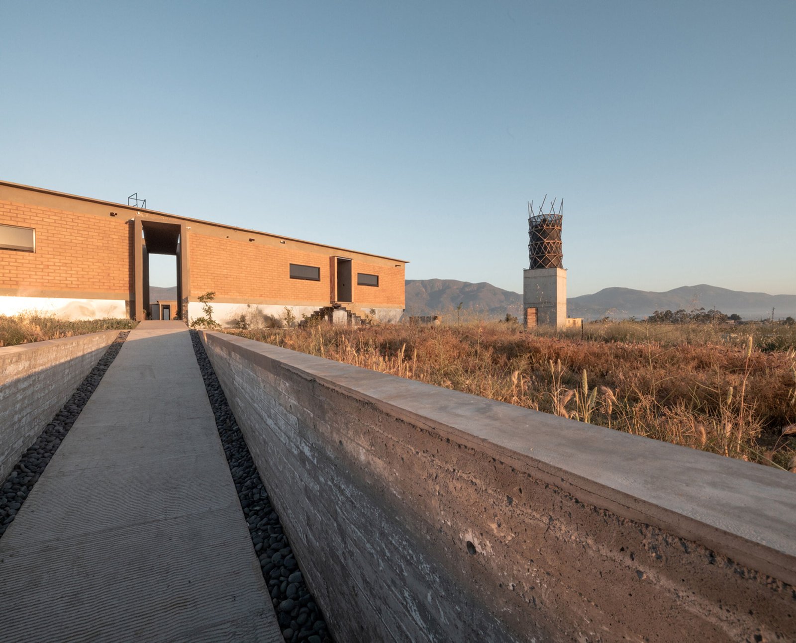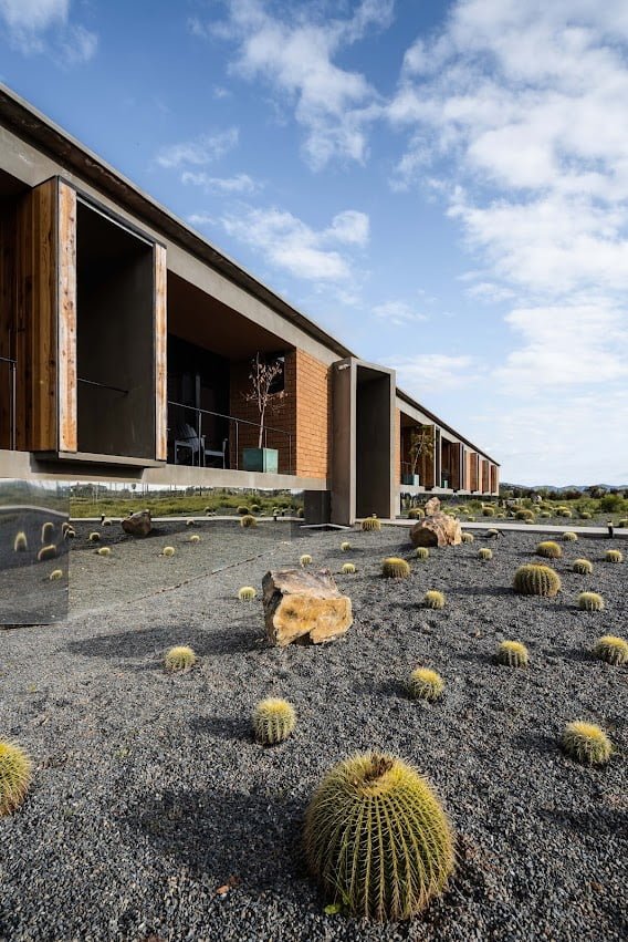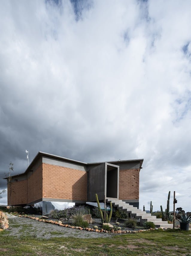 El edificio principal es un volumen horizontal que se funde con su paisaje rodeado de cerros del valle y el cual cuenta con una orientación referenciada hacia una montaña majestuosa, llena de energía y la más sagrada para los kumiais una de las principales etnias de la región, este volumen alberga 8 recamaras individuales con baño , terraza, jardín y una recamara para personas con discapacidad que cuenta con su propia cocina, y rampa para la accesibilidad a todos los espacios.