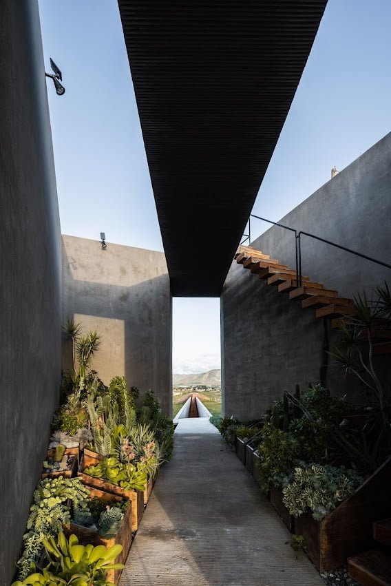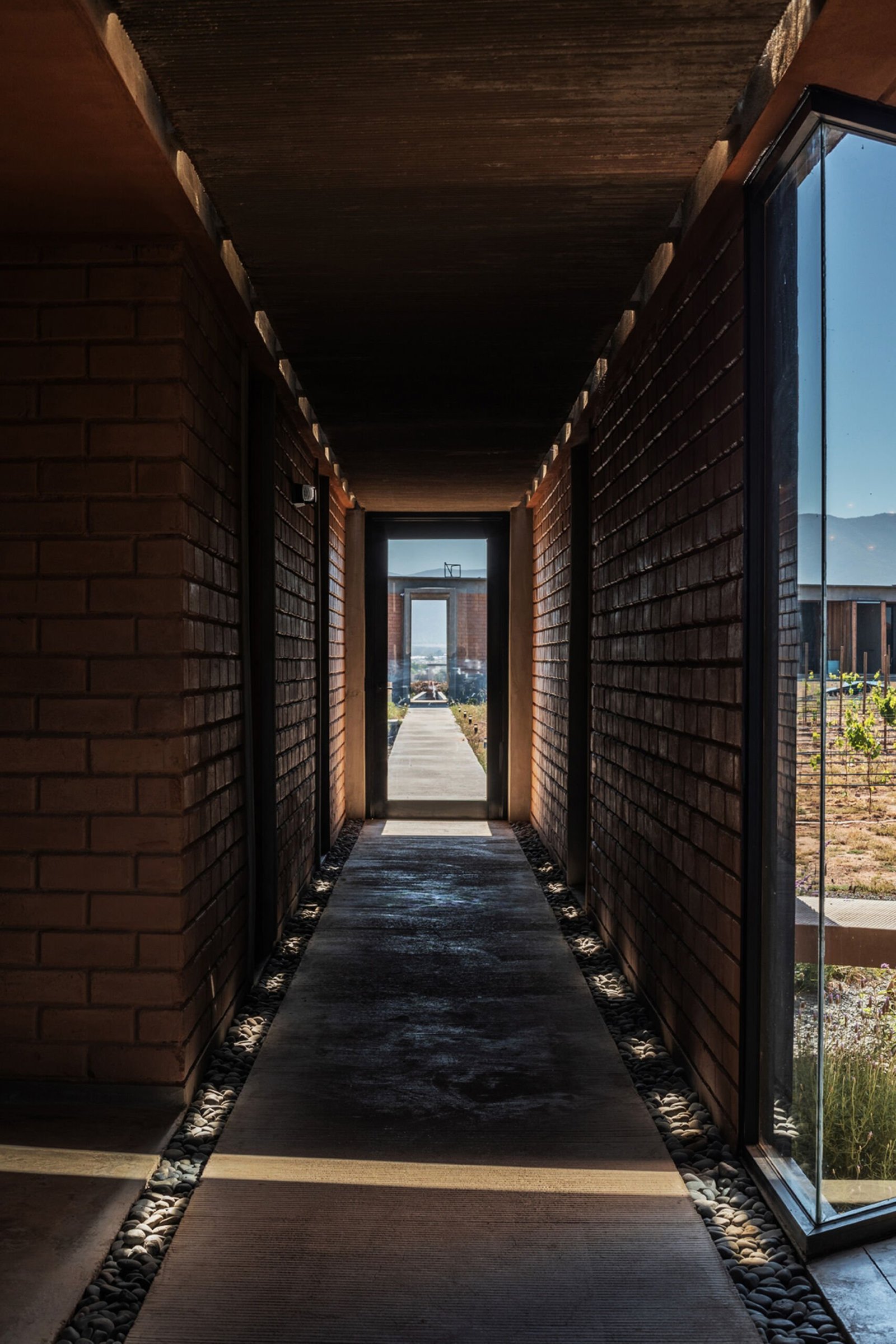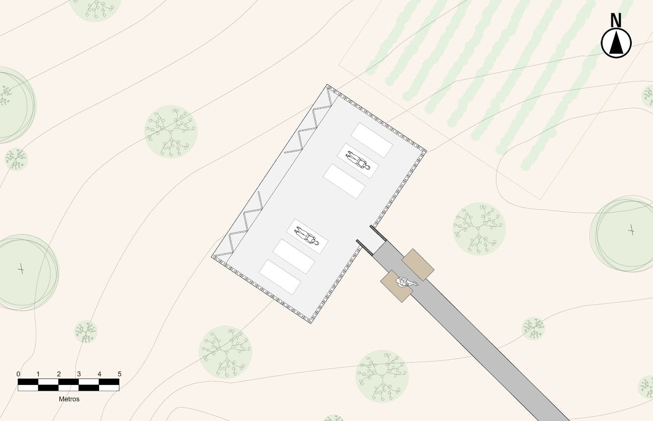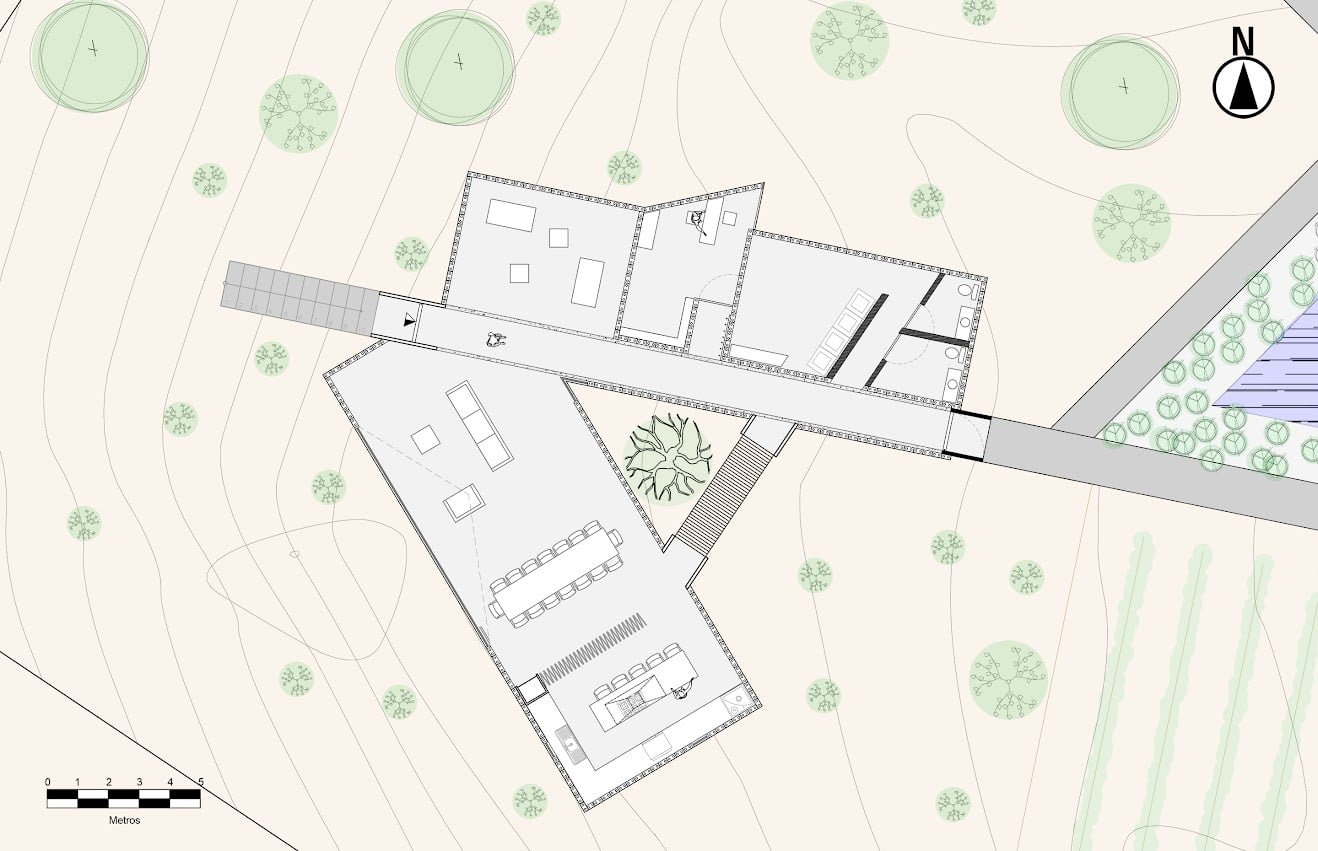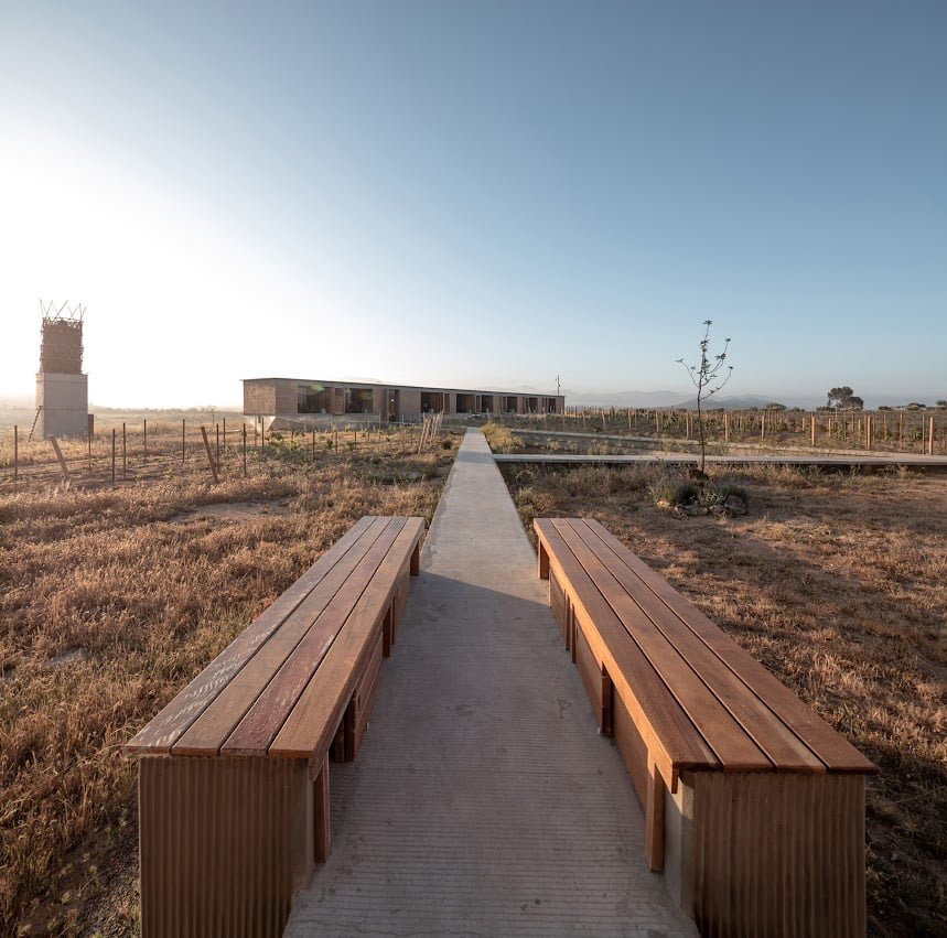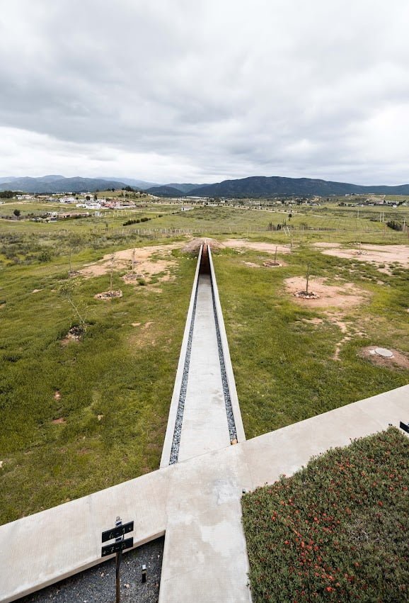 El proyecto cuenta con un programa arquitectónico que comprende 5 edificaciones distribuidas en la propiedad, un volumen en “V” es el acceso principal al conjunto, edificio que capta la luz cenital y enmarca los paisajes rodeados de vid del entorno y es el punto de inicio del recorrido central del proyecto.