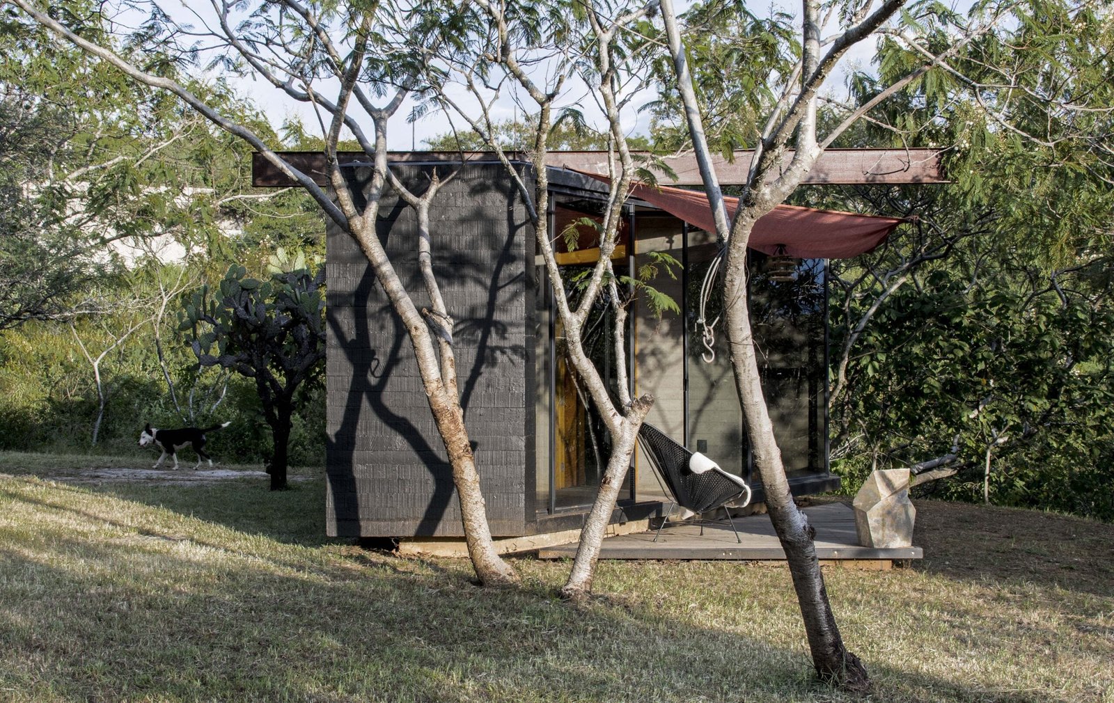 El bungalow se pensó como un refugio temporal, con lo esencial para estancias cortas. Un espacio particular mínimo, para compartir en pareja o tomarse un respiro en compañía de sí mismo. Es un pequeño elemento negro que descansa en una terraza natural con una vista panorámica impresionante del valle y la ciudad, se sitúa en la parte media de la propiedad, en una área rodeada de árboles y un espacio libre que permitió desplantarlo sin alterar nada de lo existente. Vistas, luz, naturaleza y tranquilidad son la razón de ser del proyecto.