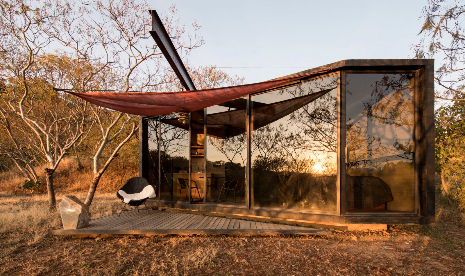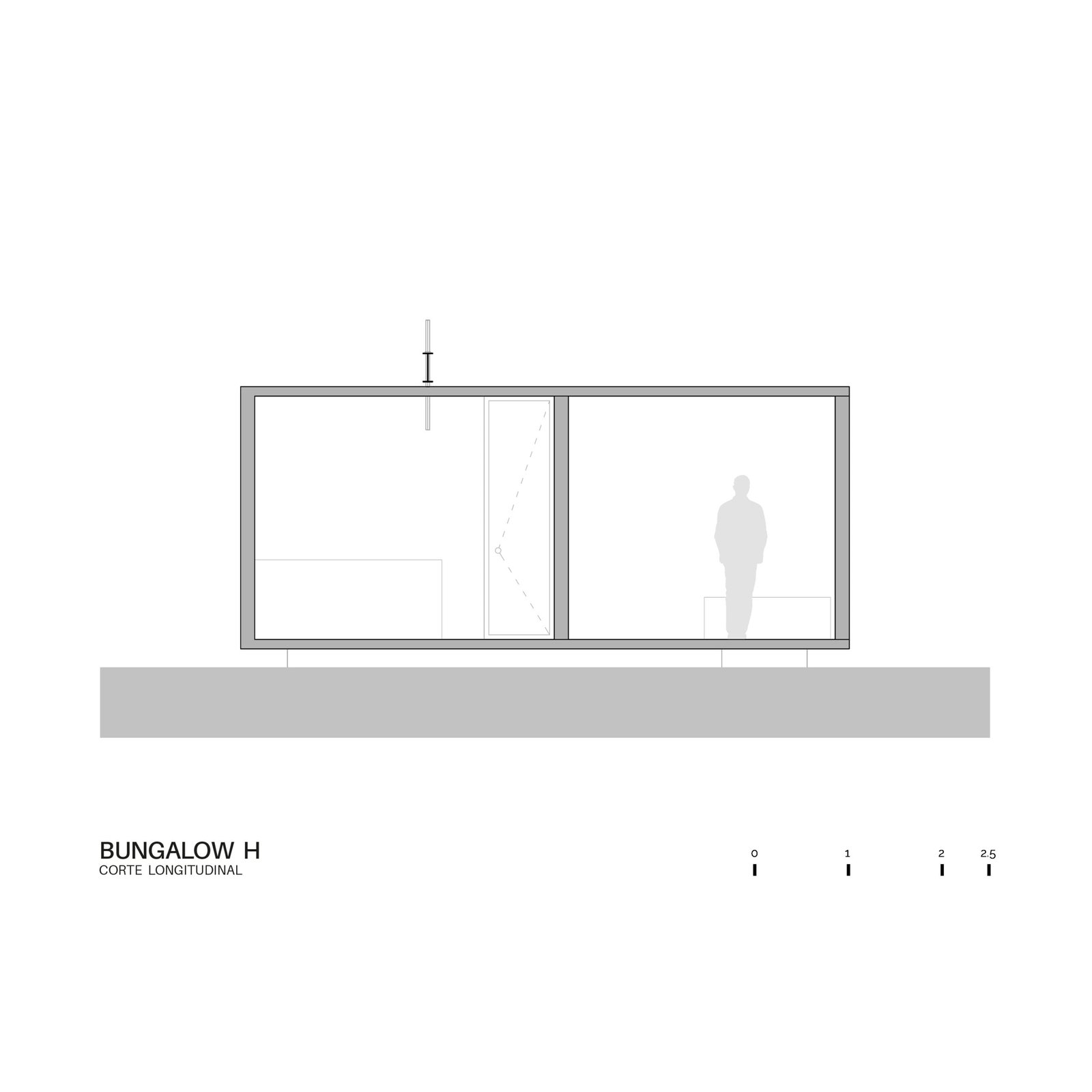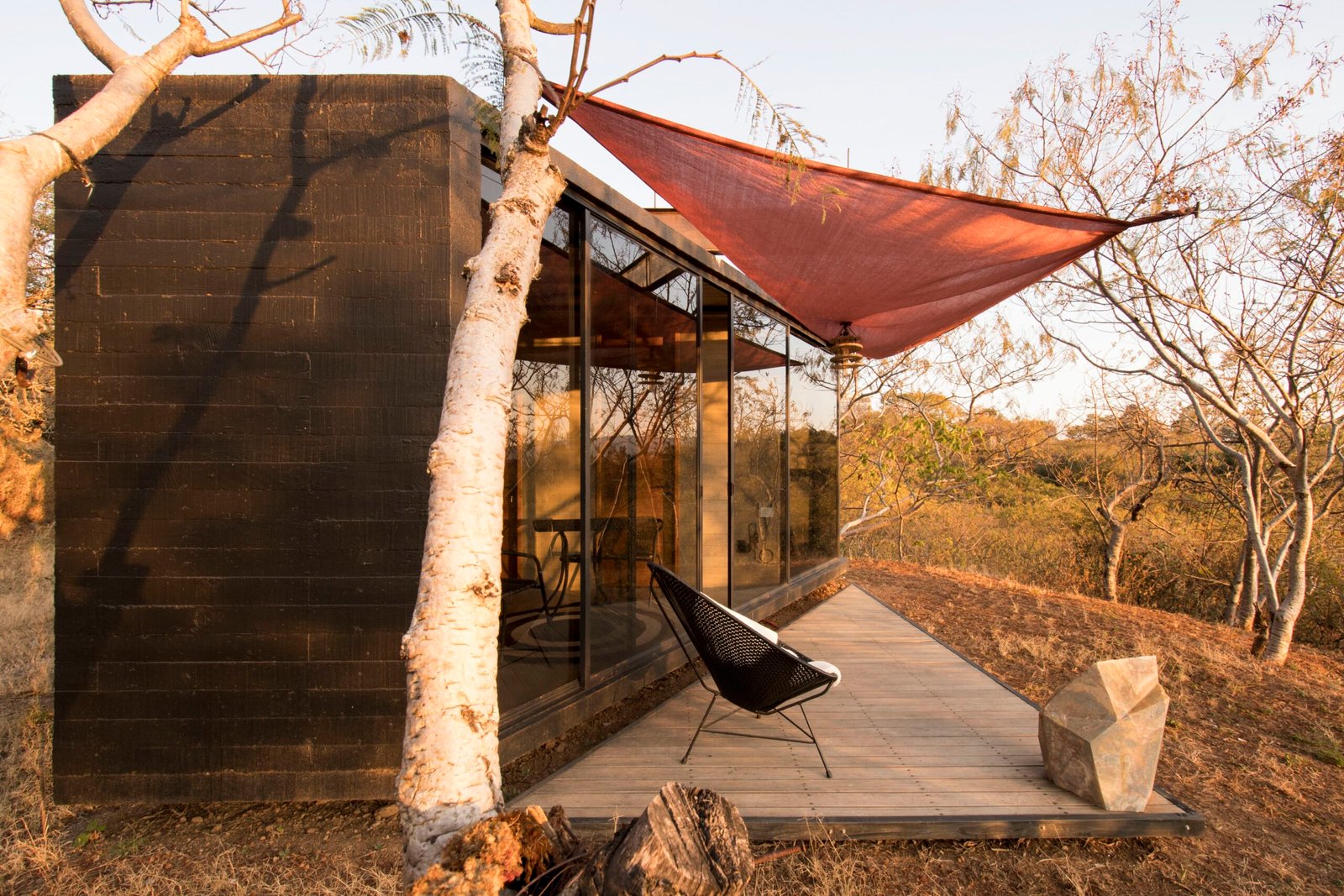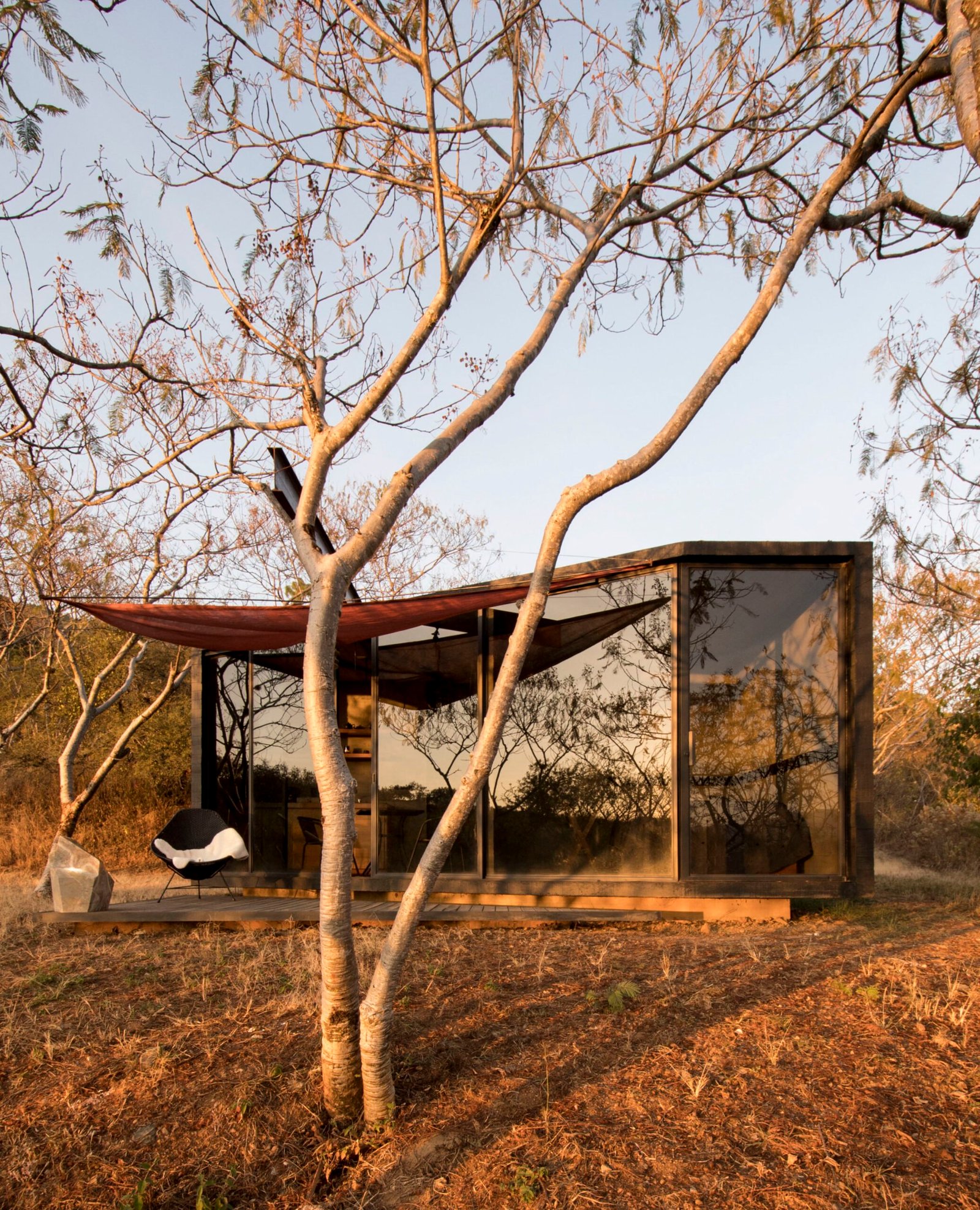 La caja se corta en diagonal en la parte frontal en la búsqueda de la vista al valle y la ciudad, definiendo la forma final. Por su condición de espacio temporal, se prioriza la zona de estar exterior y el de la habitación. El objeto es una pieza sencilla que corresponde directamente a una de las premisas con que trabajamos, donde un pilar importante es la búsqueda de elementos claros, fáciles de entender, fuertes, que adquieren carácter a través de un buen uso de los materiales y los sistemas constructivos, así como las capacidades técnicas de los constructores. Buscamos crear geometrías concretas para contextos específicos, donde la estructura sea arquitectura.