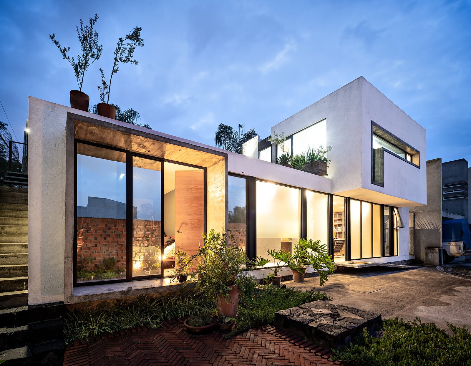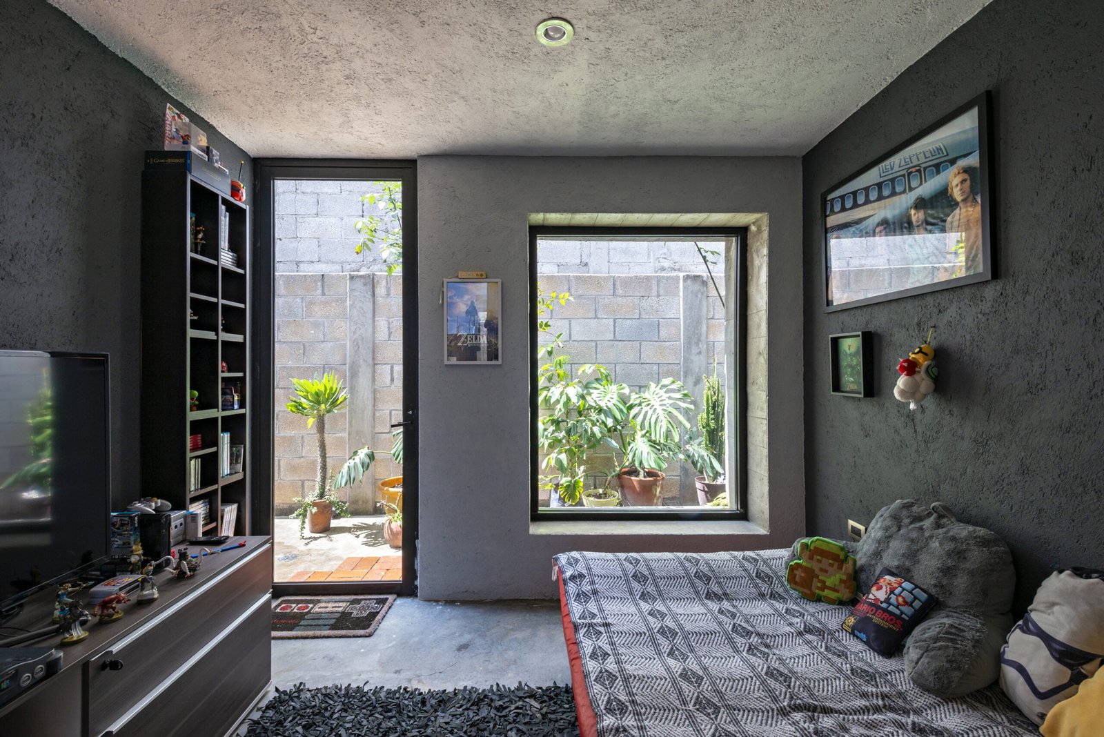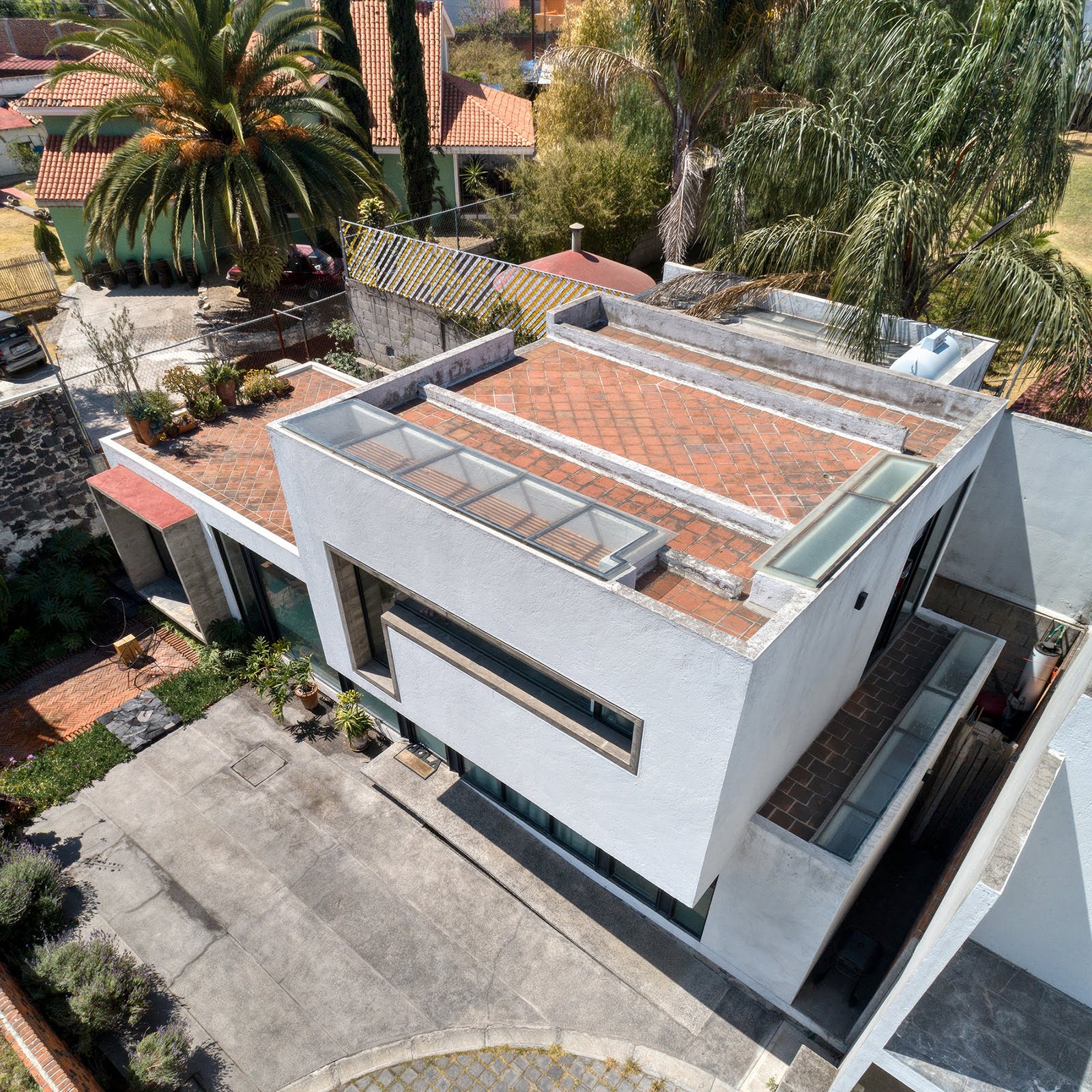 Dos cajas intersectadas como esquema compositivo resuelven las necesidades planteadas; un programa completo y habitable en una sola planta, y otro nivel de una habitación con acceso independiente, y en una próxima etapa consolidar la conexión directa entre estas cajas desde el interior. Que la vivienda se habitará por 2 o en 2 momentos distintos o para 2 usos distintos, pláticas iniciales con el patrono del encargo. Estas “2” cajas sueltas e independientes de las colindancias, que permitan el paso del viento y la luz para todos los espacios, garantizando una habitabilidad y salud de la vivienda.