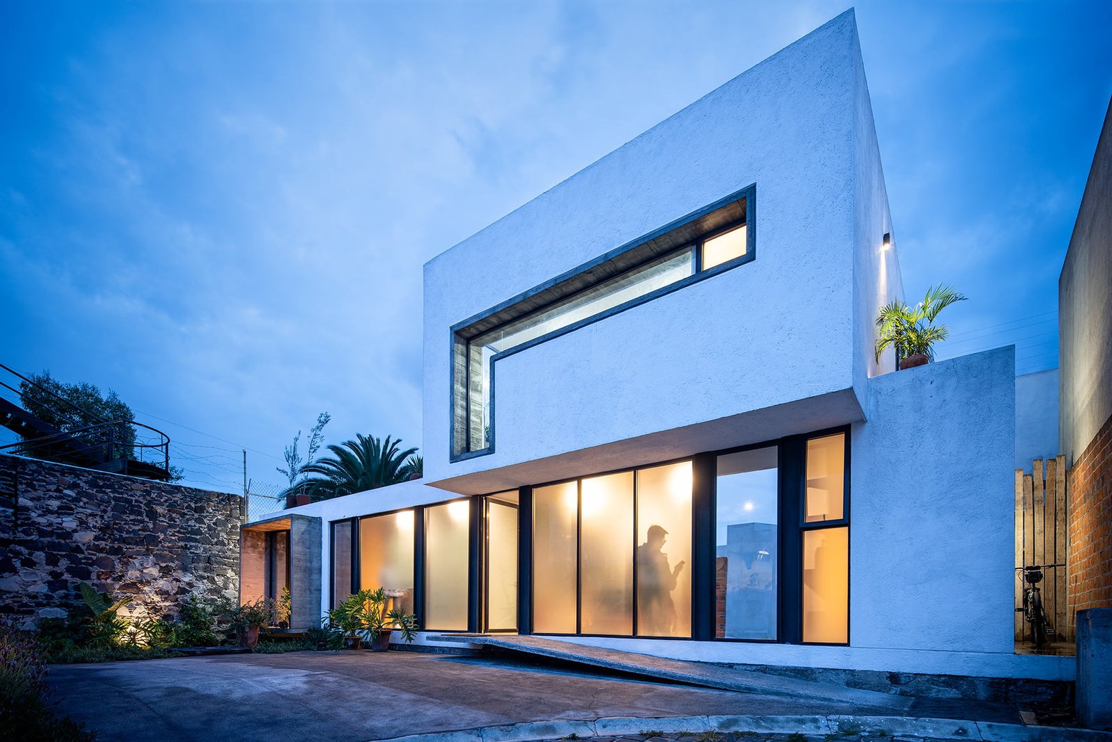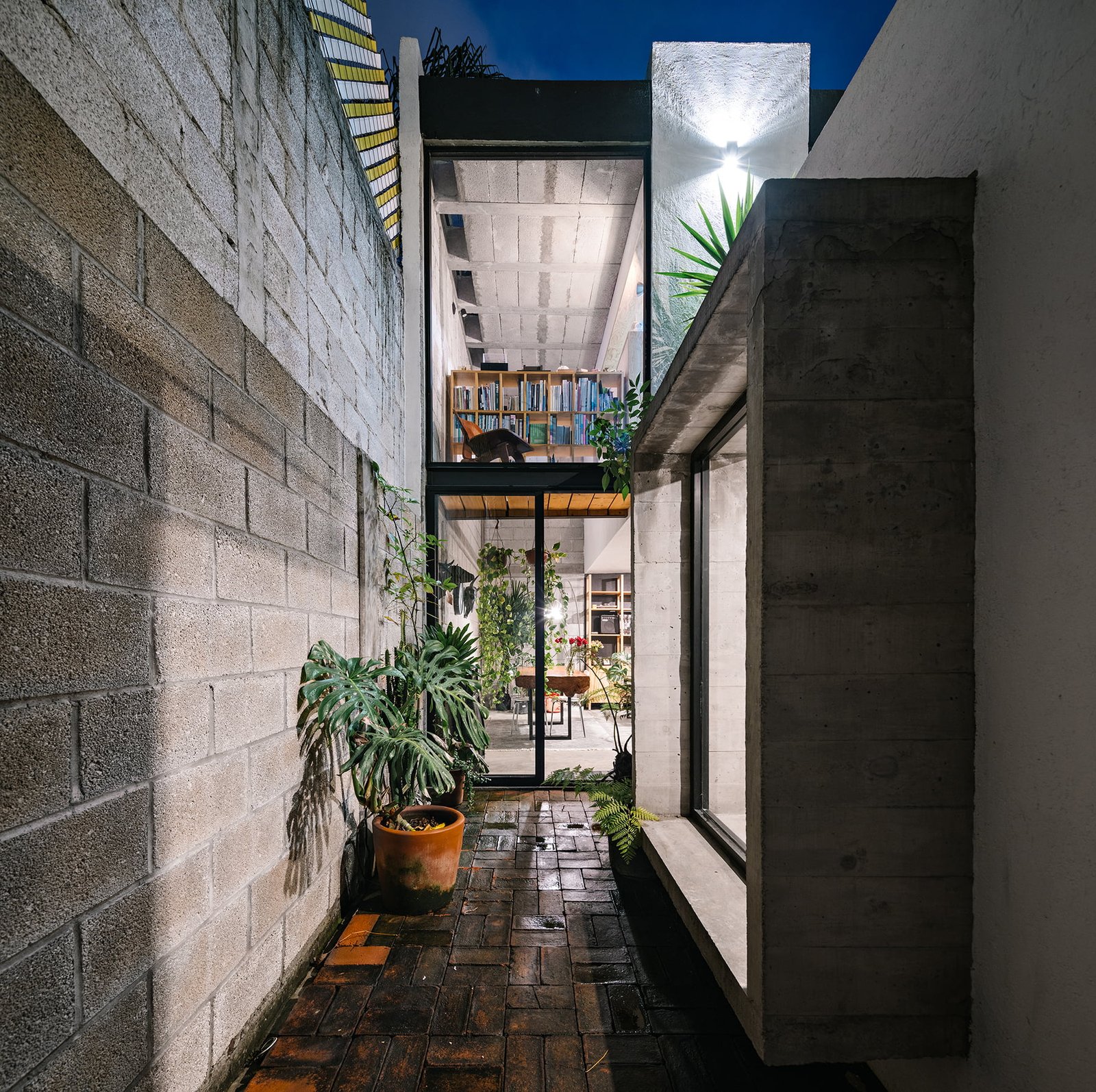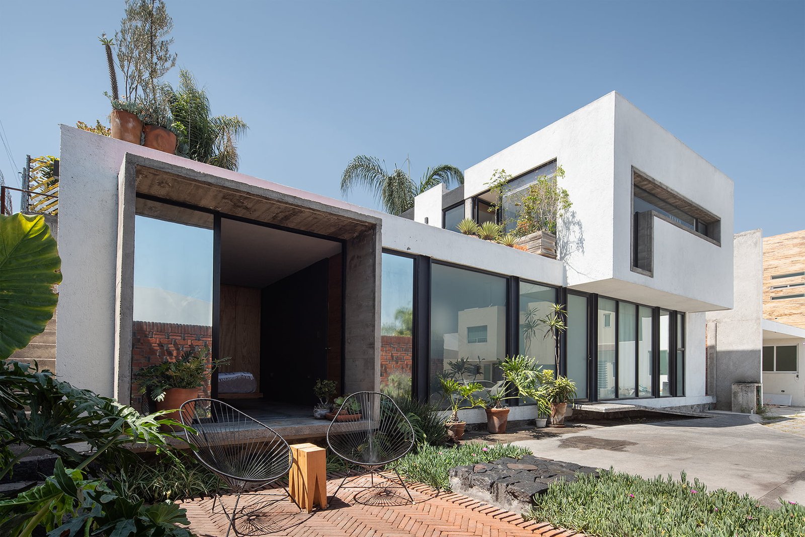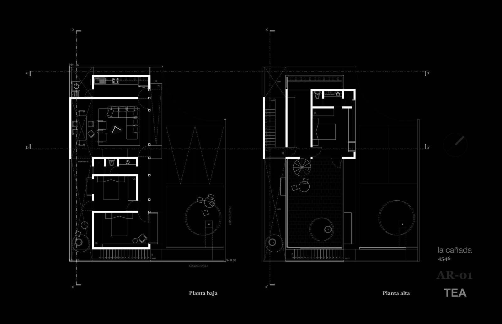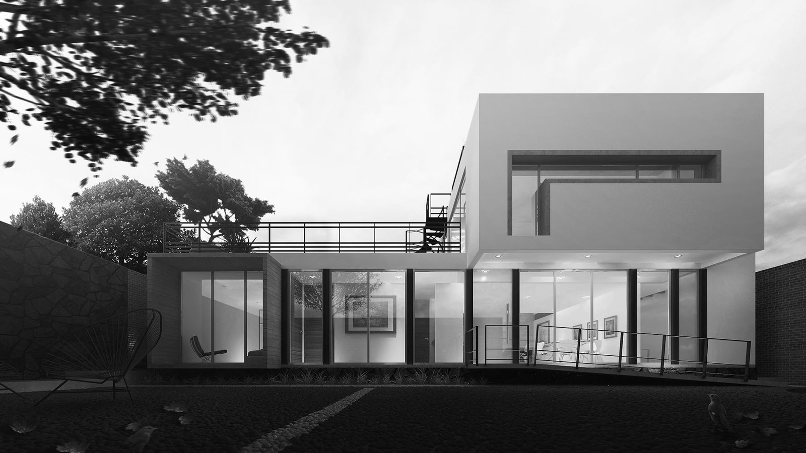 La planta baja, resuelve un jardín como tapete de bienvenida y presentar la primera escena de esta secuencia espacial, disolver la condición de cochera mediante una plaza dura acabada en concreto lavado ordena la rampa de acceso para después subir medio metro y entrar por esta capa de cristal, aluminio y perfiles ipr presentando la sala, comedor a doble altura, baño completo para dos habitaciones y cocina con acceso a un patio de servicio. En la planta alta, una habitación principal con baño completo y una terraza acabada en cuadrado de barro.