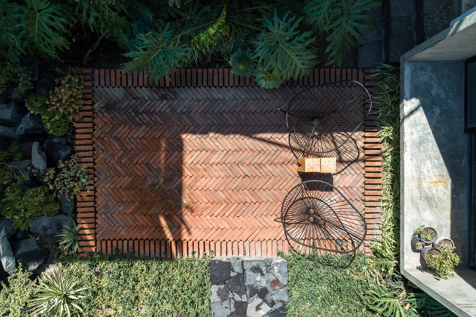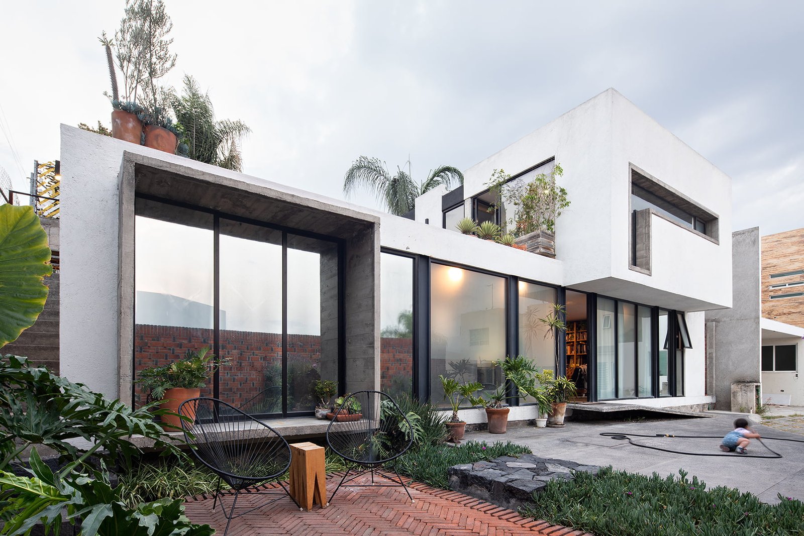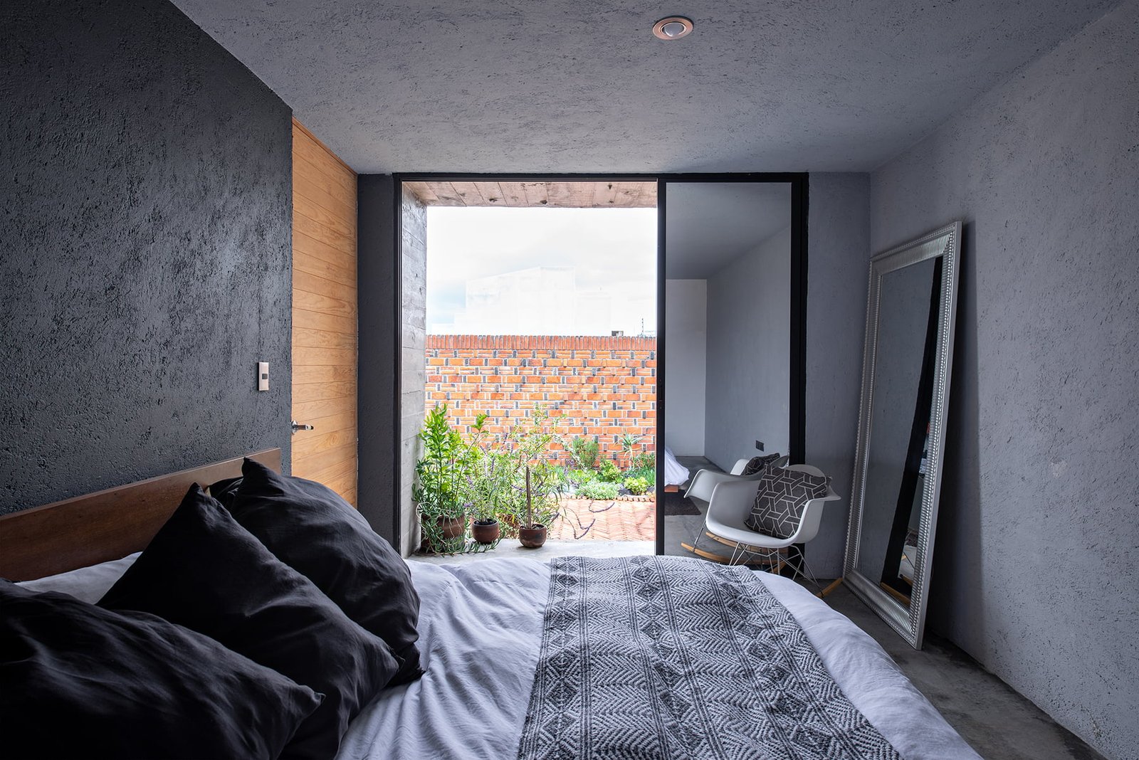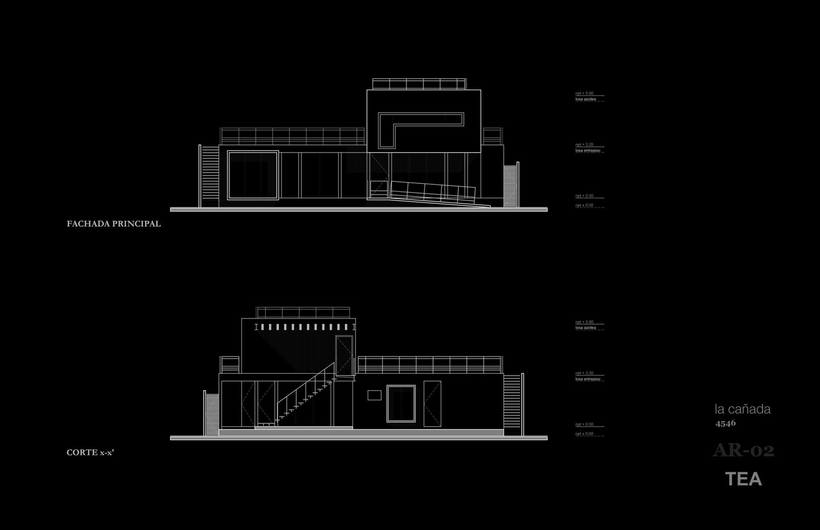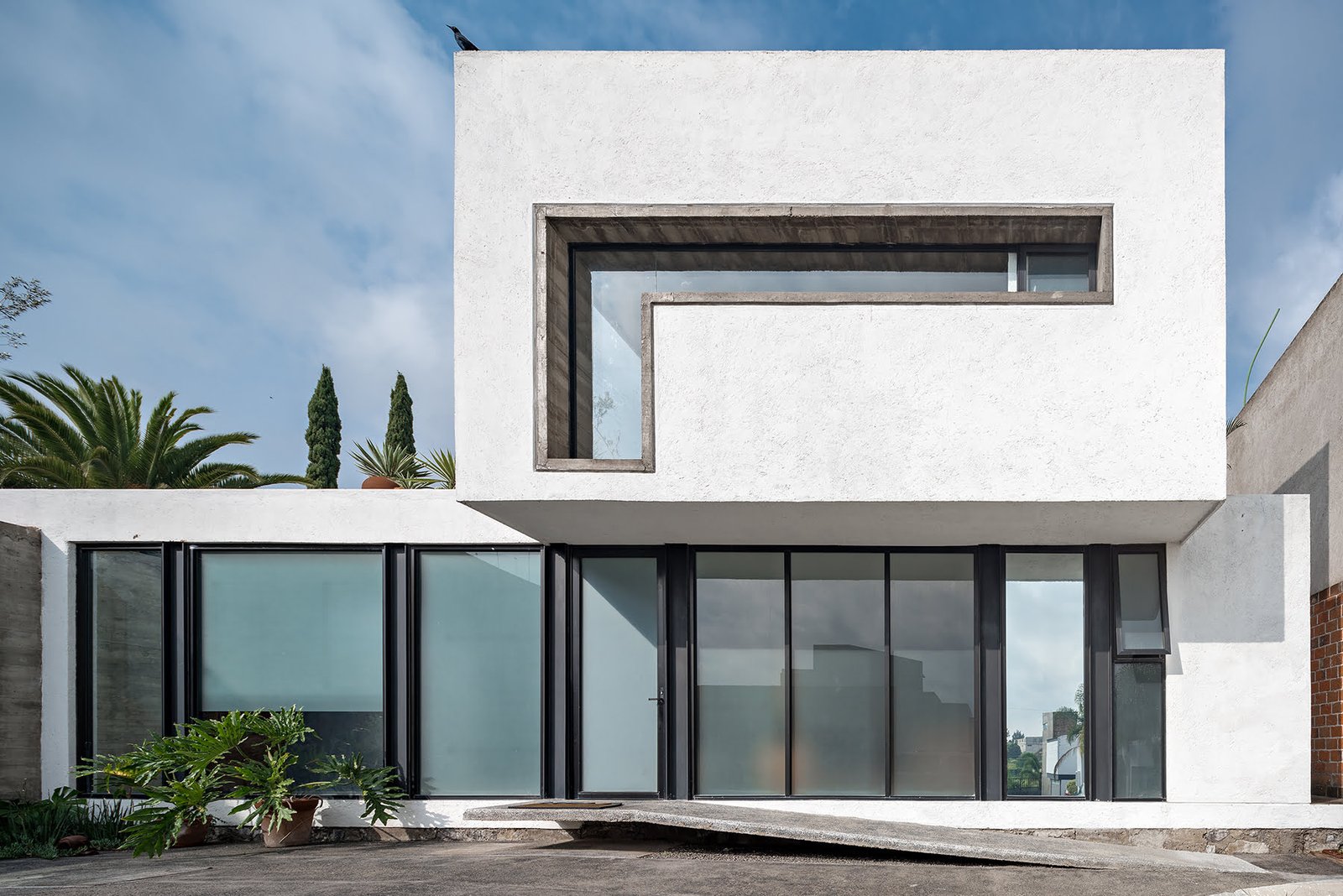 La planta baja, resuelve un jardín como tapete de bienvenida y presentar la primera escena de esta secuencia espacial, disolver la condición de cochera mediante una plaza dura acabada en concreto lavado ordena la rampa de acceso para después subir medio metro y entrar por esta capa de cristal, aluminio y perfiles ipr presentando la sala, comedor a doble altura, baño completo para dos habitaciones y cocina con acceso a un patio de servicio. En la planta alta, una habitación principal con baño completo y una terraza acabada en cuadrado de barro.