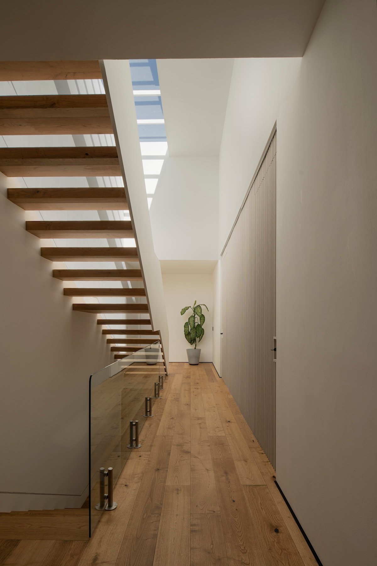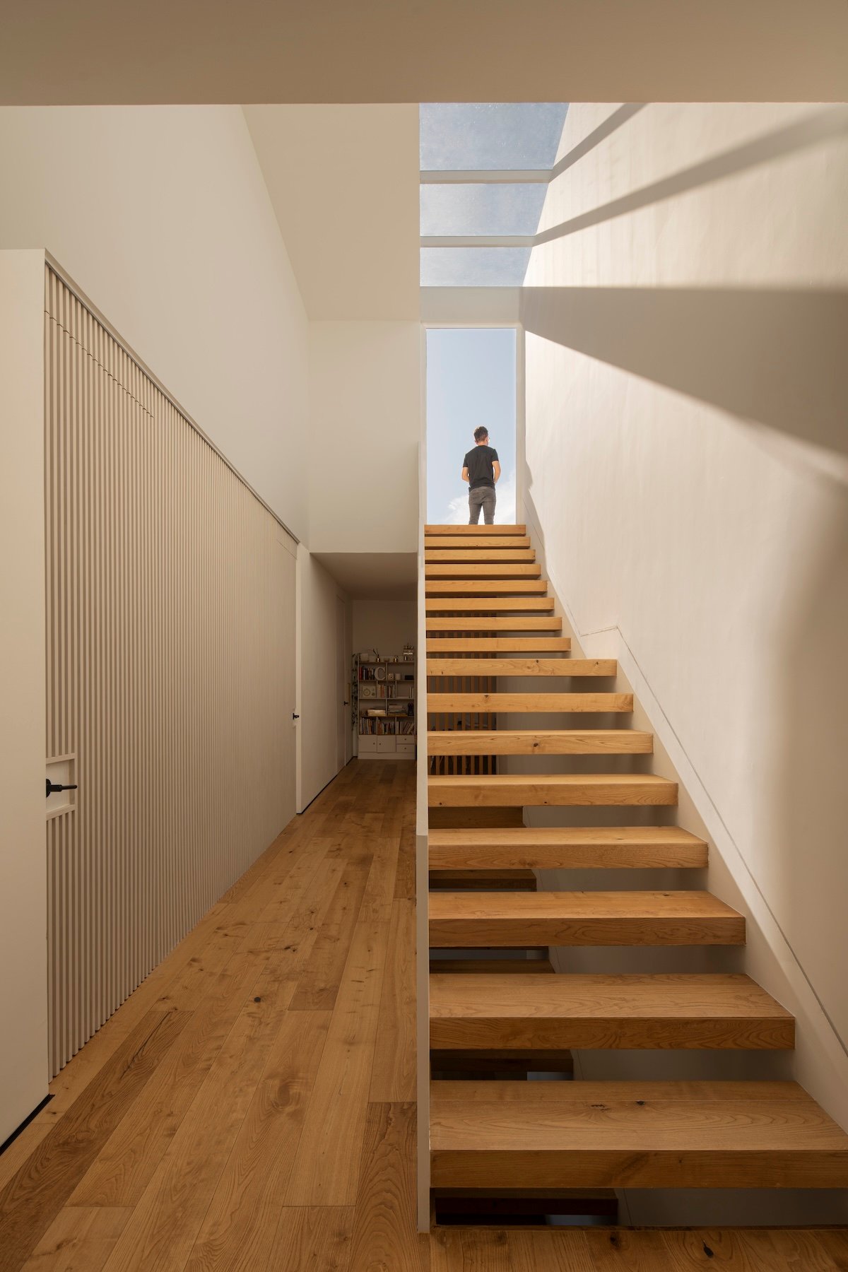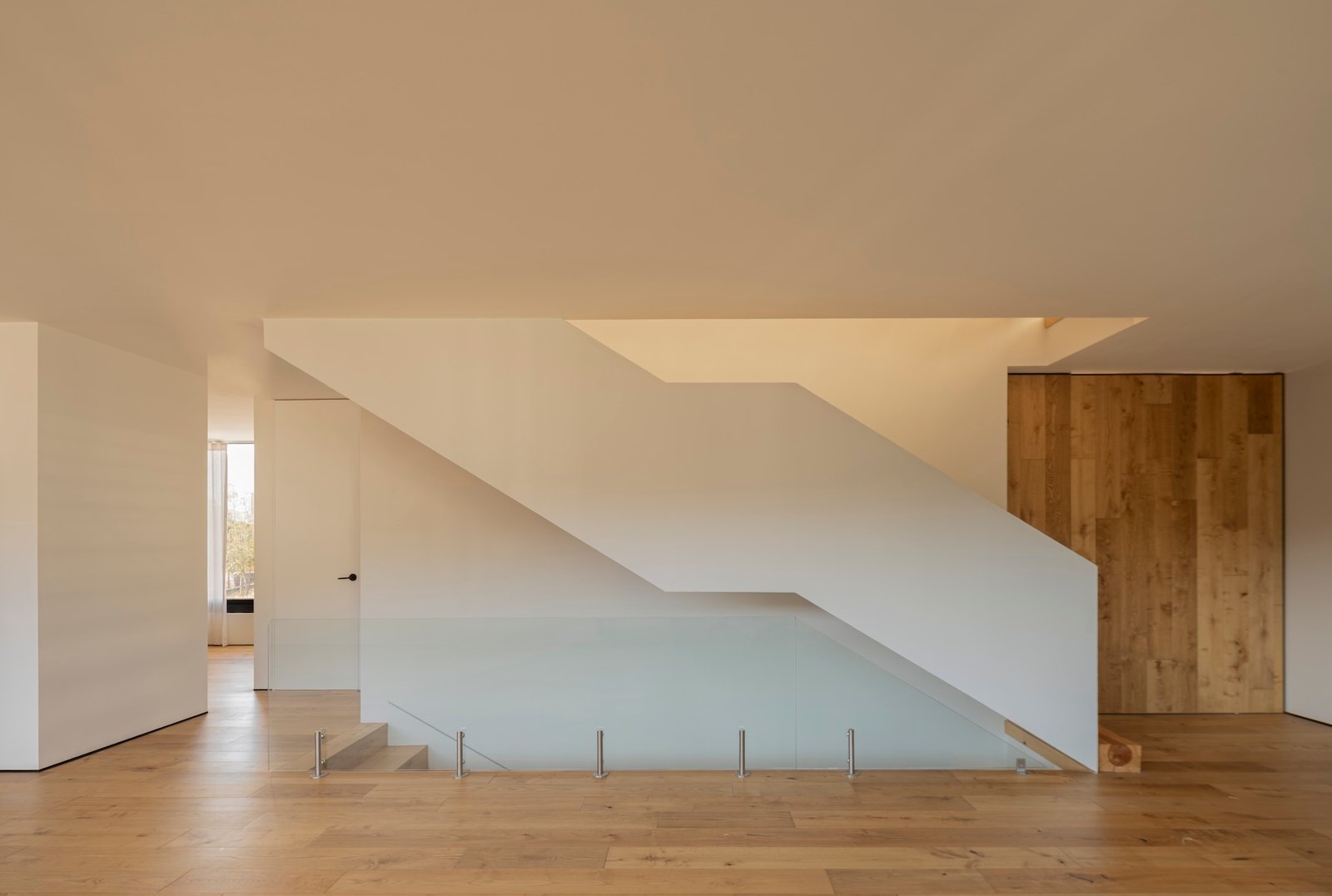 La escalera, como pieza protagónica y articuladora del proyecto, se concibe como un trazo ligero y esbelto: un barandal minimalista de herrería acompaña su recorrido, mientras los escalones, forrados en madera de ingeniería, mantienen continuidad en el material de pisos para reforzar la unidad espacial.