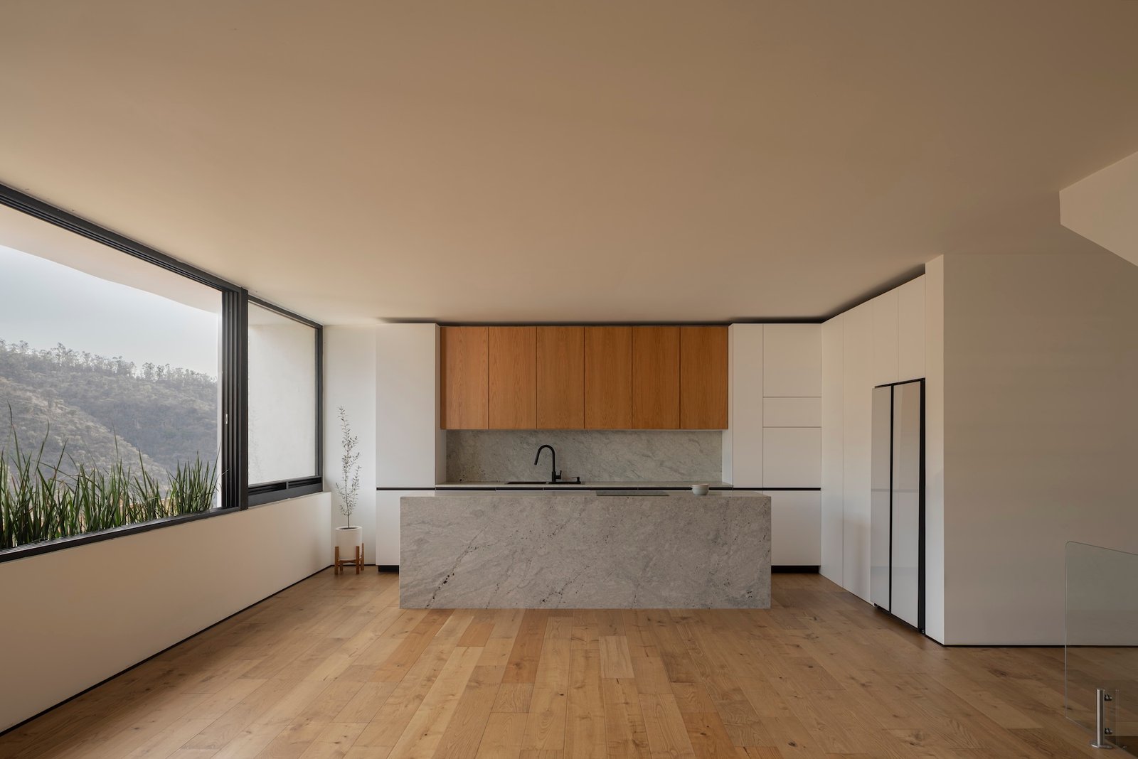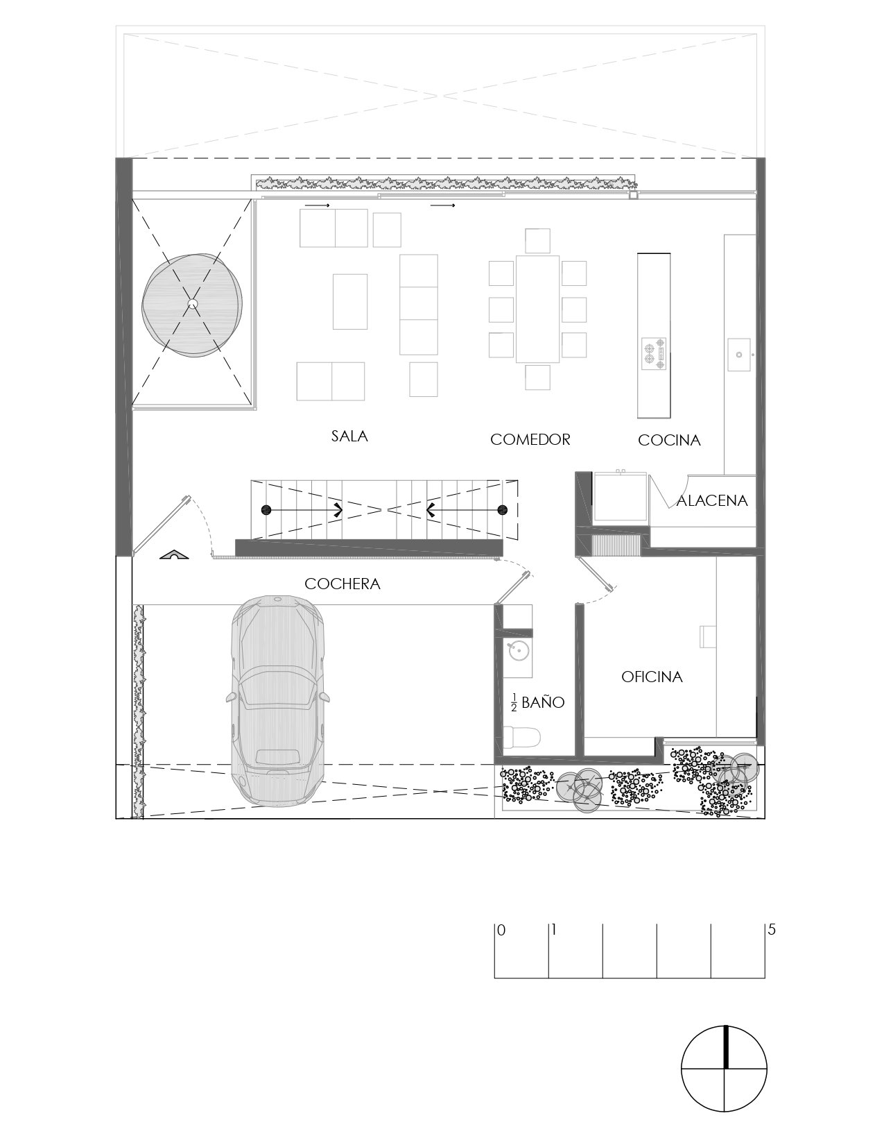 El acceso principal se da a nivel de planta baja, donde un árbol Arrayán actúa como remate visual, visible desde un nivel inferior en un espacio a doble altura. En este mismo nivel se desarrolla un área social de concepto abierto que integra sala, comedor y cocina en un solo ambiente, promoviendo la convivencia familiar diaria. También en esta planta se ubica una oficina con grandes ventanales que ofrecen iluminación natural privilegiada.