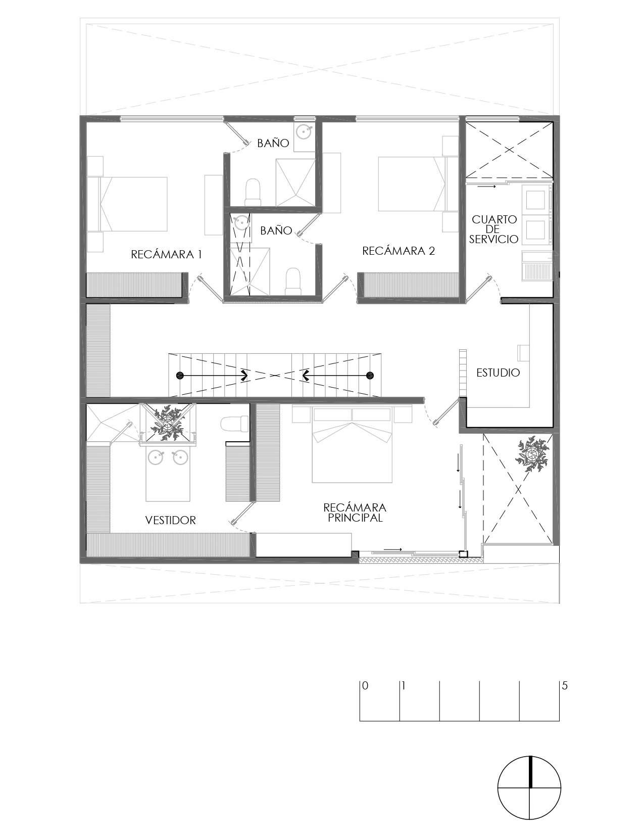 Desarrollada en un terreno regular de 12 metros de frente por 16 metros de fondo, con una pendiente descendente de 4 metros y orientación de fachada norte, el proyecto plantea una estrategia basada en grandes ventanales al sur, que permiten la entrada abundante de luz natural y generan una atmósfera cálida en el interior. El eje vertebral de la circulación es una escalera recta que organiza la distribución de toda la vivienda, convirtiéndose en un elemento articulador de los espacios.