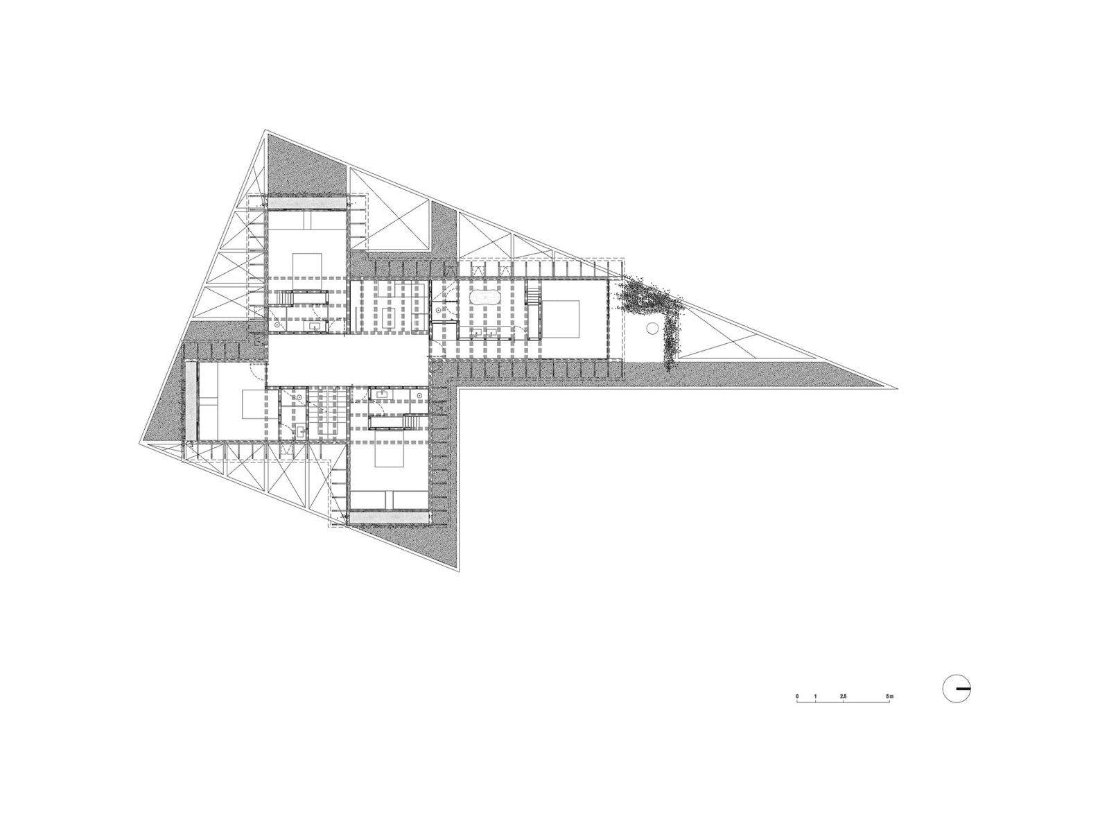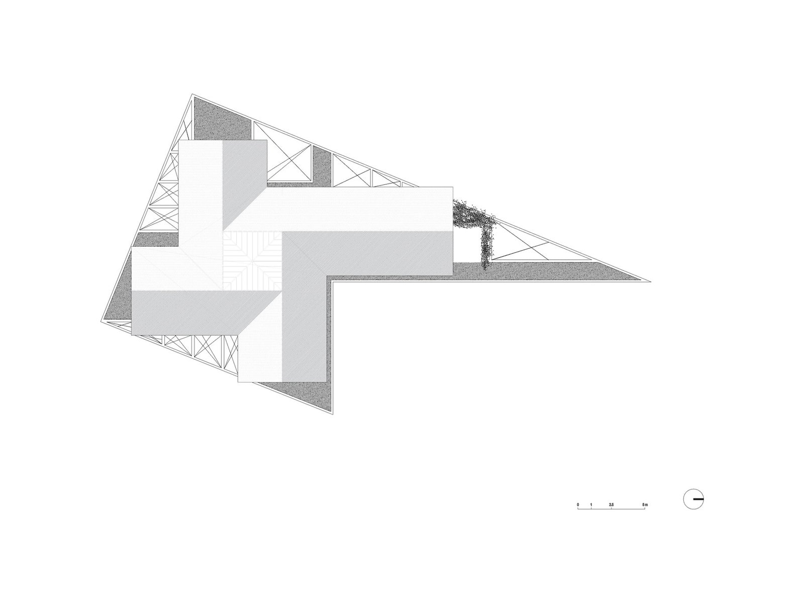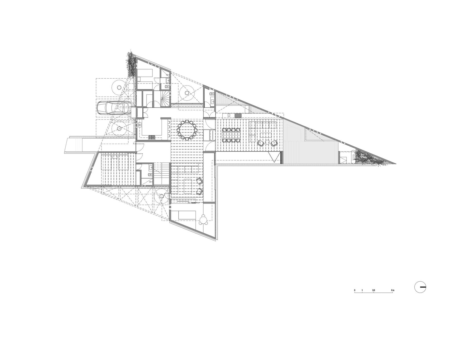 En lugar de disponerse perpendicular al acceso, todo el desplante de la casa gira para buscar las mejores orientaciones y las mejores y más amplias vistas hacia el campo deportivo. Al girar los límites y los muros perimetrales de la casa, establecen relaciones alternativas hacia el perímetro; En lugar de una barda infranqueable, se abren espacios ajardinados diagonales, que corrigen la relación de borde convencional entre el terreno y la casa. El mismo giro, permite articular los espacios cerrados y semicerrados, siempre en relación con el espacio abierto (tanto el jardín, como el campo de golf)