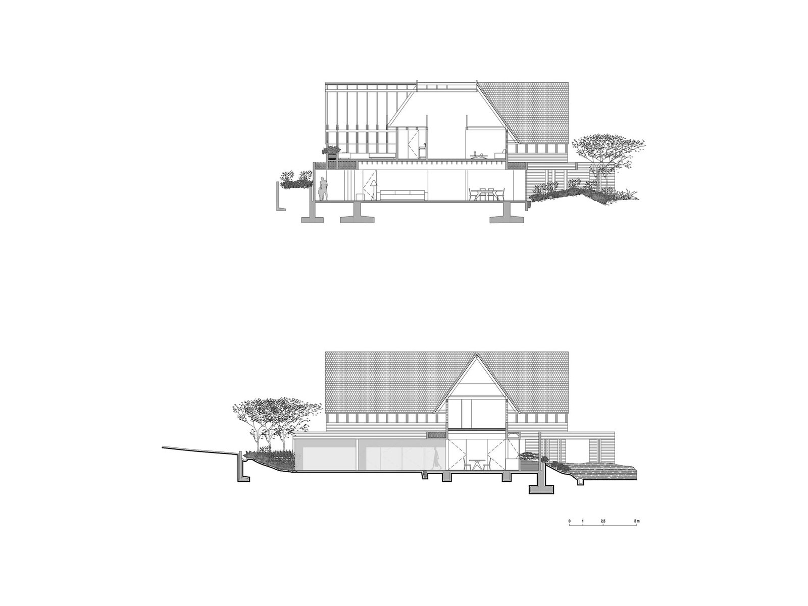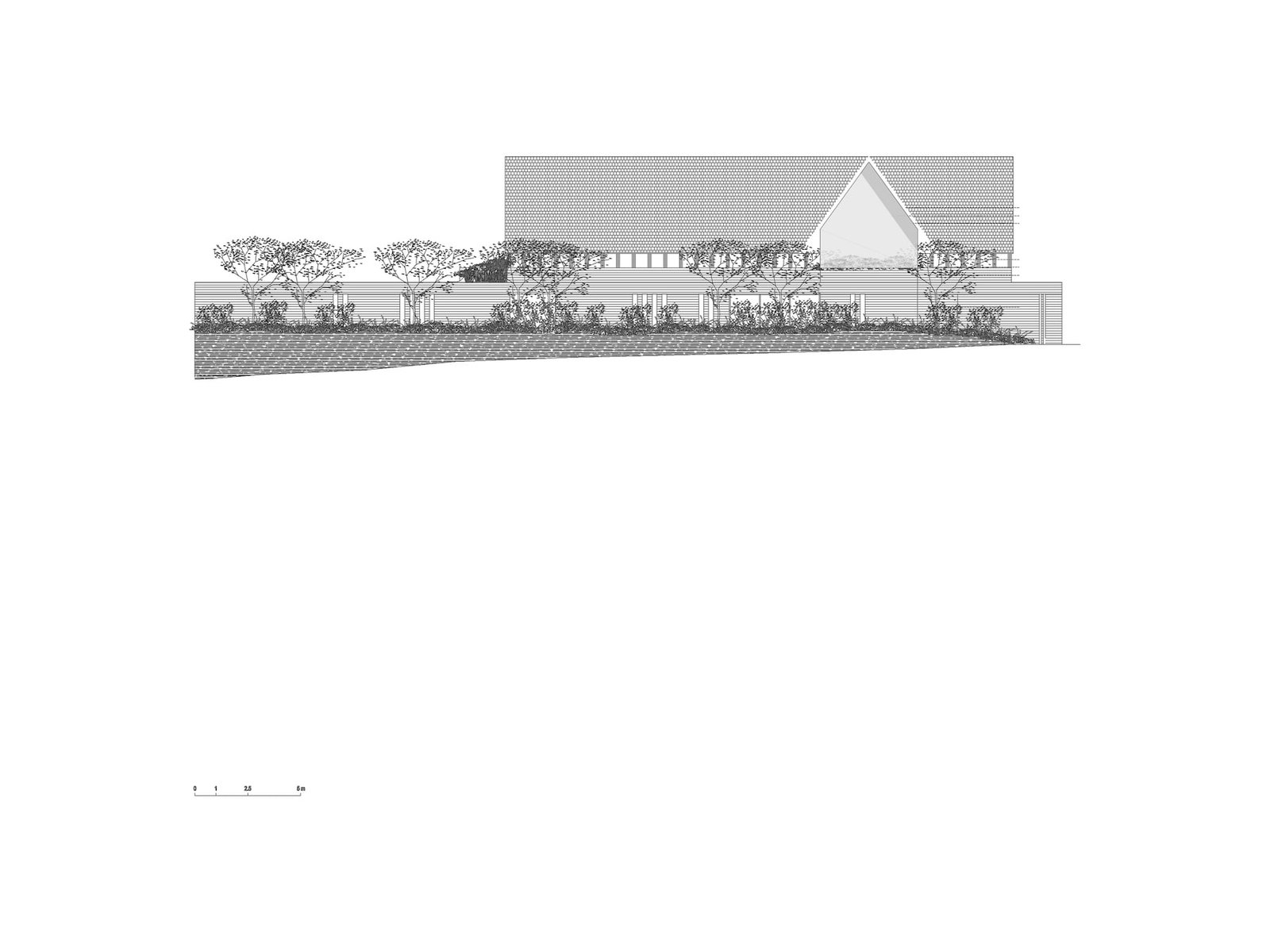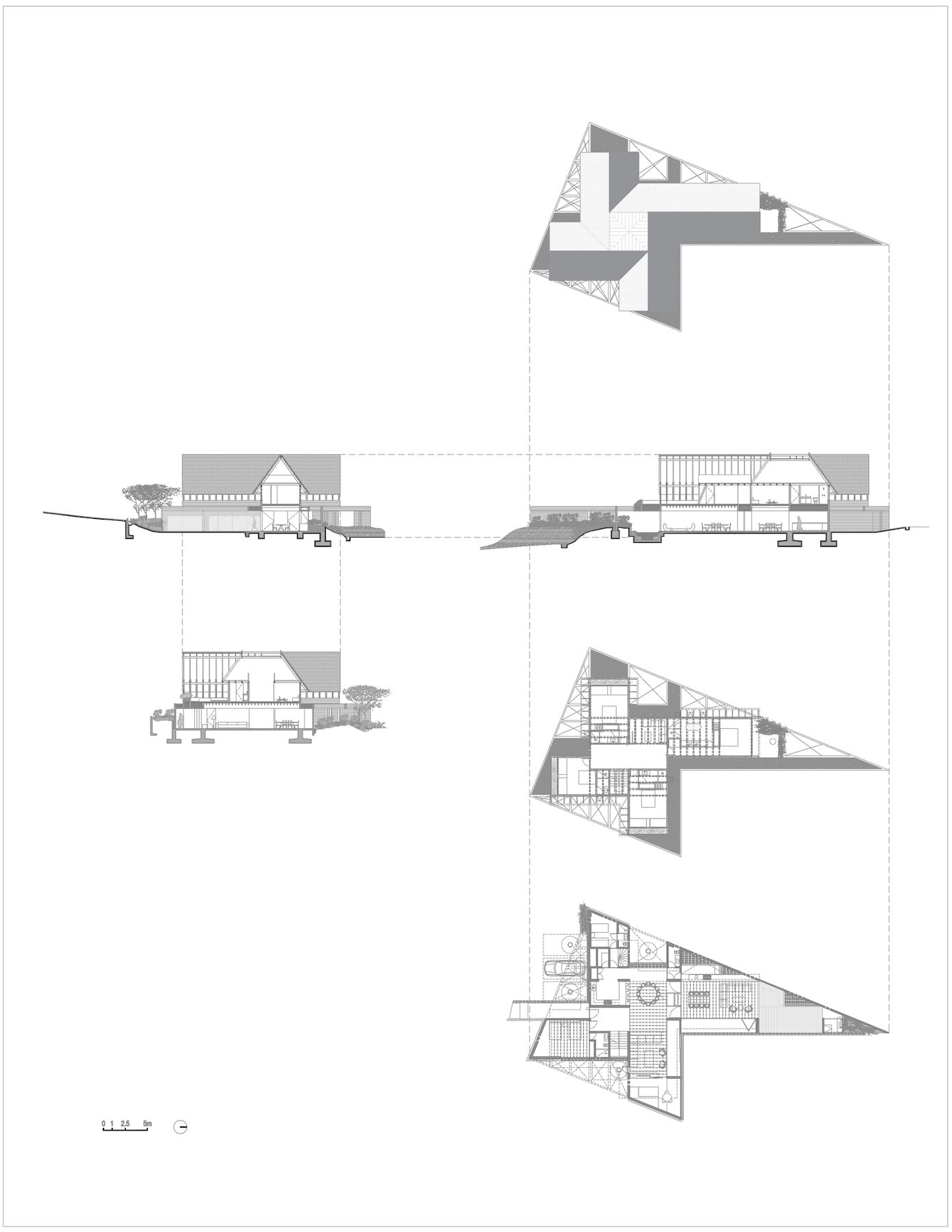 En lugar de disponerse perpendicular al acceso, todo el desplante de la casa gira para buscar las mejores orientaciones y las mejores y más amplias vistas hacia el campo deportivo. Al girar los límites y los muros perimetrales de la casa, establecen relaciones alternativas hacia el perímetro; En lugar de una barda infranqueable, se abren espacios ajardinados diagonales, que corrigen la relación de borde convencional entre el terreno y la casa. El mismo giro, permite articular los espacios cerrados y semicerrados, siempre en relación con el espacio abierto (tanto el jardín, como el campo de golf)