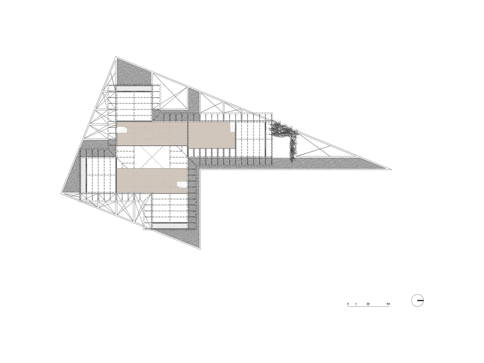 En la planta superior, las habitaciones se disponen girando alrededor de un espacio central de distribución y de captación de energía solar (calor) y, convertidas en plataformas de observación, tienen tiros visuales hacia las diversas vistas del bosque. Los cuatro espacios contenidos bajo la techumbre y estructura de madera, permiten alojar a una familia entera en cada una de las habitaciones, aprovechando las generosas alturas, con tapancos.