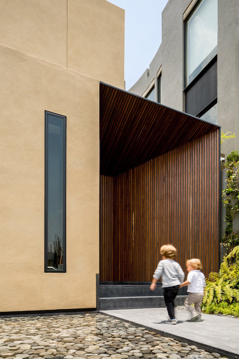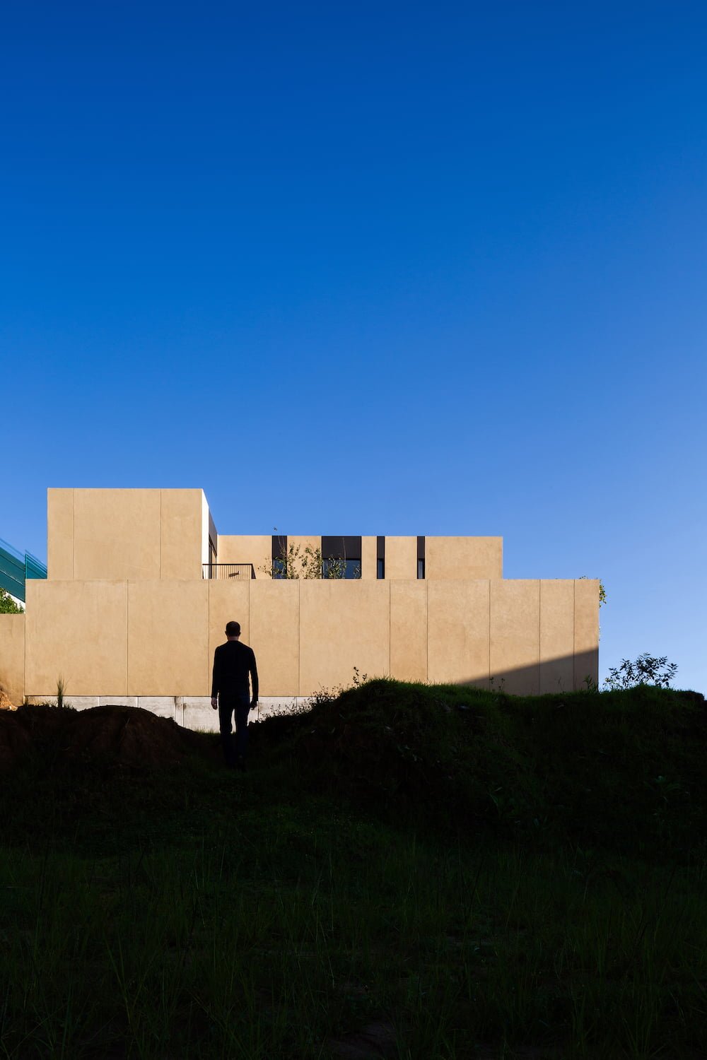 Otra forma de autosuficiencia fue la materia prima con la que se construyó la casa. Llevar a cabo el desplante incluyó una excavación y un retiro de tierra importante, por lo cual se utilizó este recurso natural para fabricar bloques de tierra comprimida en el sitio. Esta solución, además de reducir la huella ecológica, le da pertenencia y arraigo definidos por el sitio y no por el arquitecto.