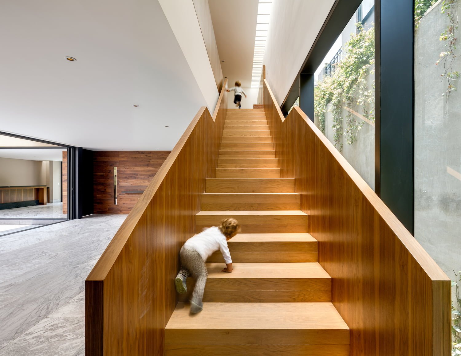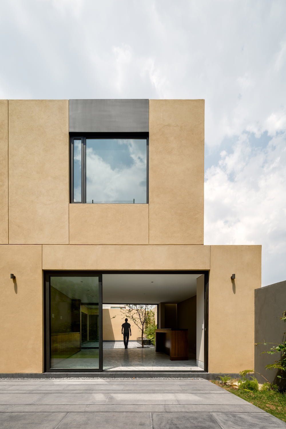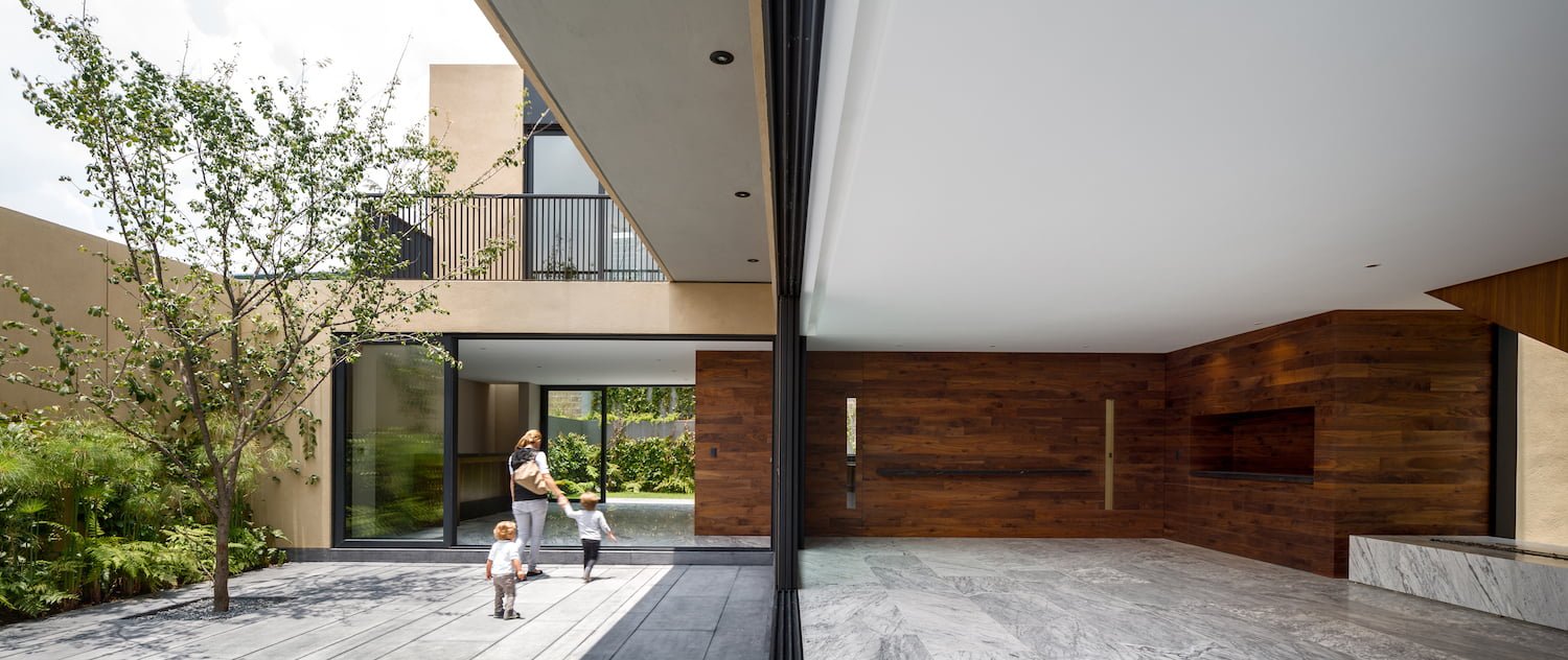 es un proyecto que, bajo su esquema de vivienda, aprovecha las orientaciones y genera un gran patio, a partir del cual se desenvuelve el programa y genera un diálogo entre interior y exterior que, al mismo tiempo, permite la entrada de luz y le da autosuficiencia visual y climática.