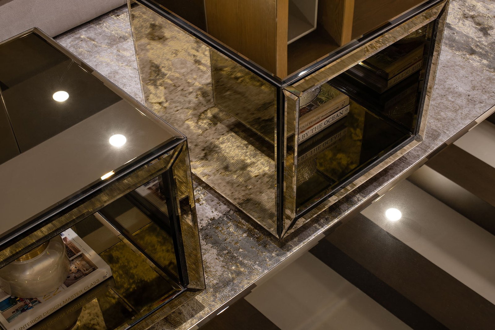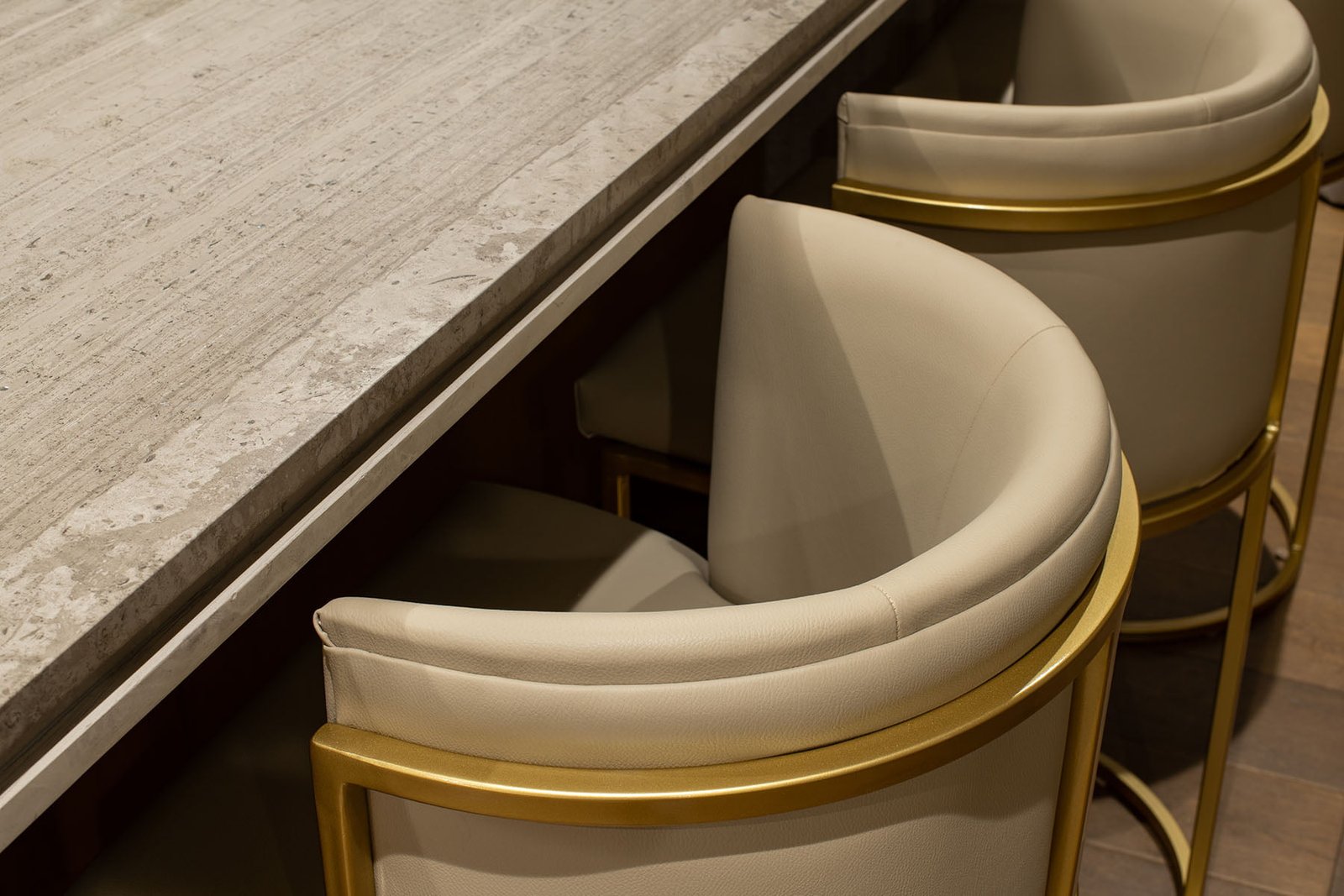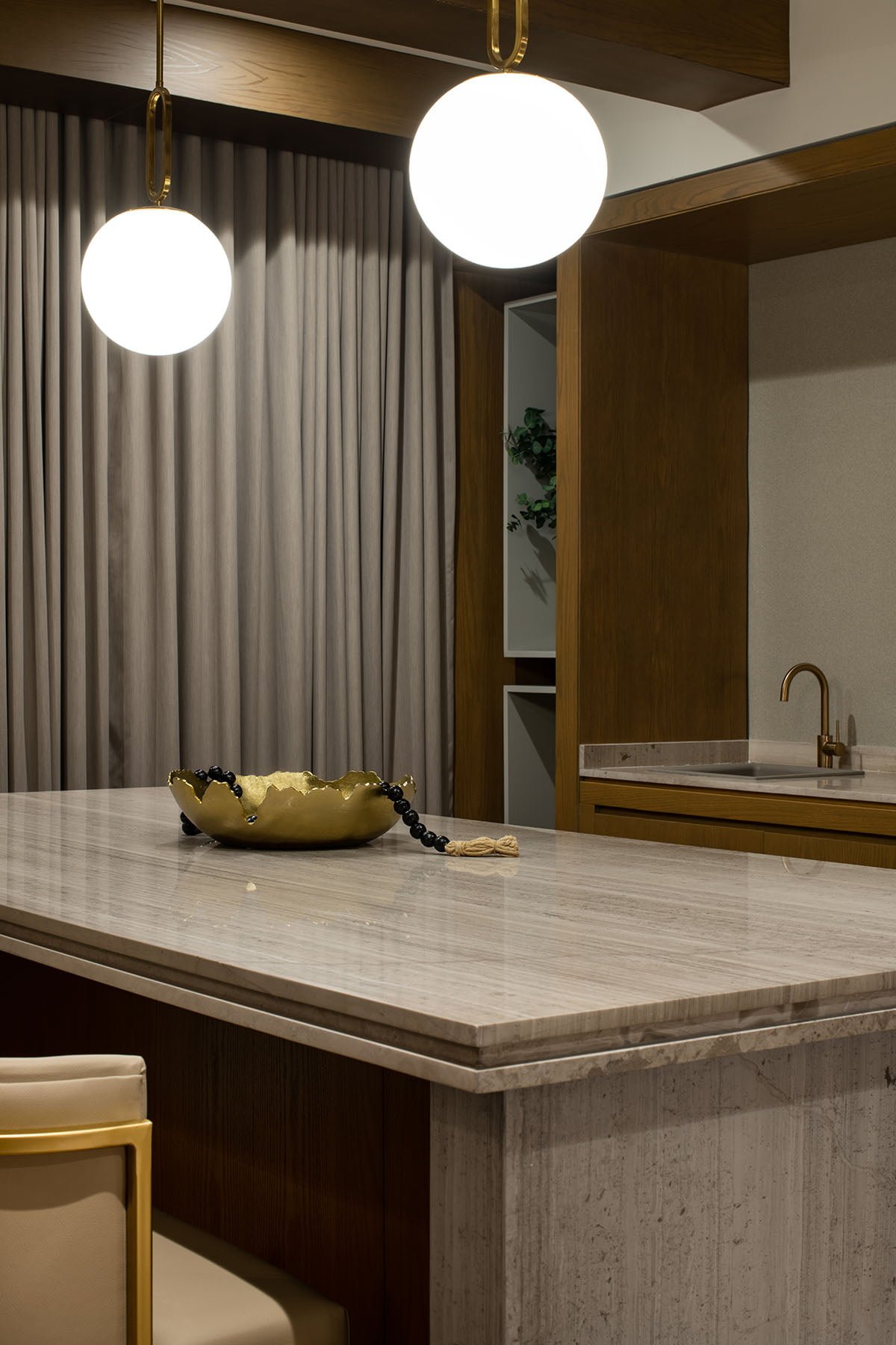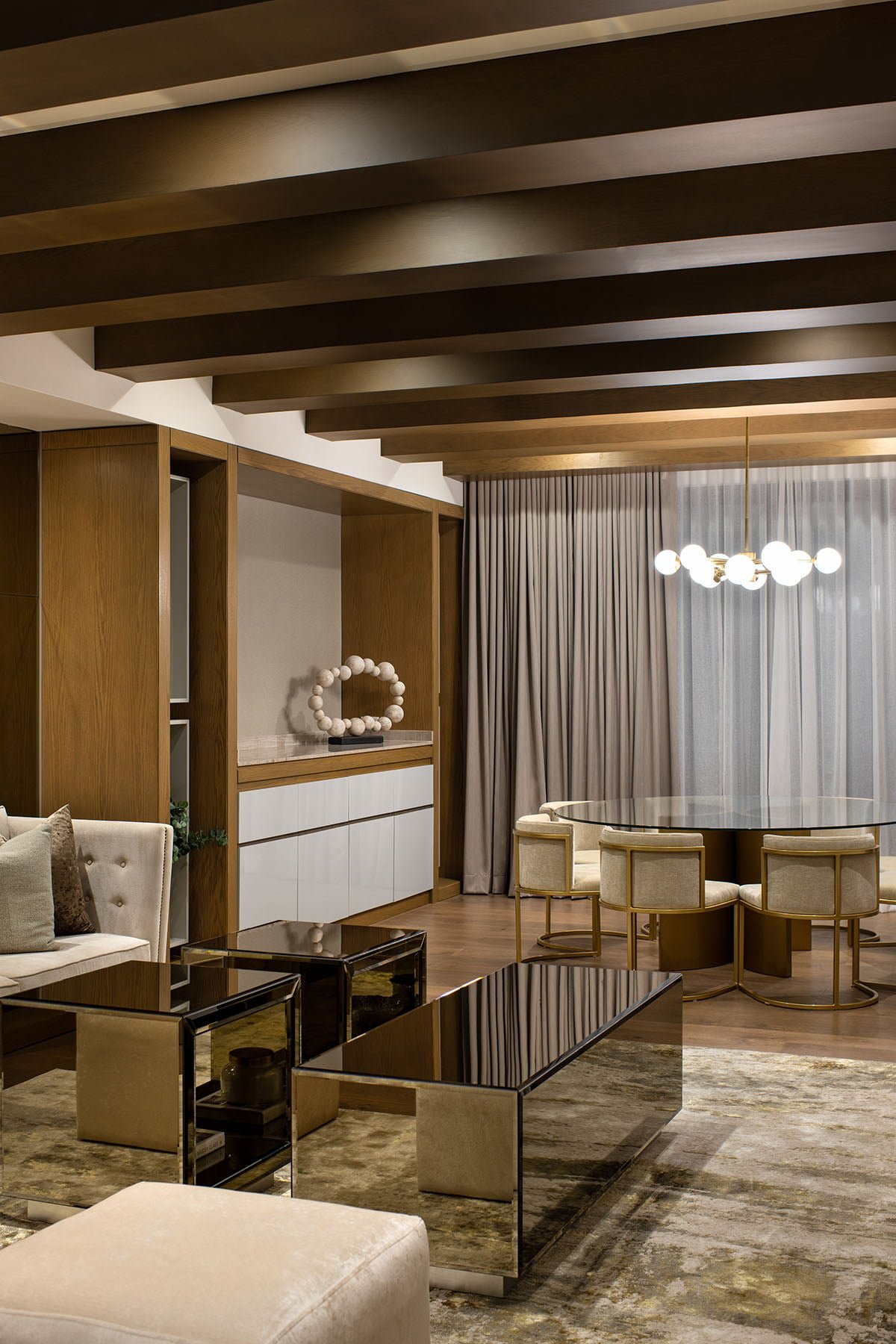 Integrando vigas en cielos, espejo modular color bronce, elementos decorativos dorados y de latón, duela de madera en piso y cubiertas de travertino y silk georgette, logramos una sensación natural y serena transmitiendo la identidad ideal para representar a nuestros clientes.