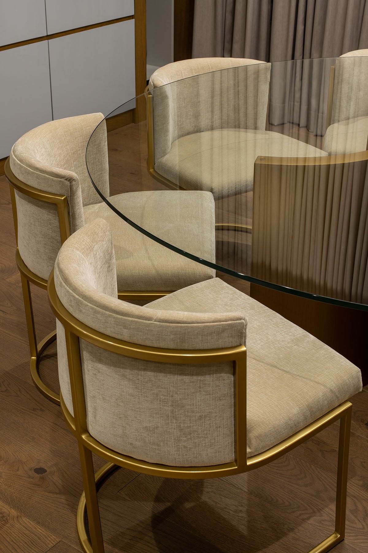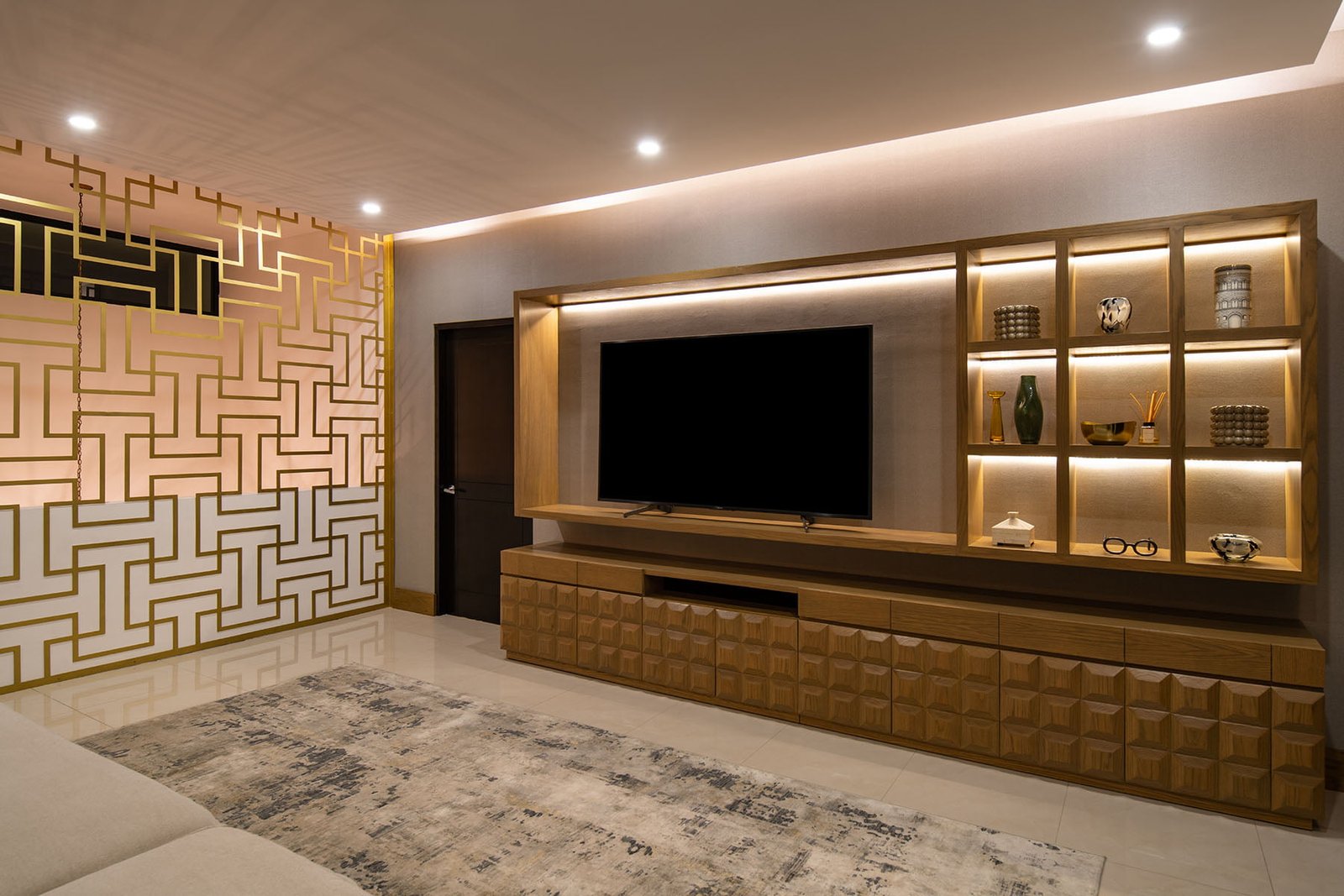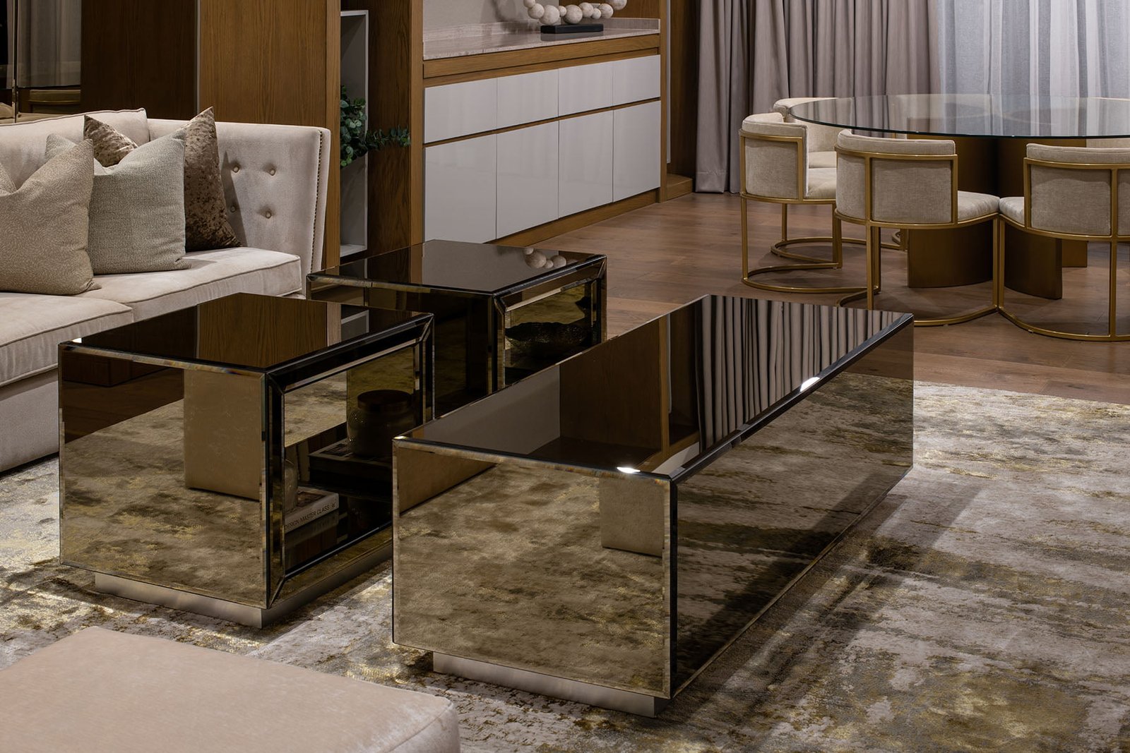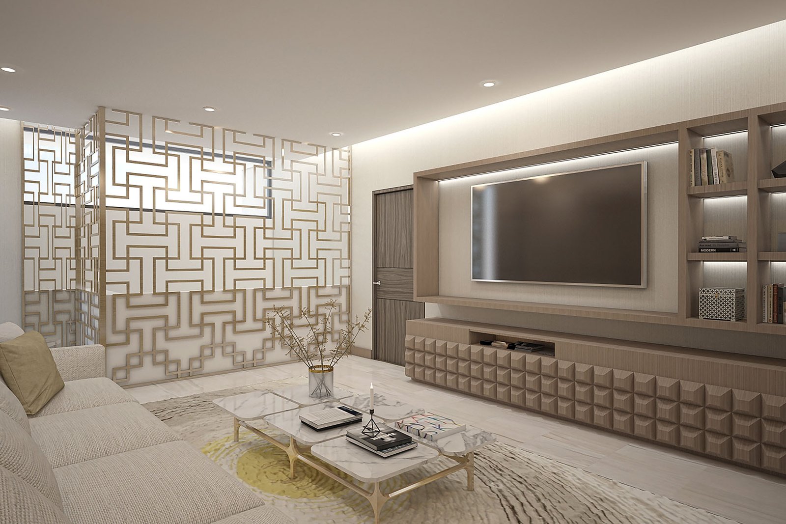 Integrando vigas en cielos, espejo modular color bronce, elementos decorativos dorados y de latón, duela de madera en piso y cubiertas de travertino y silk georgette, logramos una sensación natural y serena transmitiendo la identidad ideal para representar a nuestros clientes.