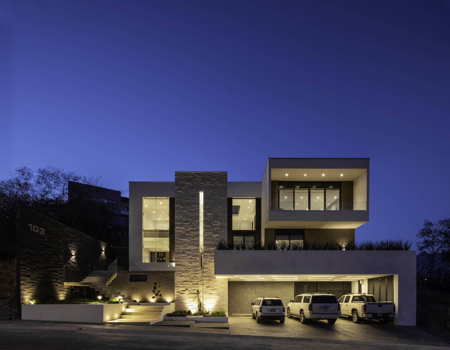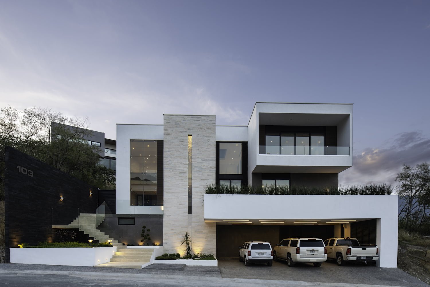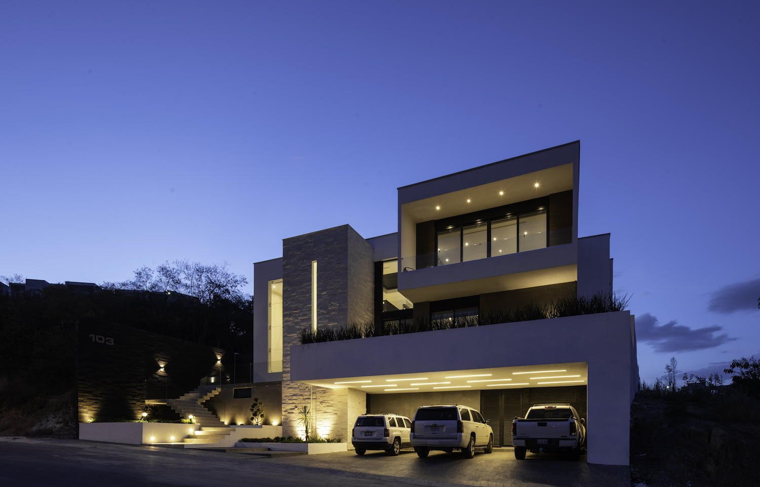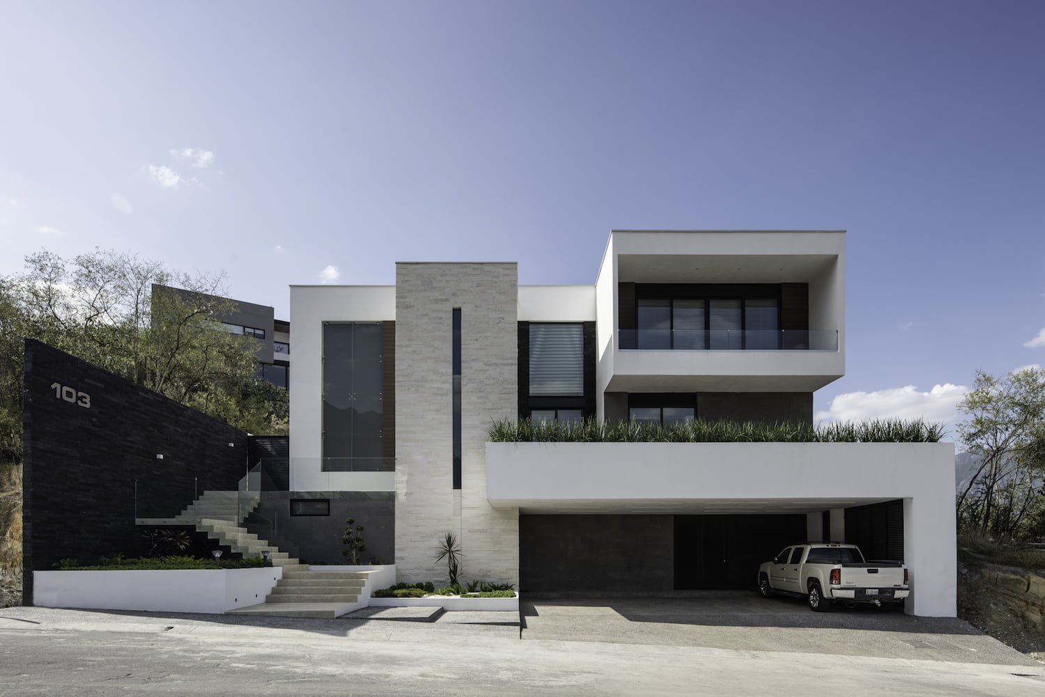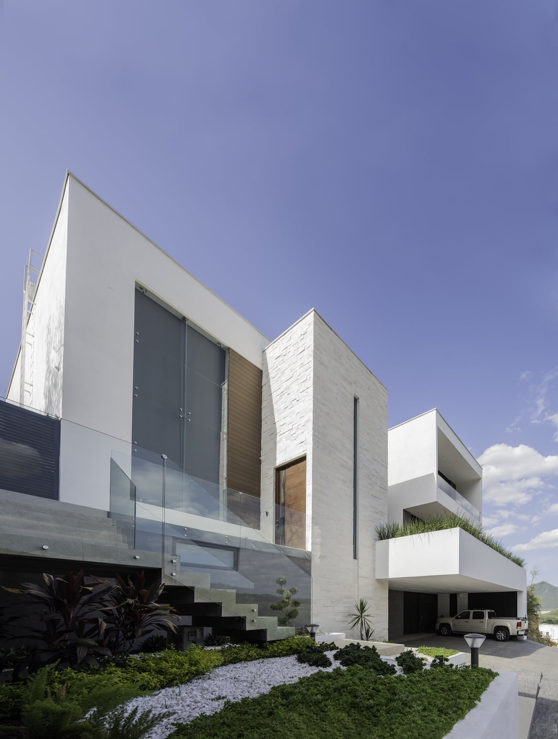se encuentra en un sitio ubicado en la zona sur de la ciudad de Monterrey, en el fraccionamiento Sierra Alta. El diseño de la casa se basó en el aprovechamiento al máximo del terreno, su orientación, las vistas envidiables hacia la sierra y al campo de golf y al mismo tiempo respetando su topografía. Utilizando la escalera como eje principal de diseño, toda la casa se resuelve alrededor de ella.