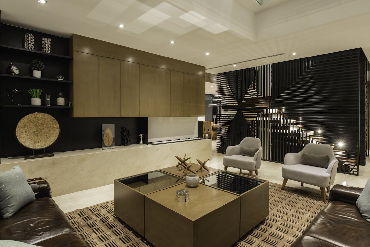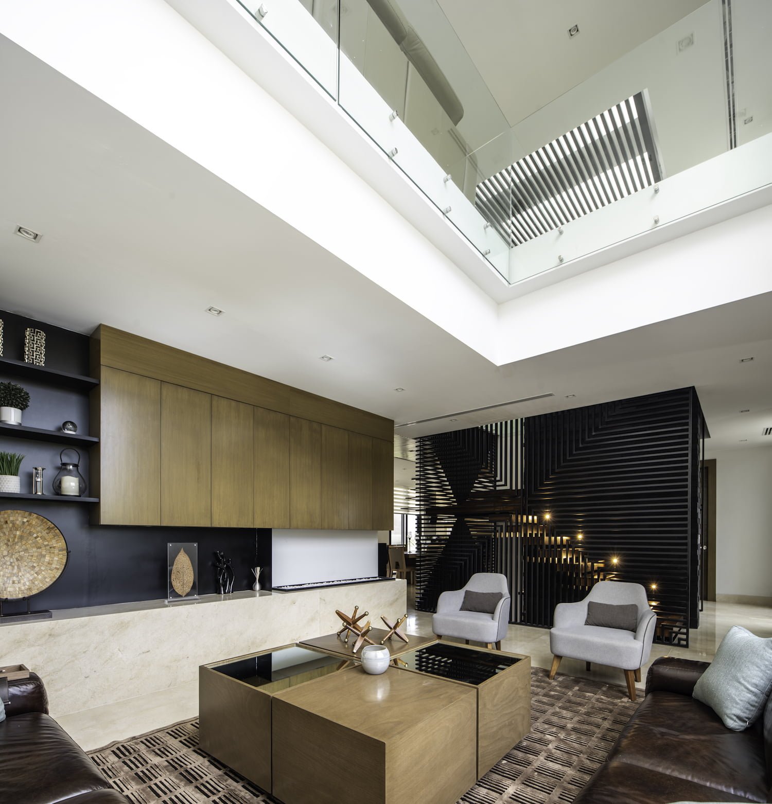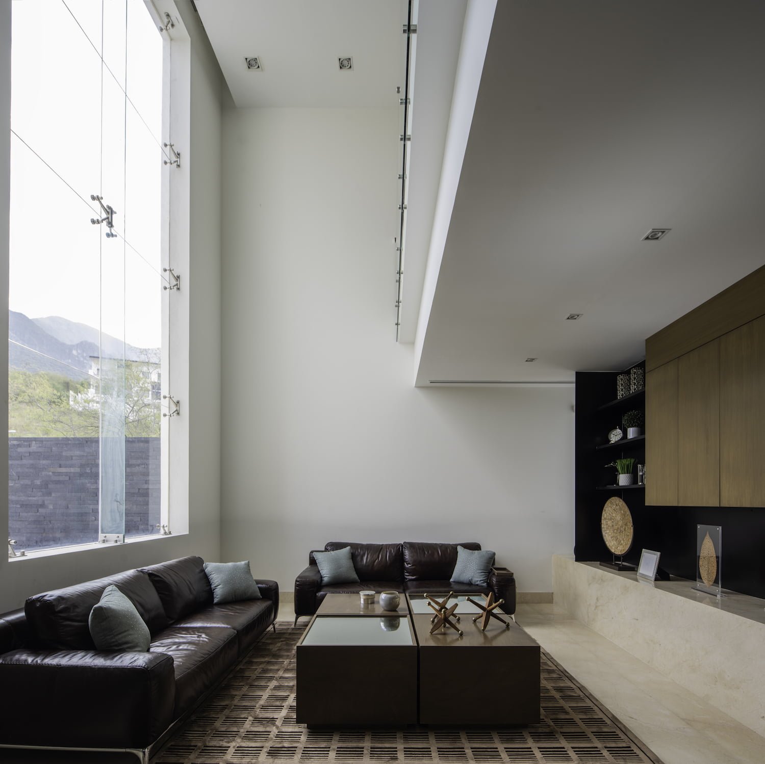 Cumpliendo con su función, sirve también como elemento decorativo, que se puede apreciar desde toda el área social, especialmente desde la sala. En esta zona, se colocó un ventanal de doble altura, que baña de luz del sur a la sala y la estancia familiar en planta alta. Al costado opuesto de la sala y del otro lado de la escalera, se encuentra el baño y la recámara de visitas, así como una terraza jardín.