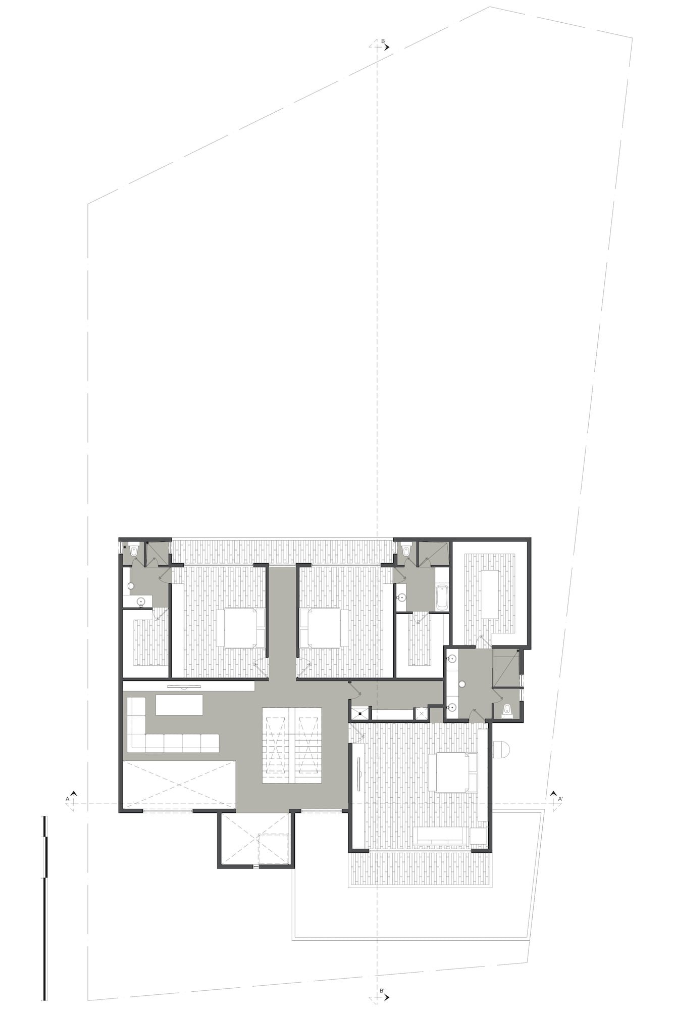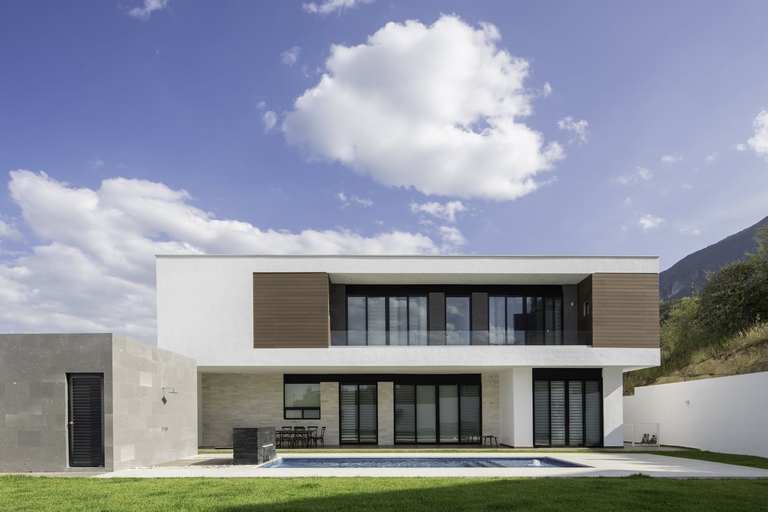 En la planta alta, se encuentran las habitaciones de las hijas, cada una con su baño vestidor y una terraza compartida, así como la recámara principal, con su balcón que permite apreciar la vista hacia la Sierra Madre. El juego de volúmenes se desarrolló de manera que el nivel superior, funcionara como protección para el área social, en la planta baja, dándole sombra por medio de volados, que provocan una sensación de ligereza.