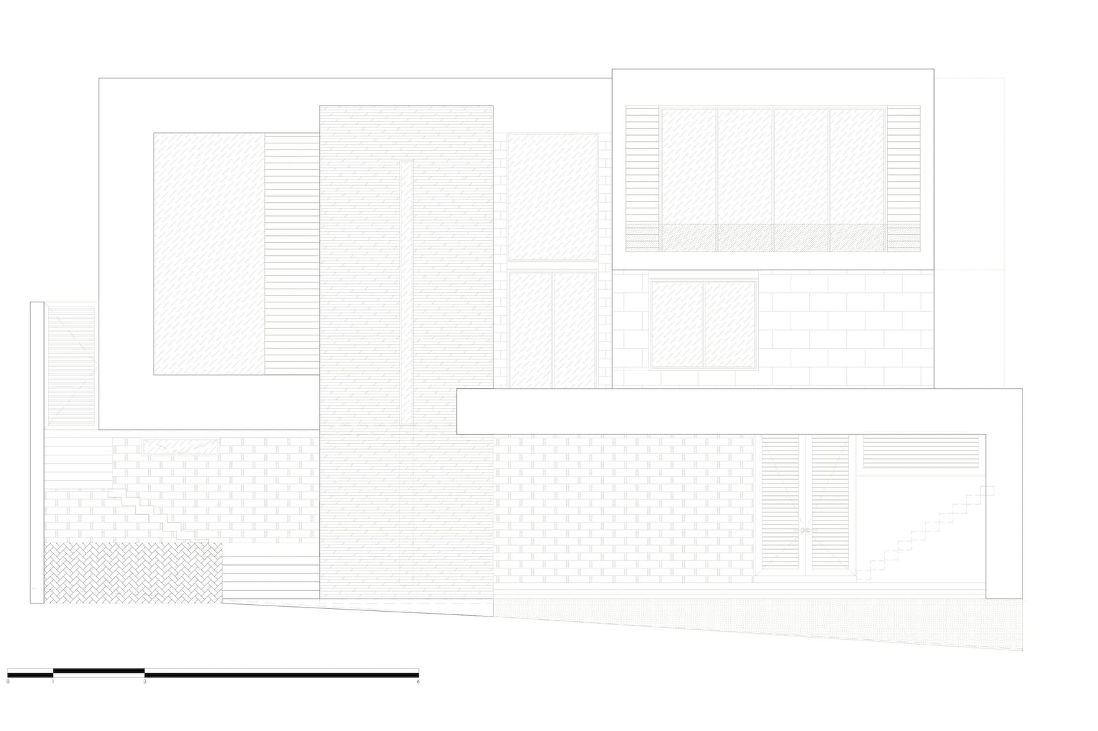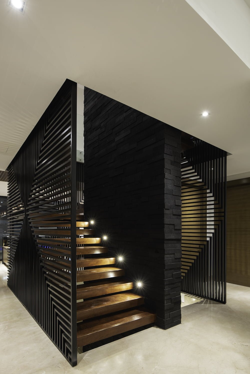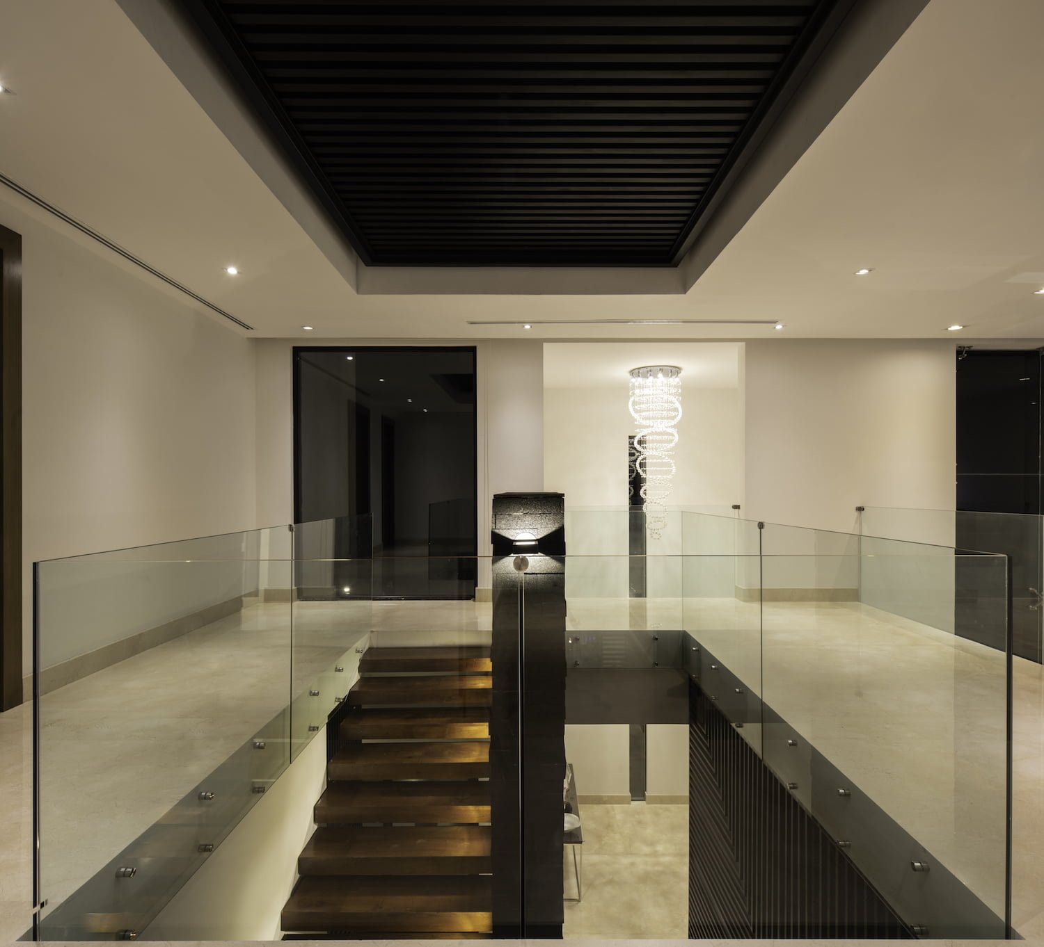 En el costado opuesto, el poniente, está el acceso principal, resuelto con una escalera escultórica, que atraviesa el jardín frontal para llegar al pórtico de acceso, en la planta baja. Ingresando al recibidor de doble altura, nos encontramos nuestro primer remate visual y el centro de la casa: Una escalera escultórica volada, forrada de madera, apoyada solo sobre un muro de concreto recubierto con piedra volcánica y envuelta en una celosía de acero, fabricada de manera artesanal, pieza por pieza y bañada con luz natural por medio de un domo ubicado en la losa de azotea, que se encarga de formar un juego de luz y sombras, a través de un pergolado de acero.