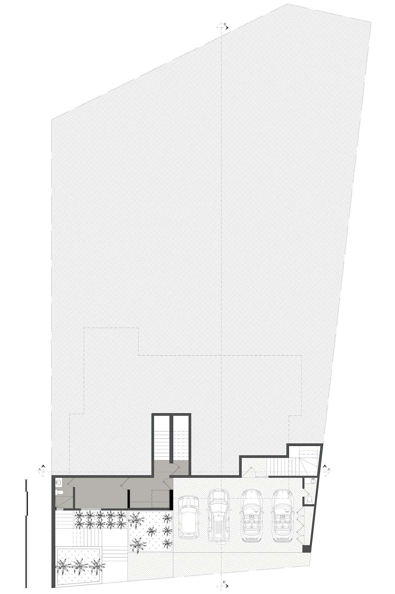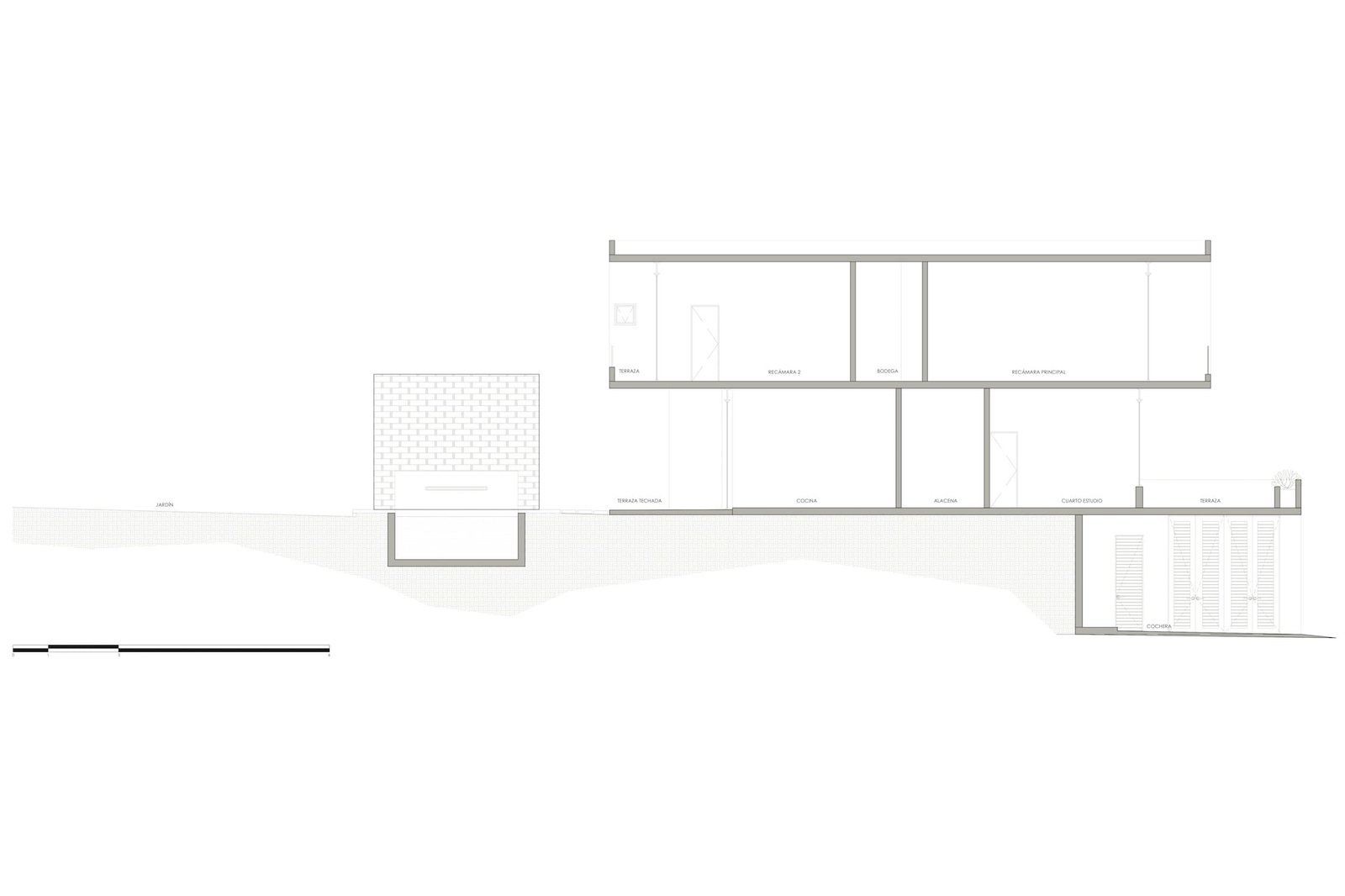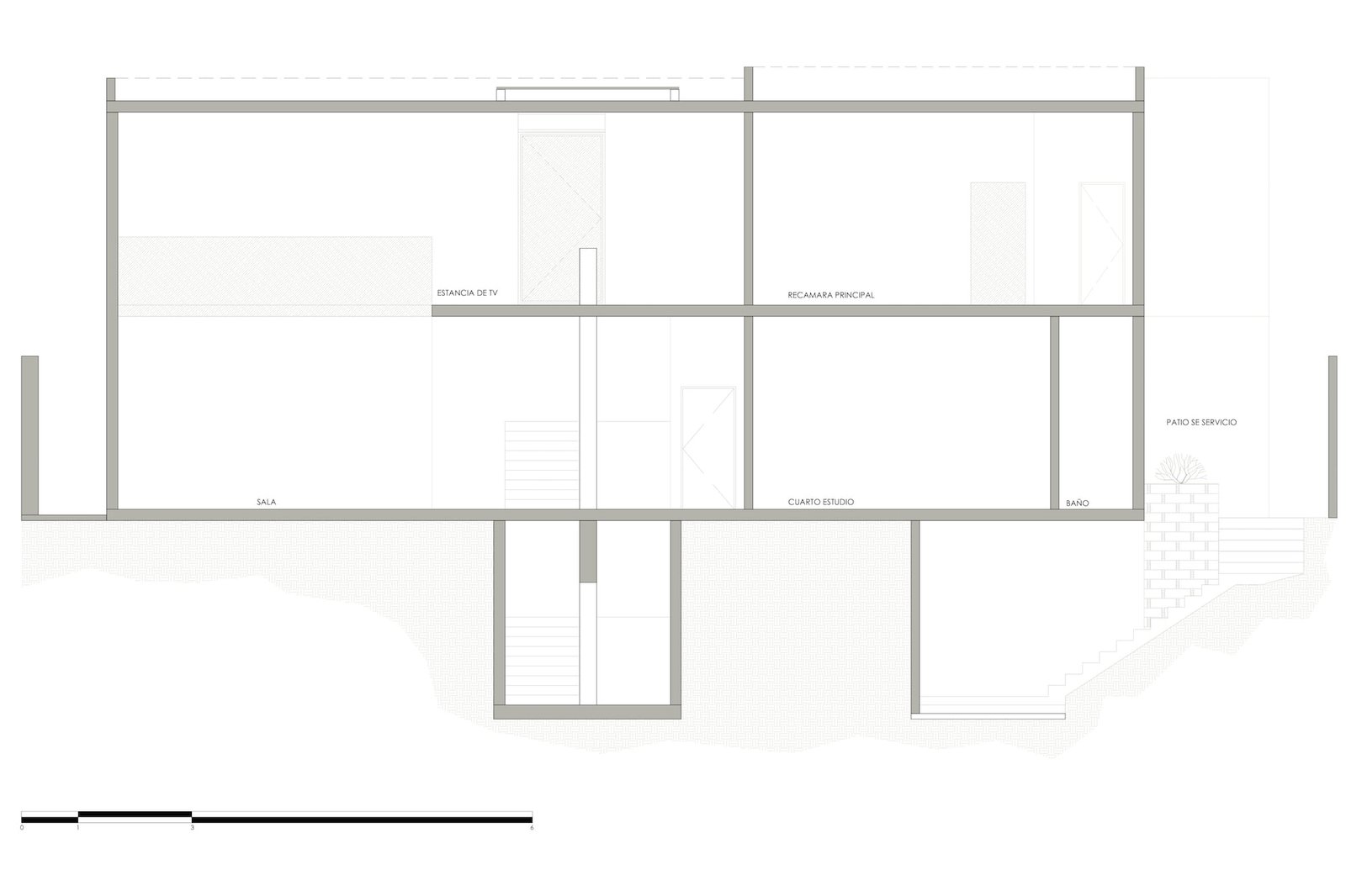 En el sótano, o nivel de calle, tenemos la cochera con el acceso general, que da a un pequeño recibidor, una oficina privada y a la escalera, mientras que por fuera, se encuentra el acceso al pasillo de servicio, así como un medio baño servicio y una bodega.