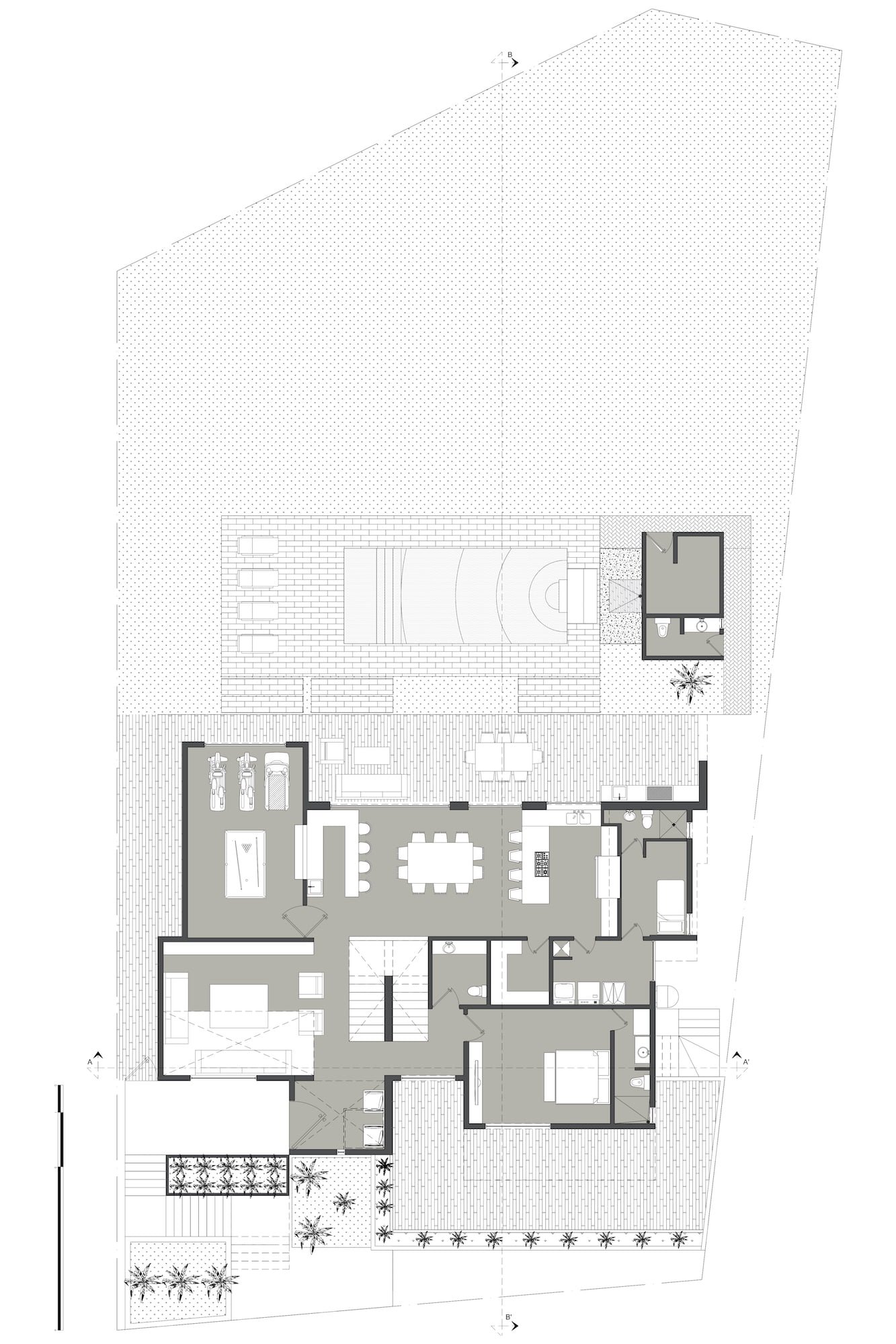 En la zona norte de la casa, se encuentra el área social, conformada por un salón de juegos, un bar, el comedor y la cocina, todo con vista hacia el jardín y con acceso a la terraza-asador techada, por medio de ventanales de cristal, que provocan la sensación de estar al mismo tiempo en el interior y en el exterior. A un costado de la cocina, se encuentran los servicios.
