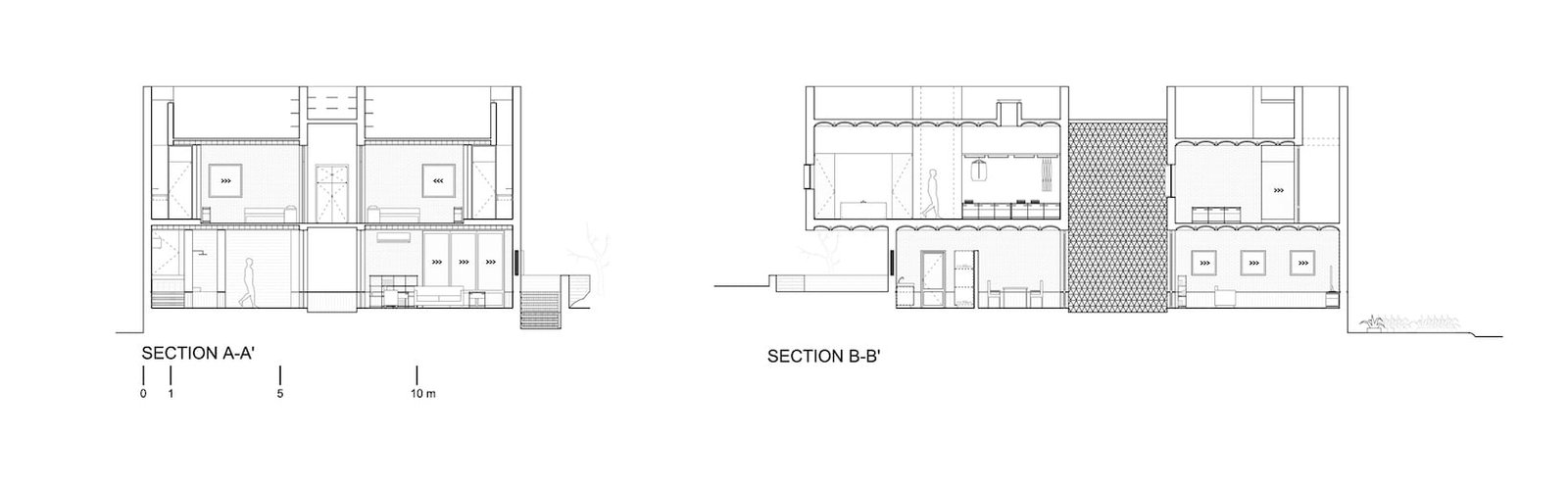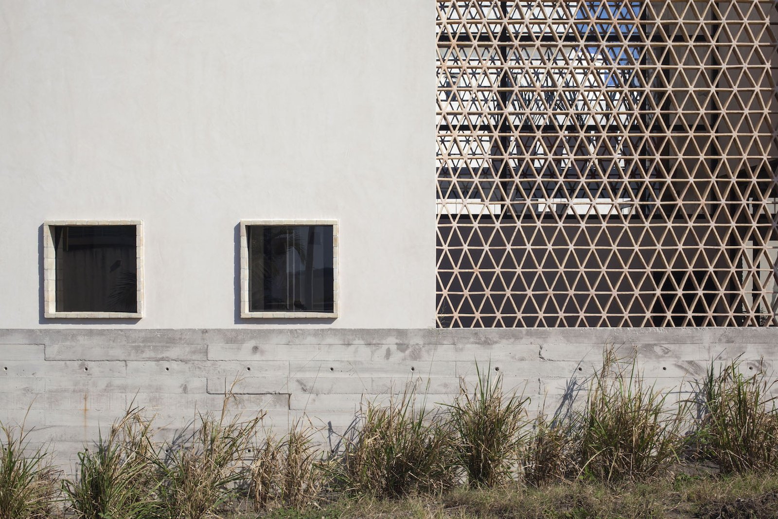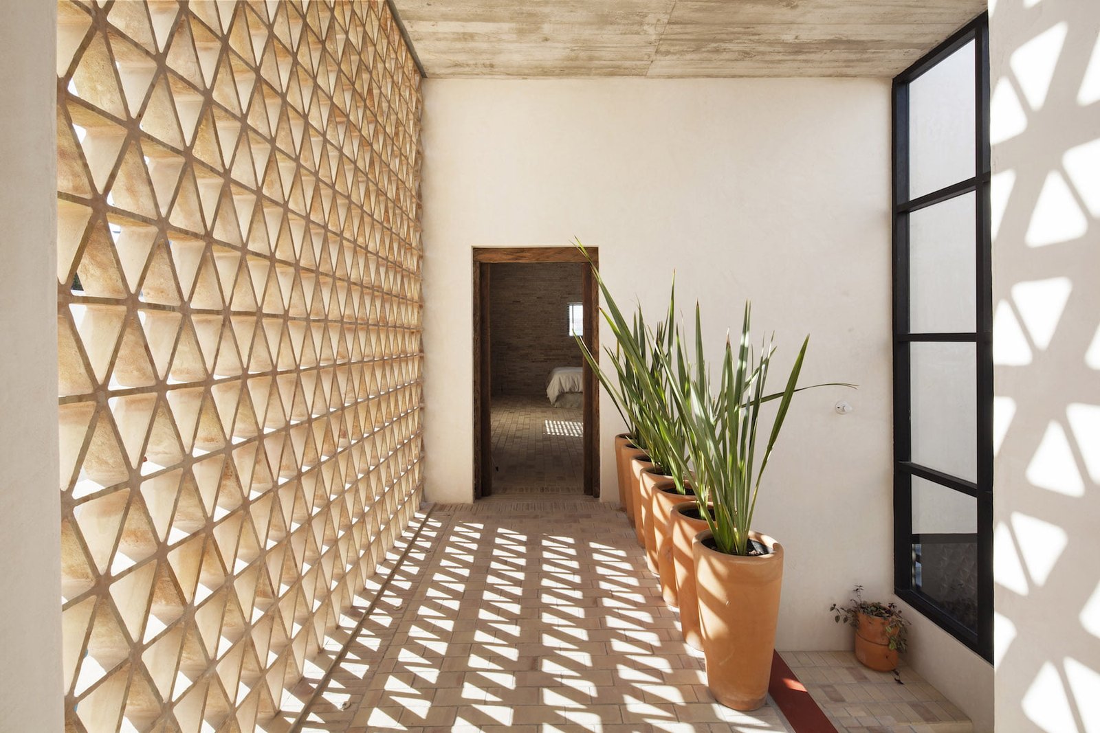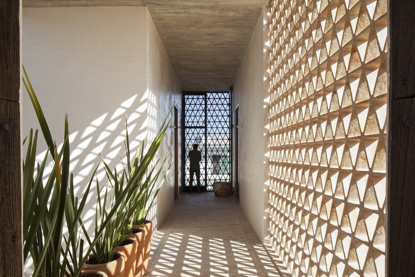 La luz juega un papel importante al trabajar en conjunto con los muros celosía; un juego de tramas, de luces y sombras, recorre los espacios materializando el paso del tiempo.