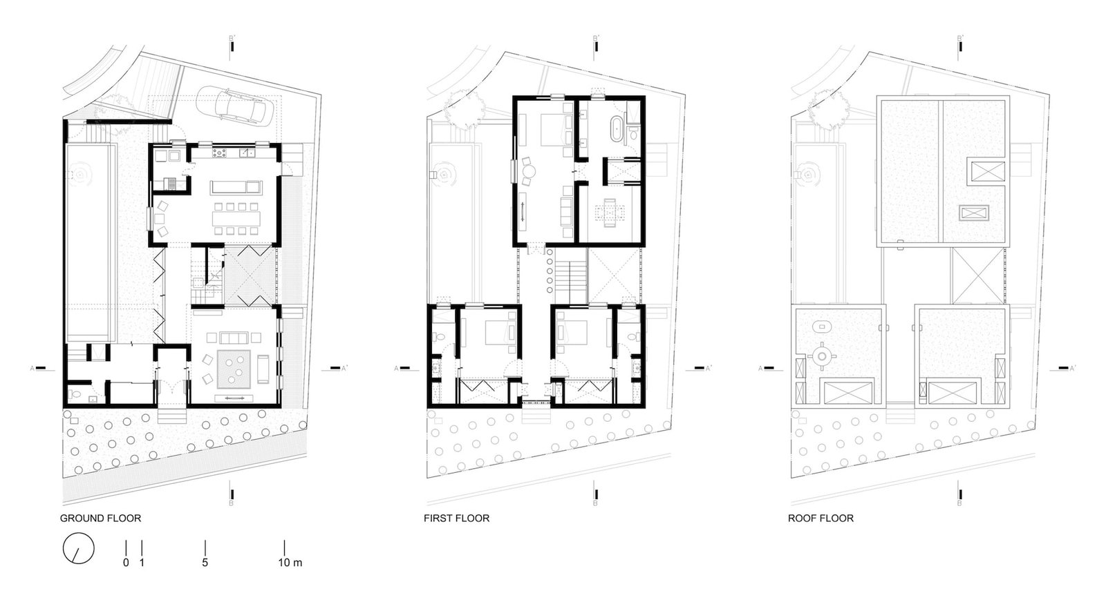 La casa cuenta con un programa público y de servicio, en planta baja, desplantado dentro de los límites de los tres volúmenes que conforman el proyecto. En planta alta, por el contrario, encontramos un programa exclusivamente privado, distribuyendo una recámara por cada uno de los tres módulos.