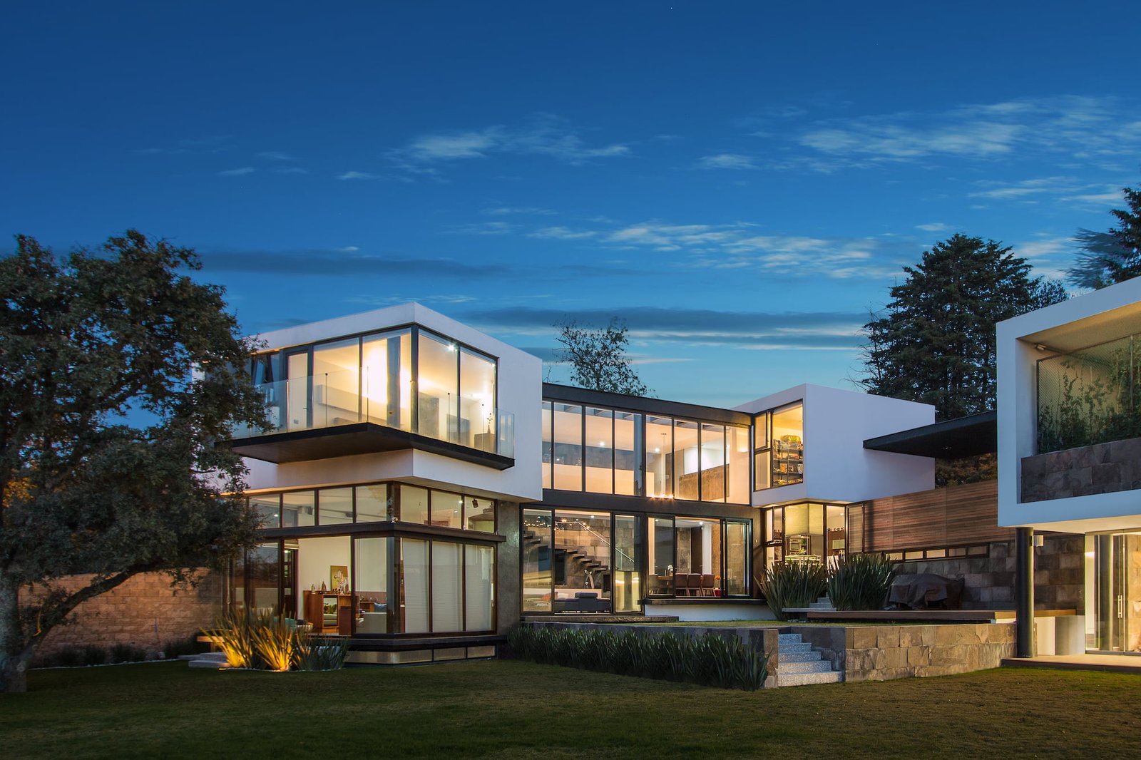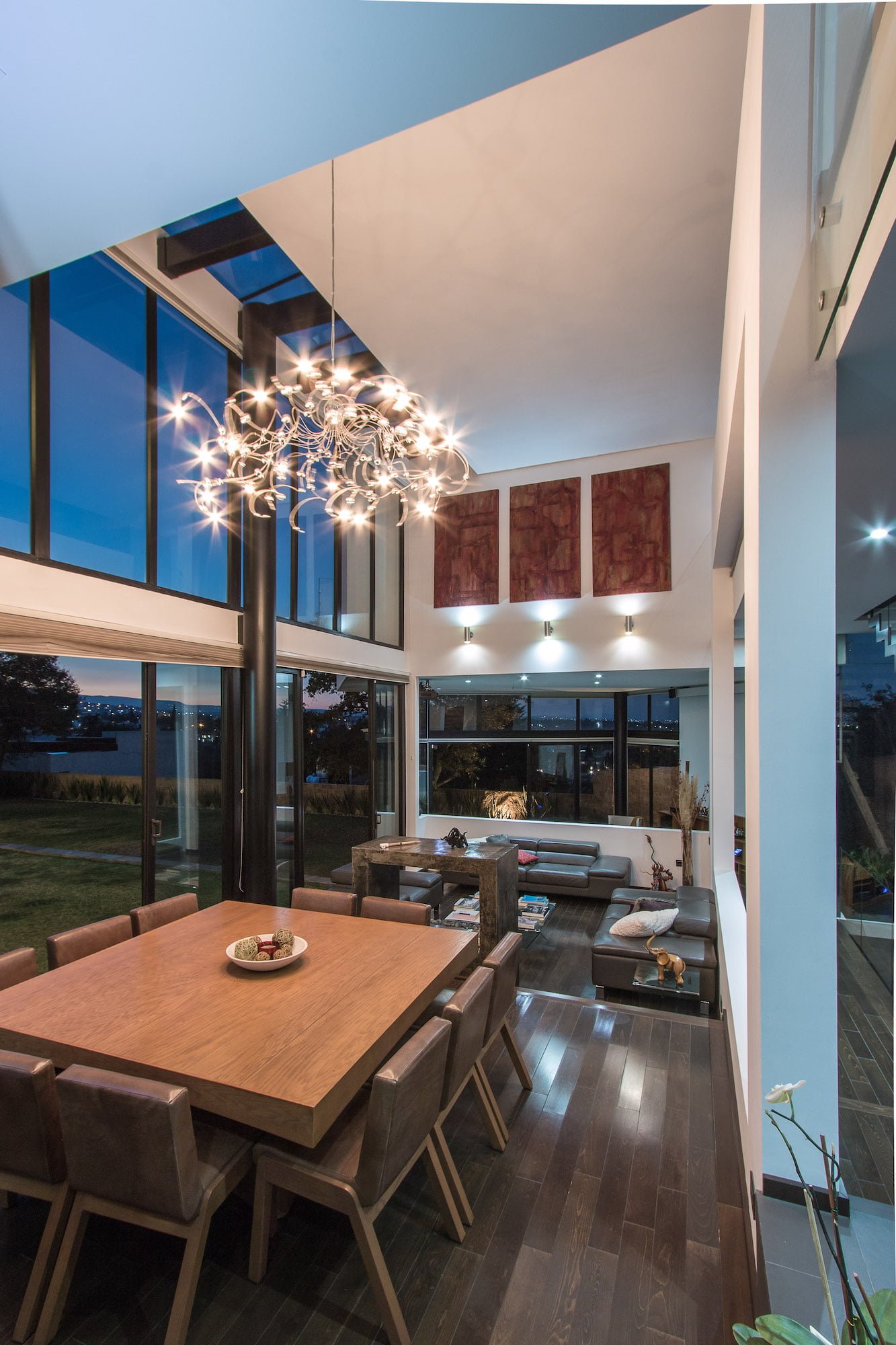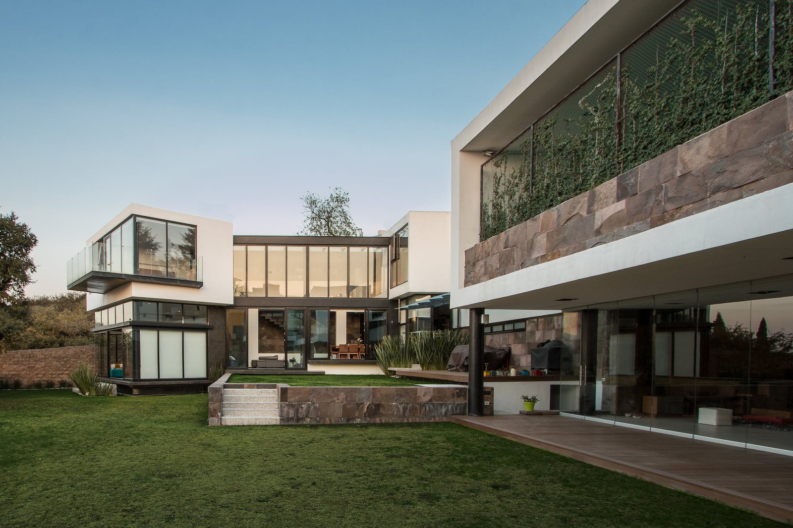 Al mismo tiempo la casa se desarrolla a lo largo de la pendiente del terreno, bajando pausadamente, la distribución la marca un gran muro de piedra que sostiene lateralmente la escalera, misma que conduce al puente que cruza por encima de la sala comedor, dicho puente da privacidad entre la recámara principal y las secundarias. El puente ayuda a crear una doble altura sobre el área de la sala comedor. Este gran espacio central se abre hacia el jardín principal. La composición de los volúmenes muestra un esfuerzo para integrarse al contexto. Planos horizontales metálicos que se intersectan con volúmenes limpios que se cierran al exterior y se abren al interior, soportados por planos verticales de piedra volcánica que se integran con el sitio. Los materiales buscan fundirse dentro del contexto intentando un balance entre calidez y sencillez.