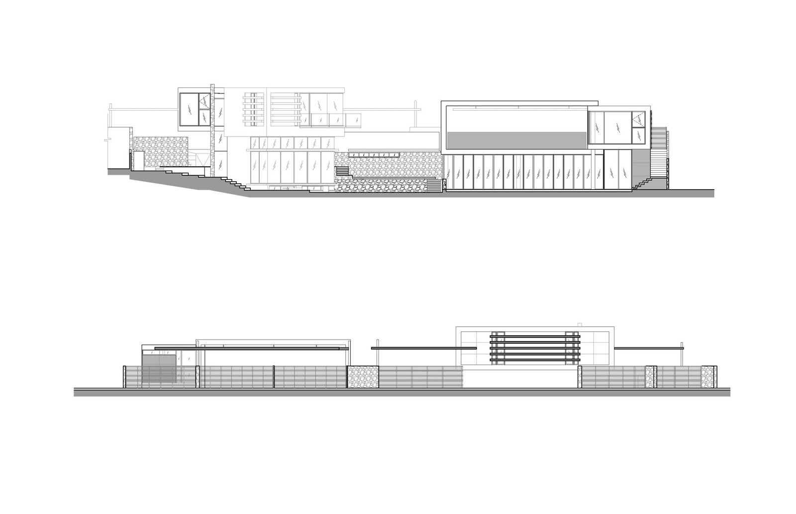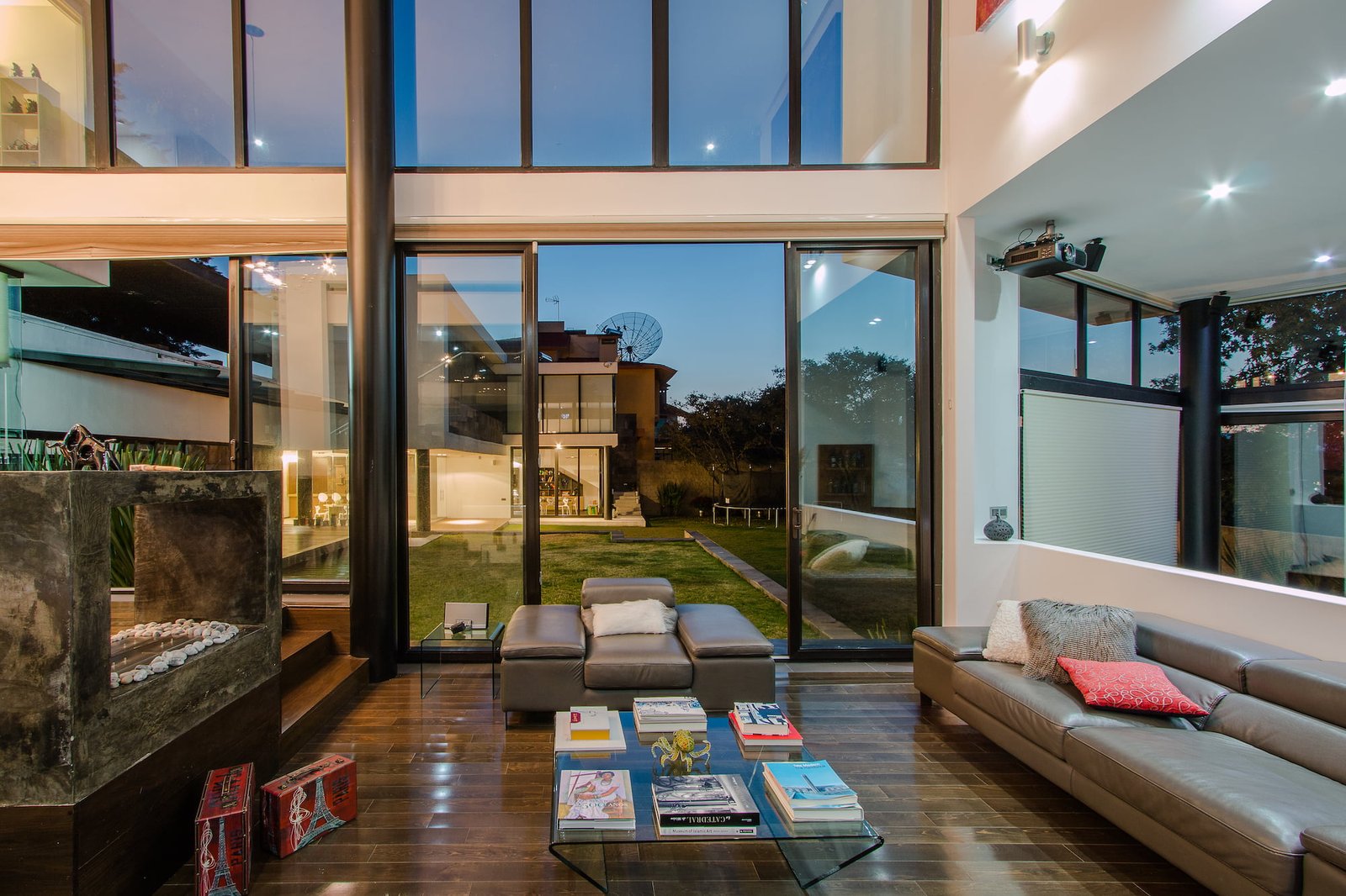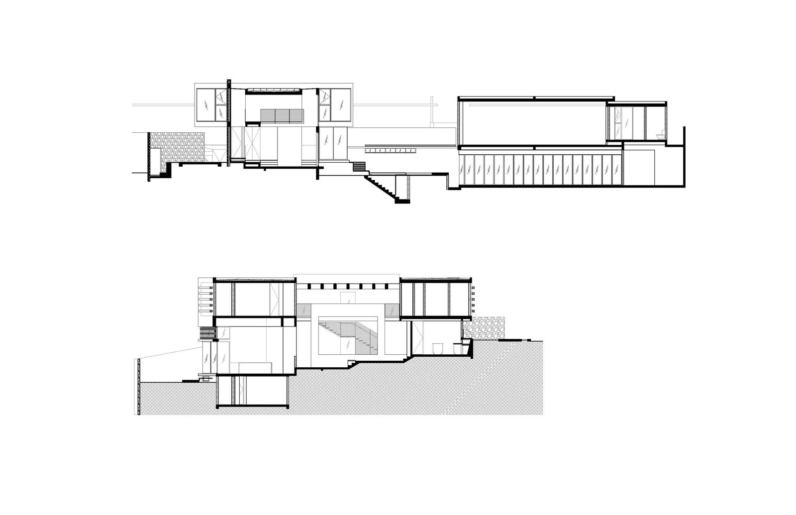 Al mismo tiempo la casa se desarrolla a lo largo de la pendiente del terreno, bajando pausadamente, la distribución la marca un gran muro de piedra que sostiene lateralmente la escalera, misma que conduce al puente que cruza por encima de la sala comedor, dicho puente da privacidad entre la recámara principal y las secundarias. El puente ayuda a crear una doble altura sobre el área de la sala comedor. Este gran espacio central se abre hacia el jardín principal. La composición de los volúmenes muestra un esfuerzo para integrarse al contexto. Planos horizontales metálicos que se intersectan con volúmenes limpios que se cierran al exterior y se abren al interior, soportados por planos verticales de piedra volcánica que se integran con el sitio. Los materiales buscan fundirse dentro del contexto intentando un balance entre calidez y sencillez.