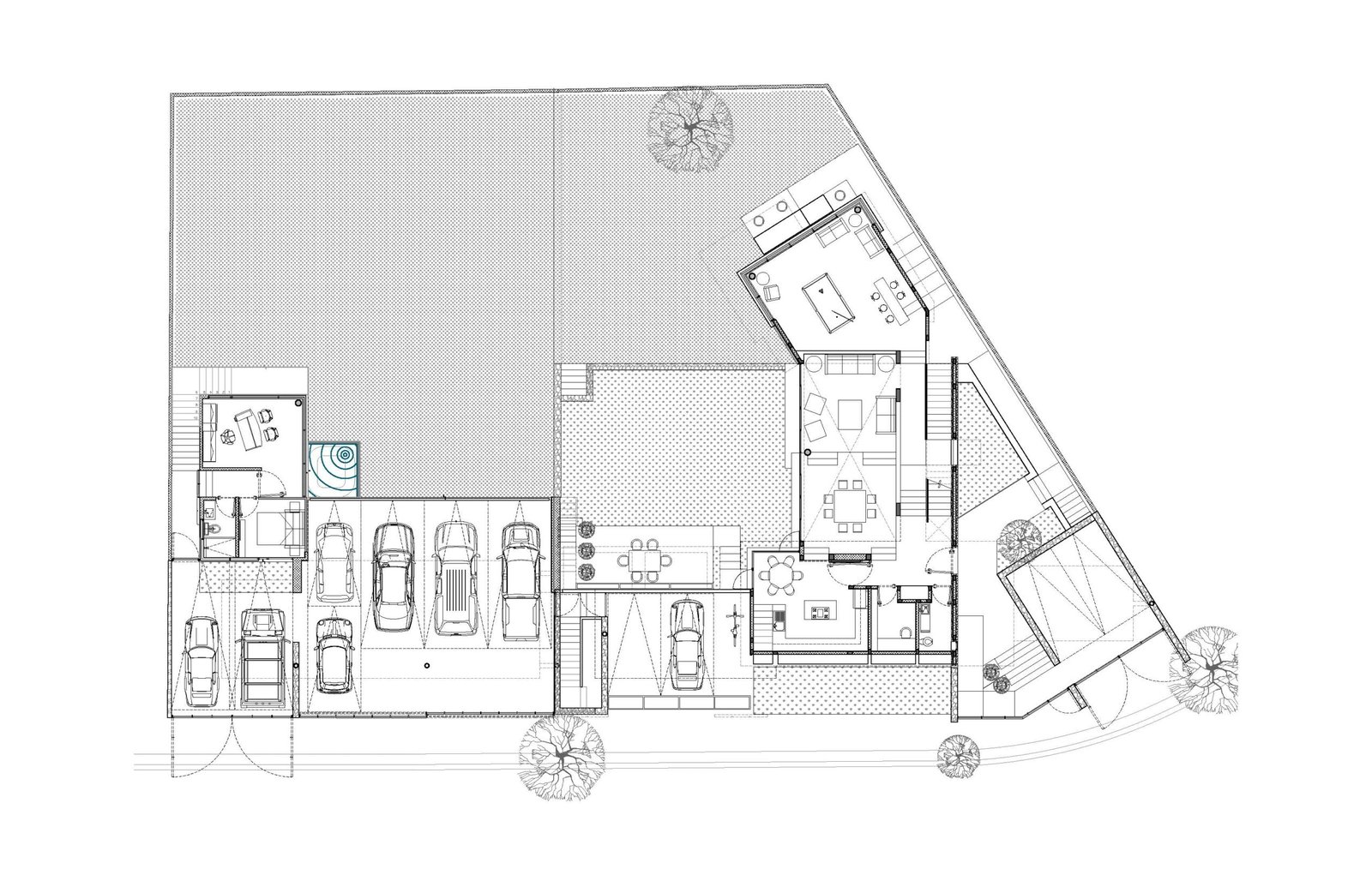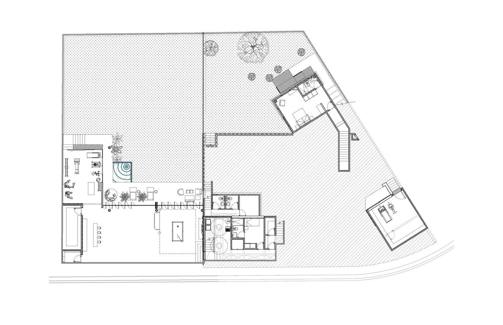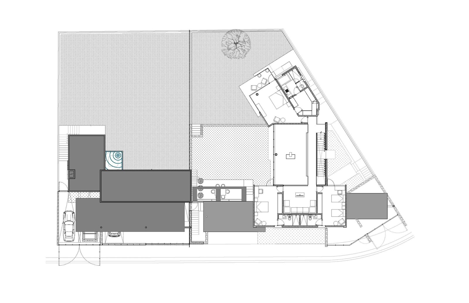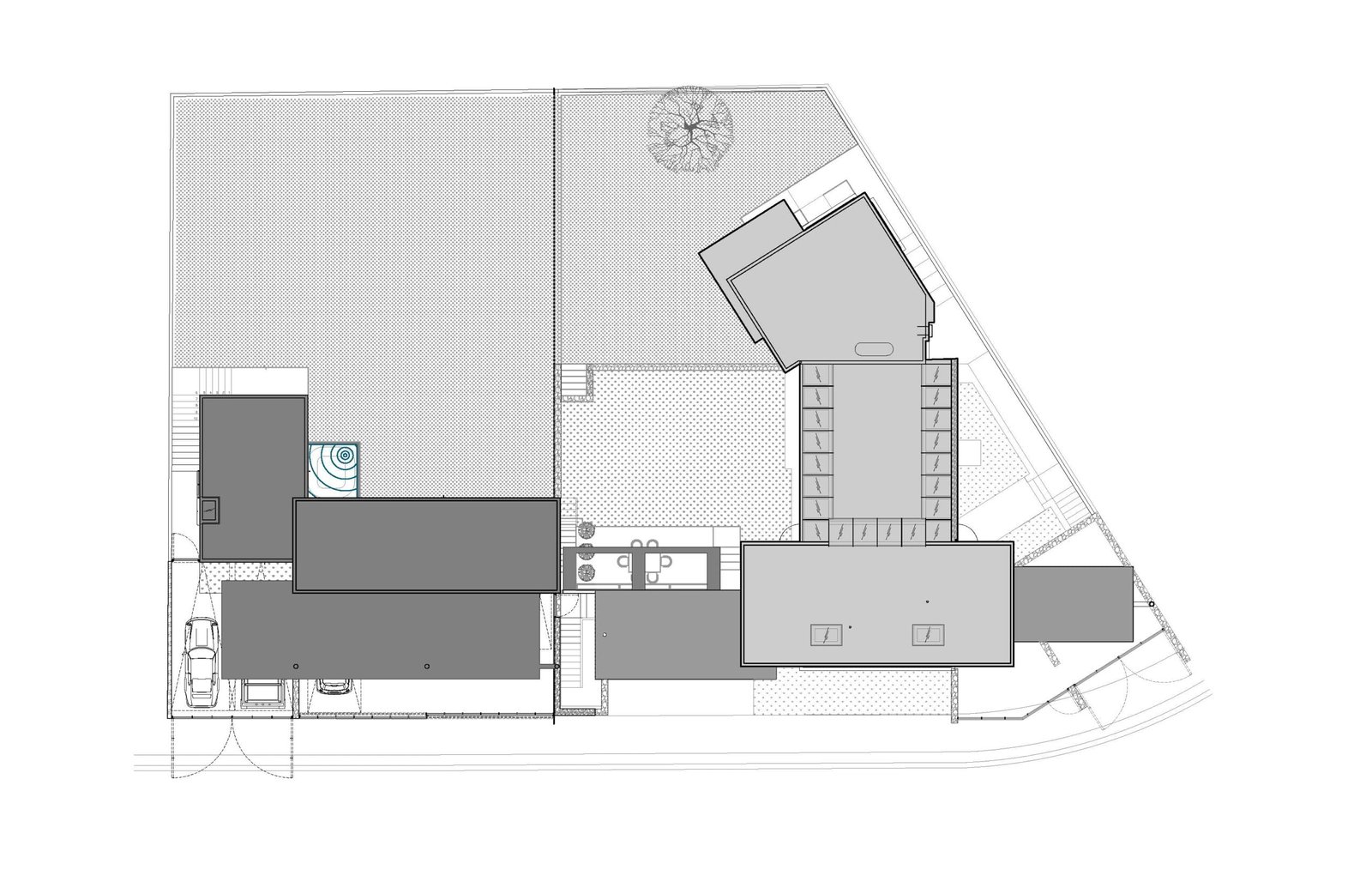 El sitio del proyecto se ubica en la zona norponiente de la ciudad, en la Zona Esmeralda del Estado de México. Es una zona fría de muchas lomas con excelentes vistas. El predio tenía una forma trapezoidal con pendiente descendente, y grandes vistas hacia el norte. El cliente solicitaba aprovechar las vistas con una casa cálida y un gran jardín. Había que encontrar una forma que resolviera todos los problemas en una misma idea. Aprovechando la forma del predio, se decantó la propuesta hacia una planta en forma de “T” que aprovechaba el sol oriente-poniente y obtenía las vistas lateralmente, reservando mucho espacio libre para el jardín que convive con todos los espacios. Los cuartos secundarios tendrían calor del lado sur y vistas hacia el norte.