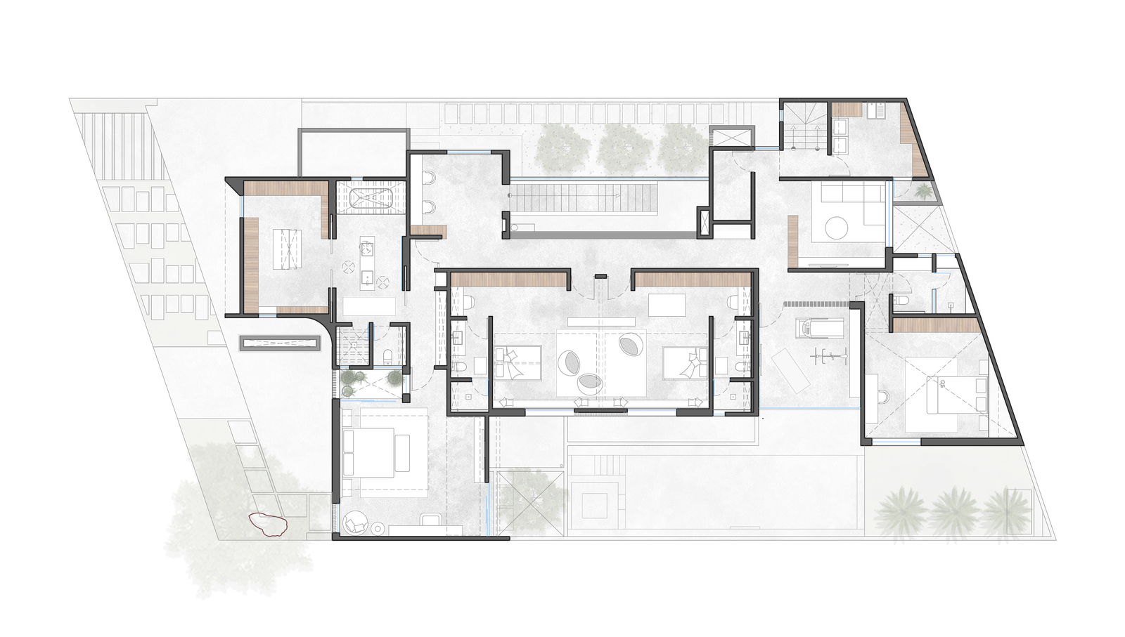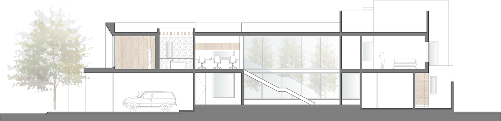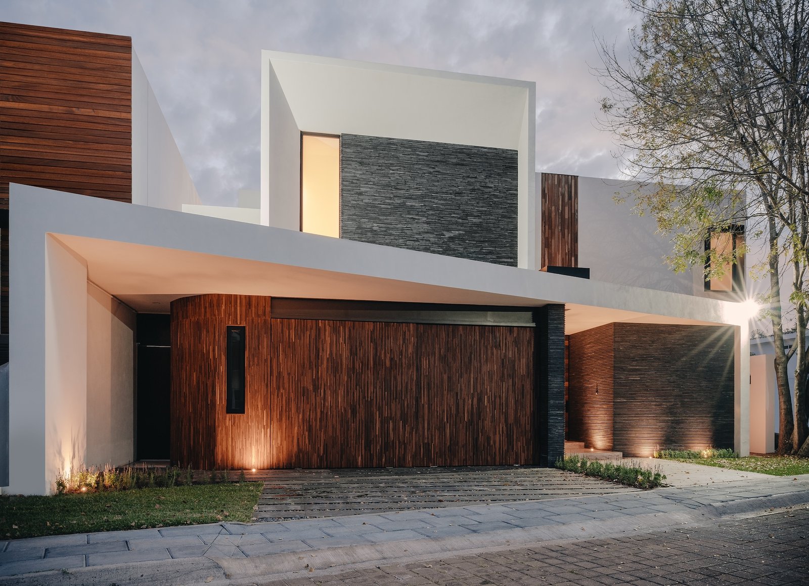 La fachada, discreta hacia la calle, se caracteriza por un juego geométrico con líneas curvas, que combina diferentes formas y texturas para crear un diseño moderno y elegante. El acceso a la casa se realiza por debajo de un árbol que acoge al usuario y lo invita a pasar.