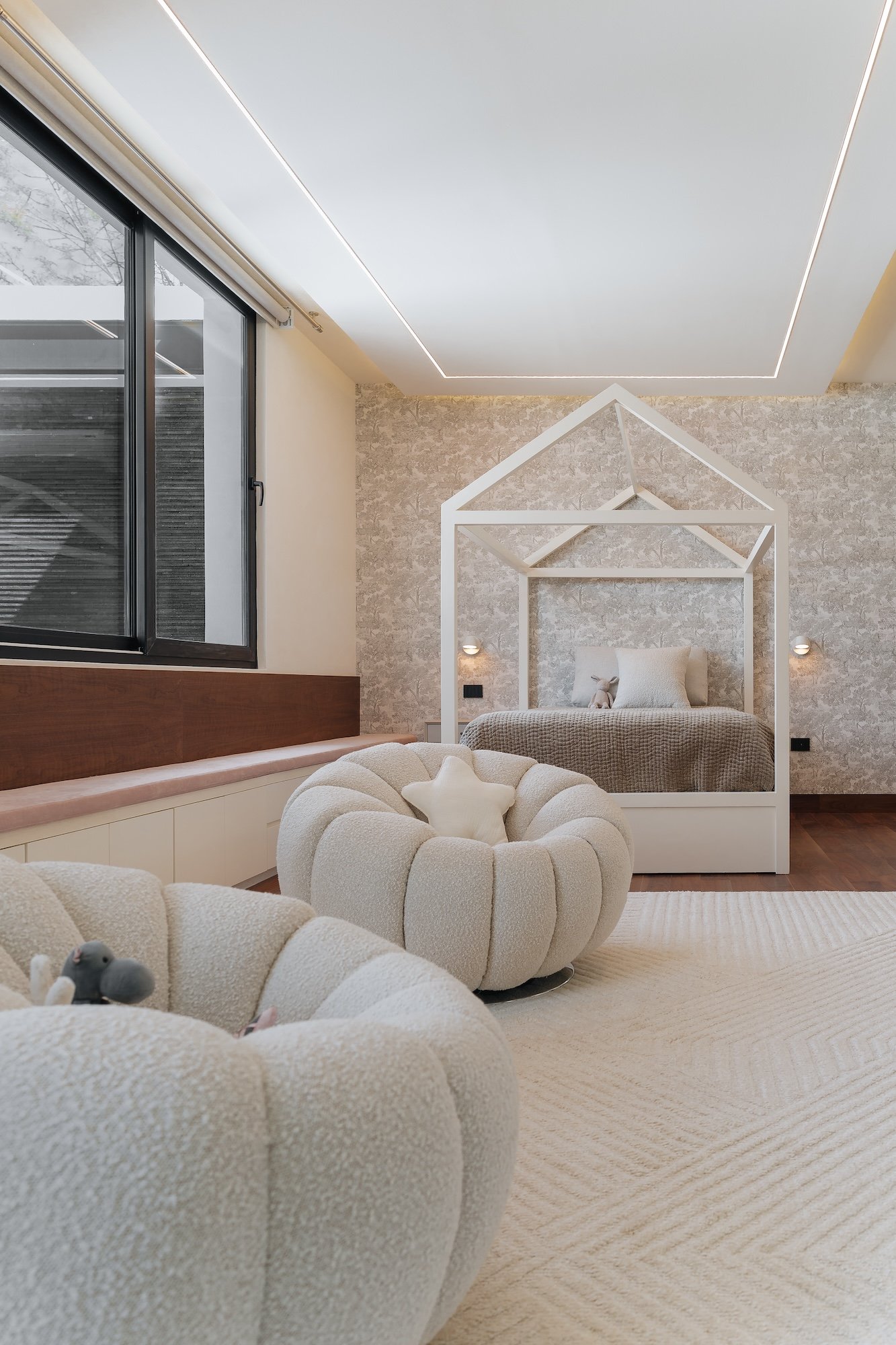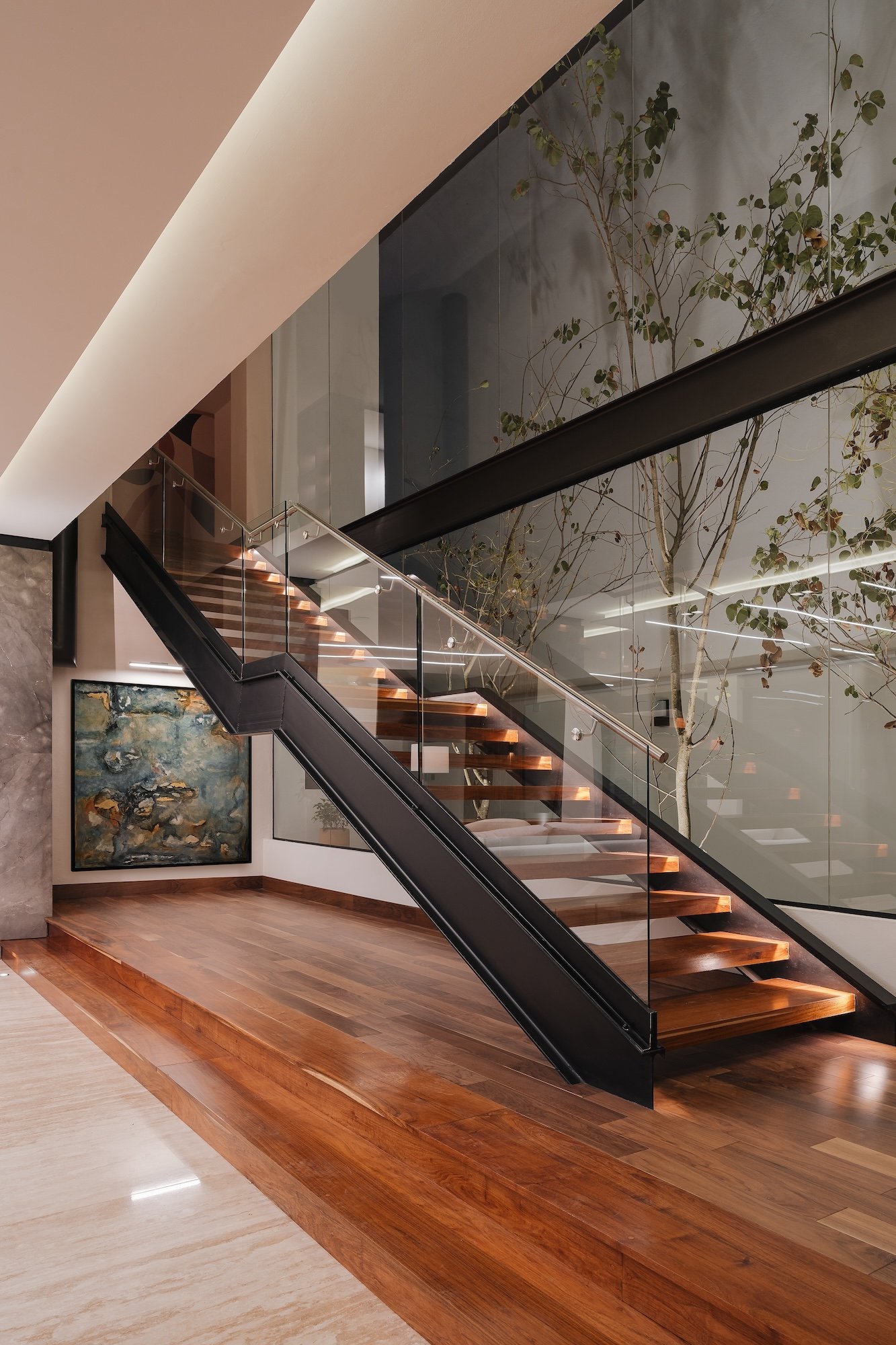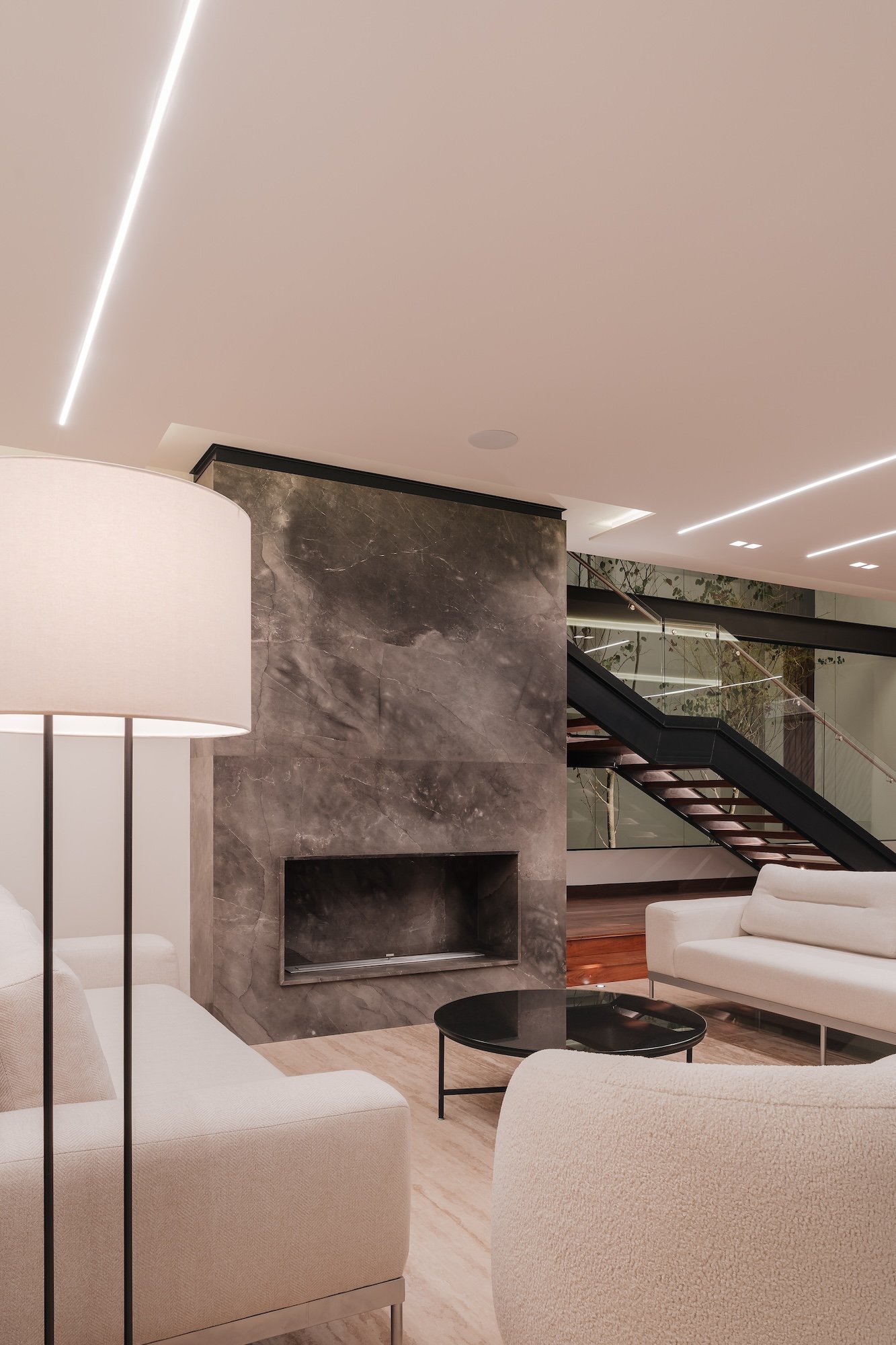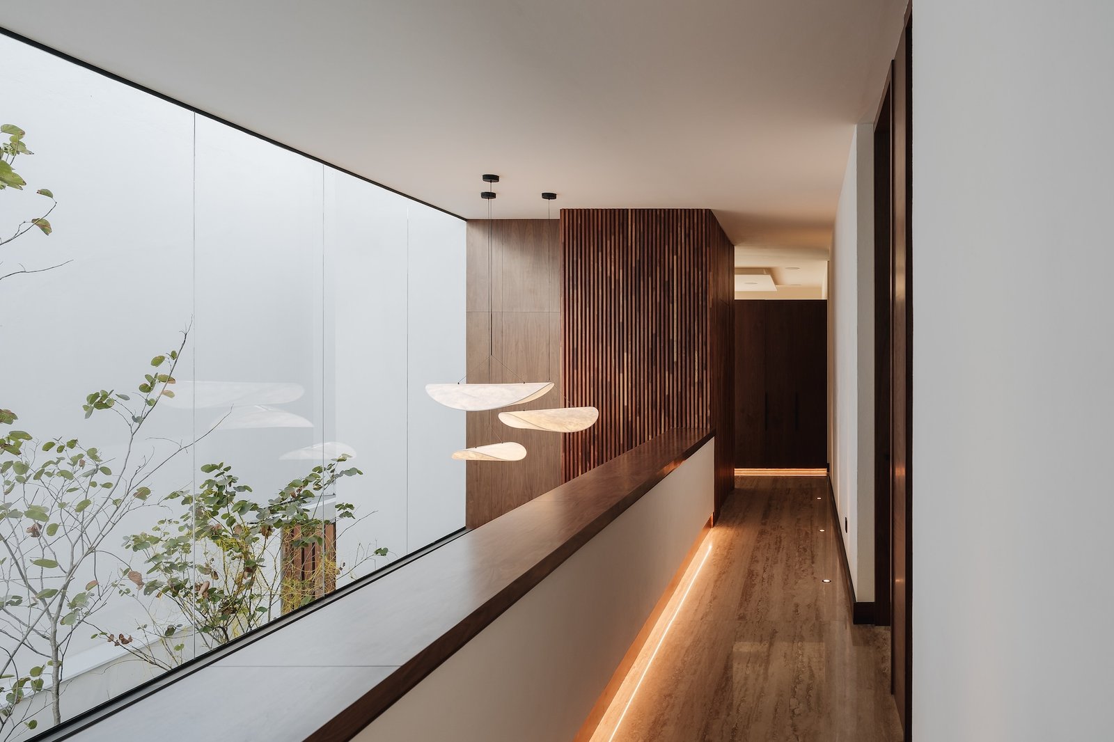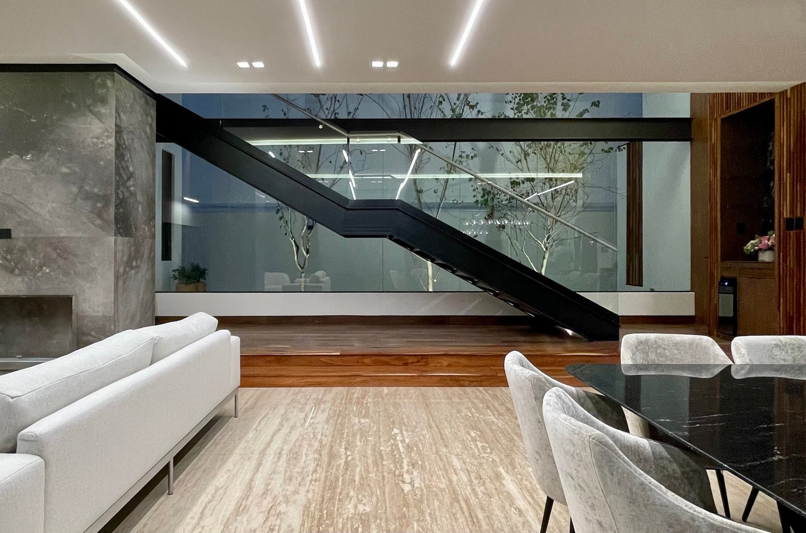 La casa cuenta con una doble altura en la zona de la escalera, con un diseño moderno y líneas rectas, la cual se vuelve protagonista en el proyecto. Esta doble altura y su conexión con el exterior, genera una sensación de amplitud y luminosidad en el interior de la casa.
