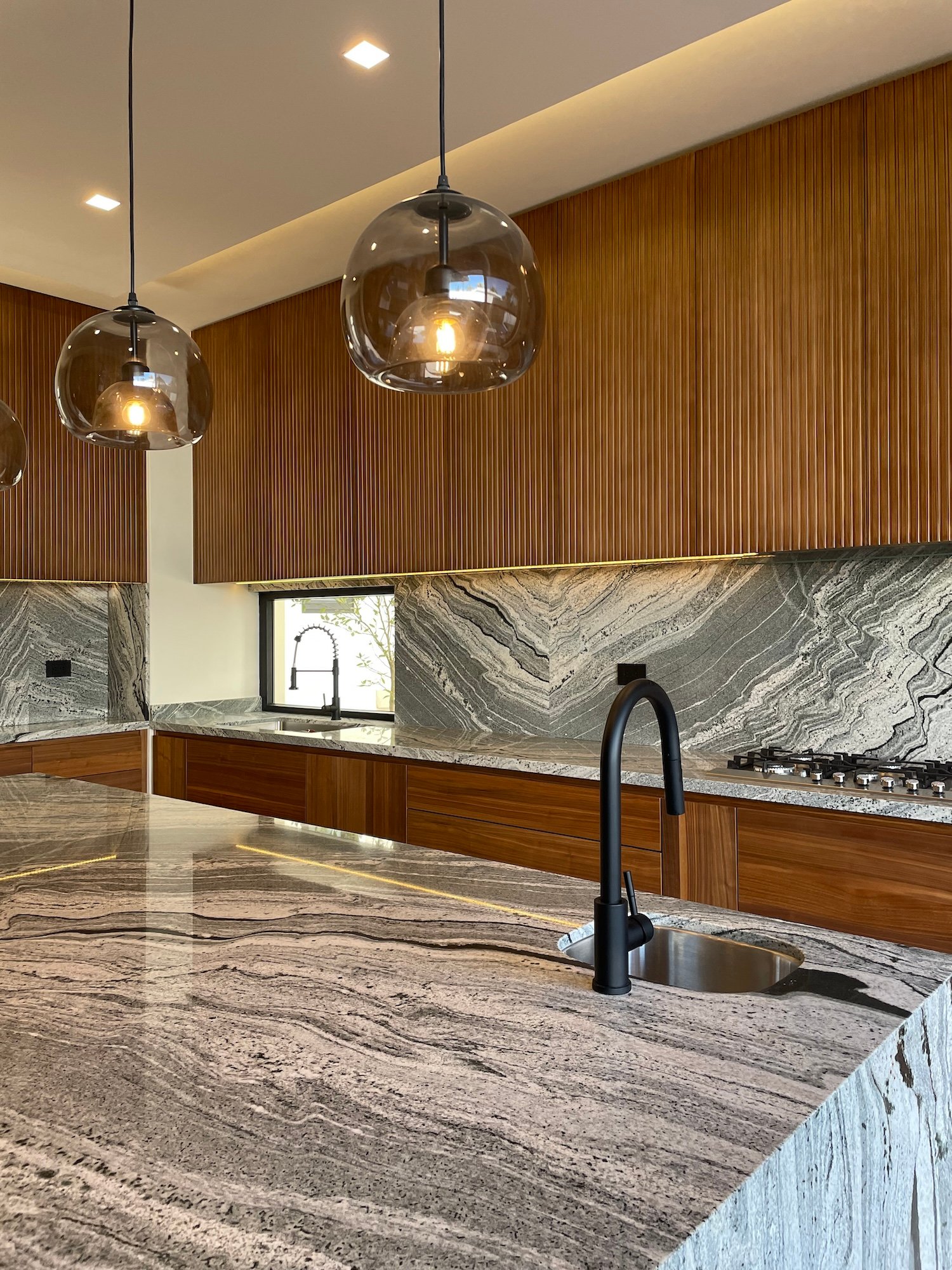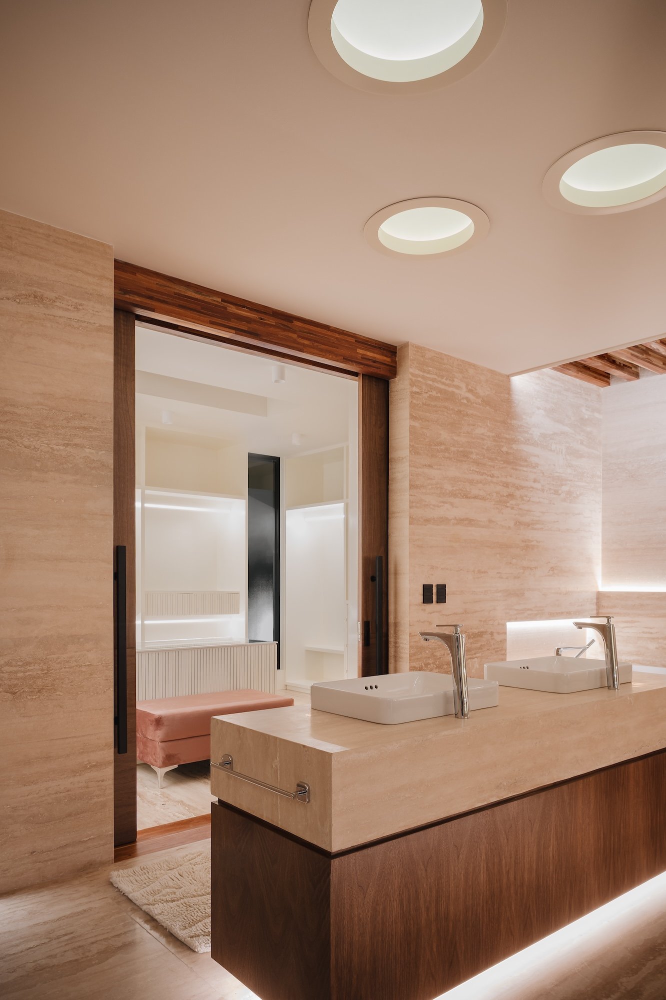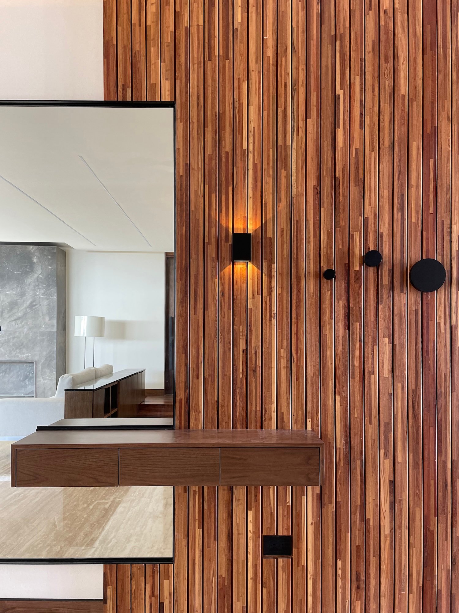 La casa es rica en materiales, los cuales le aportan una identidad única. El concreto, el mármol, la madera, la piedra natural, el acero, entre otros, se equilibran con la simplicidad de la forma y el detalle. Estos materiales definieron la envolvente de los interiores, generando texturas y contrastes que permiten una experiencia diferente del espacio, estableciendo ambientes cálidos y confortables.