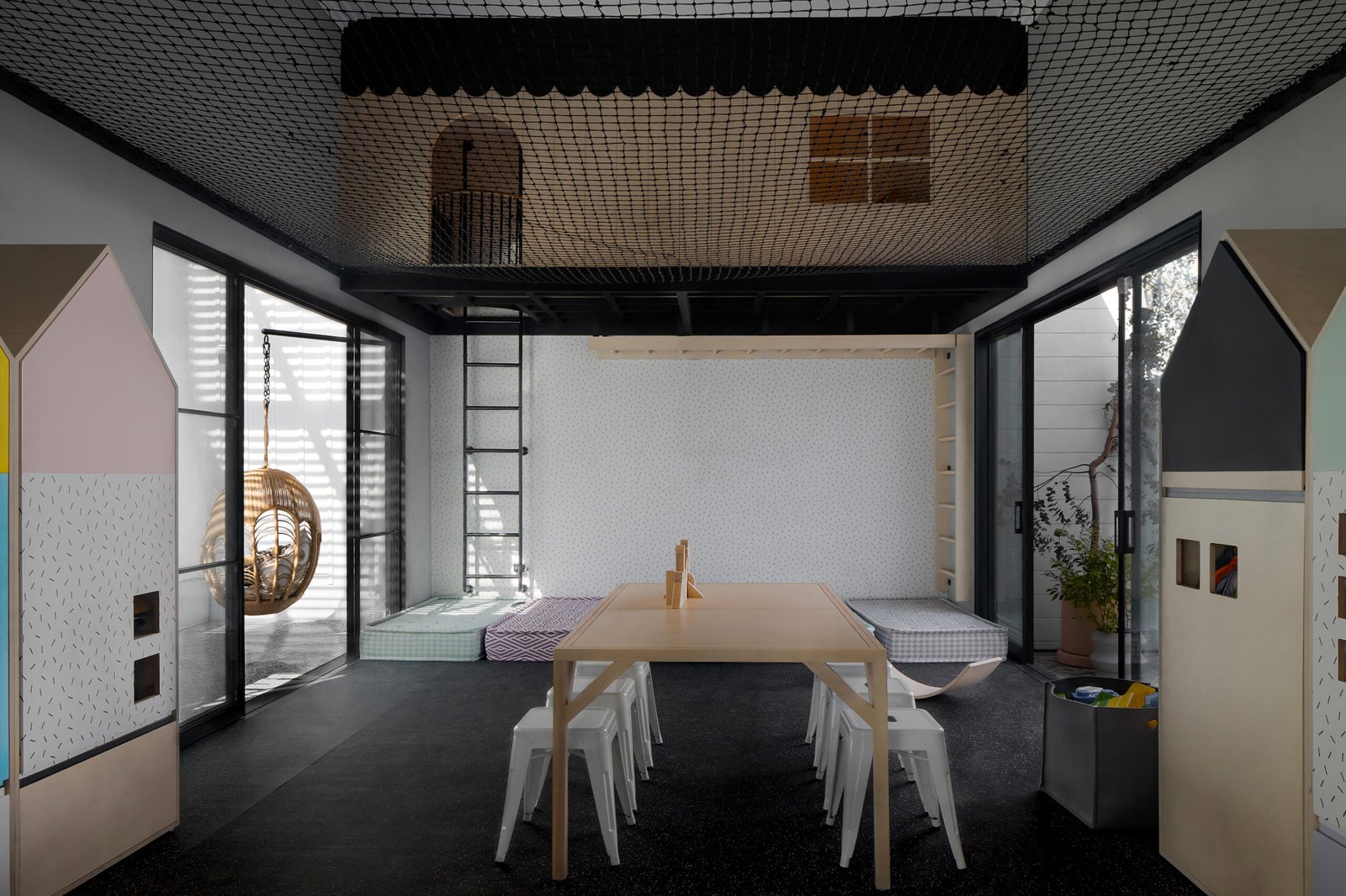 Las áreas de esparcimiento están enfocadas en sus dos tipos de usuario, para los niños una ludoteca a doble altura con piso de caucho, pasamanos, y un tapanco de juegos que se prolonga en todo el espacio con una red de descanso, y un patio de juegos como espacio de atelier, con loseta hidráulica en piso.