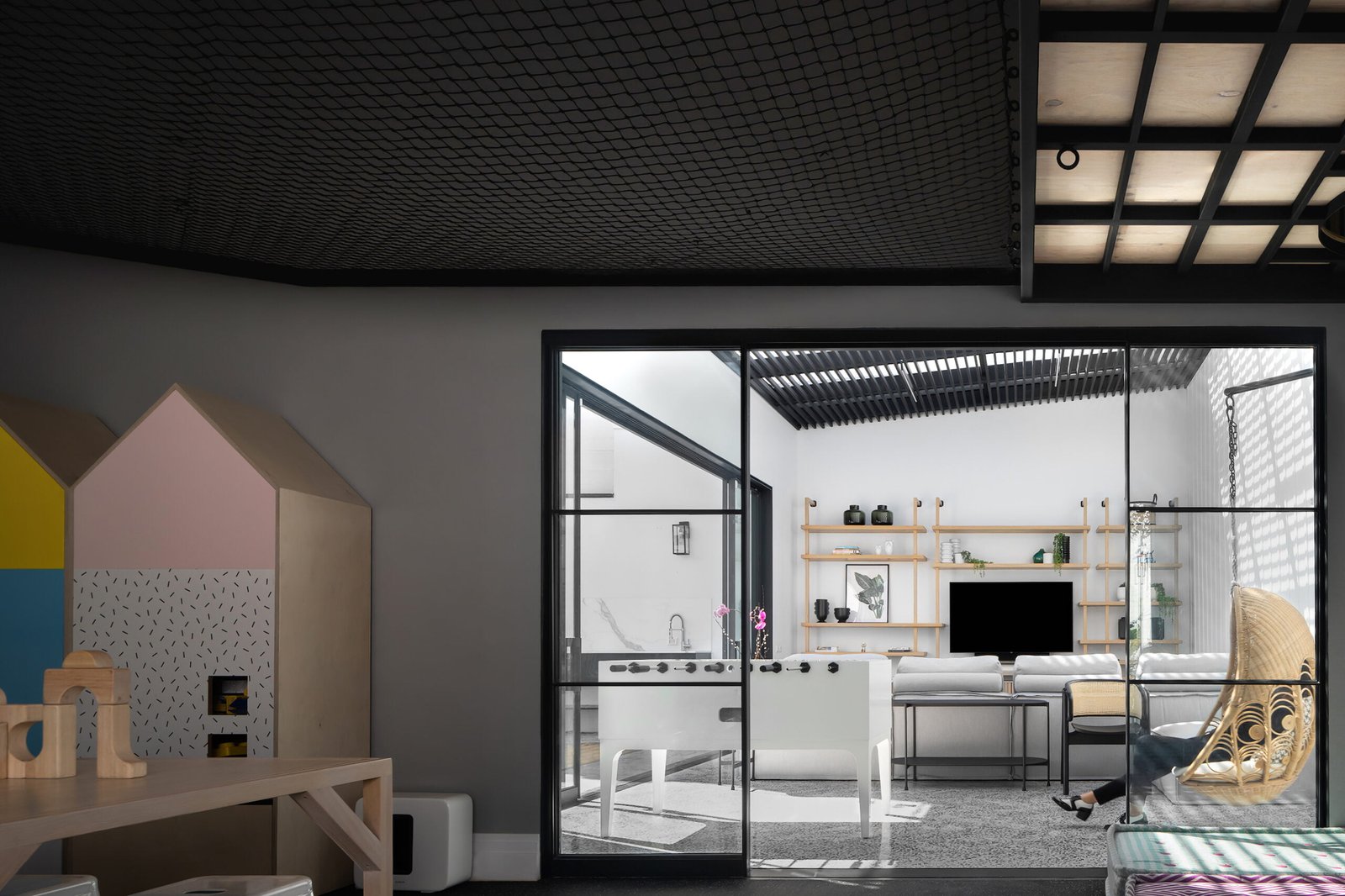 Para los adultos, la terraza de juegos permite sentirse al exterior, con una cubierta de cristal sobre un pergolado de delgados perfiles metálicos, y un piso espigado artesanal de terrazo blanco, con una cancelería corrediza que abre por completo el espacio hacia en jardín, el área de jacuzzi y asador, con un sillón en “L” alrededor de un gran mueble de tv de madera de encino, con futbolito un columpio es la zona más relajante de la casa.