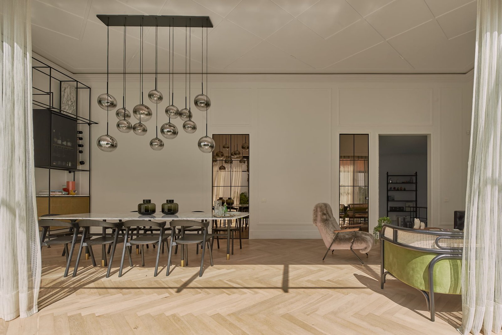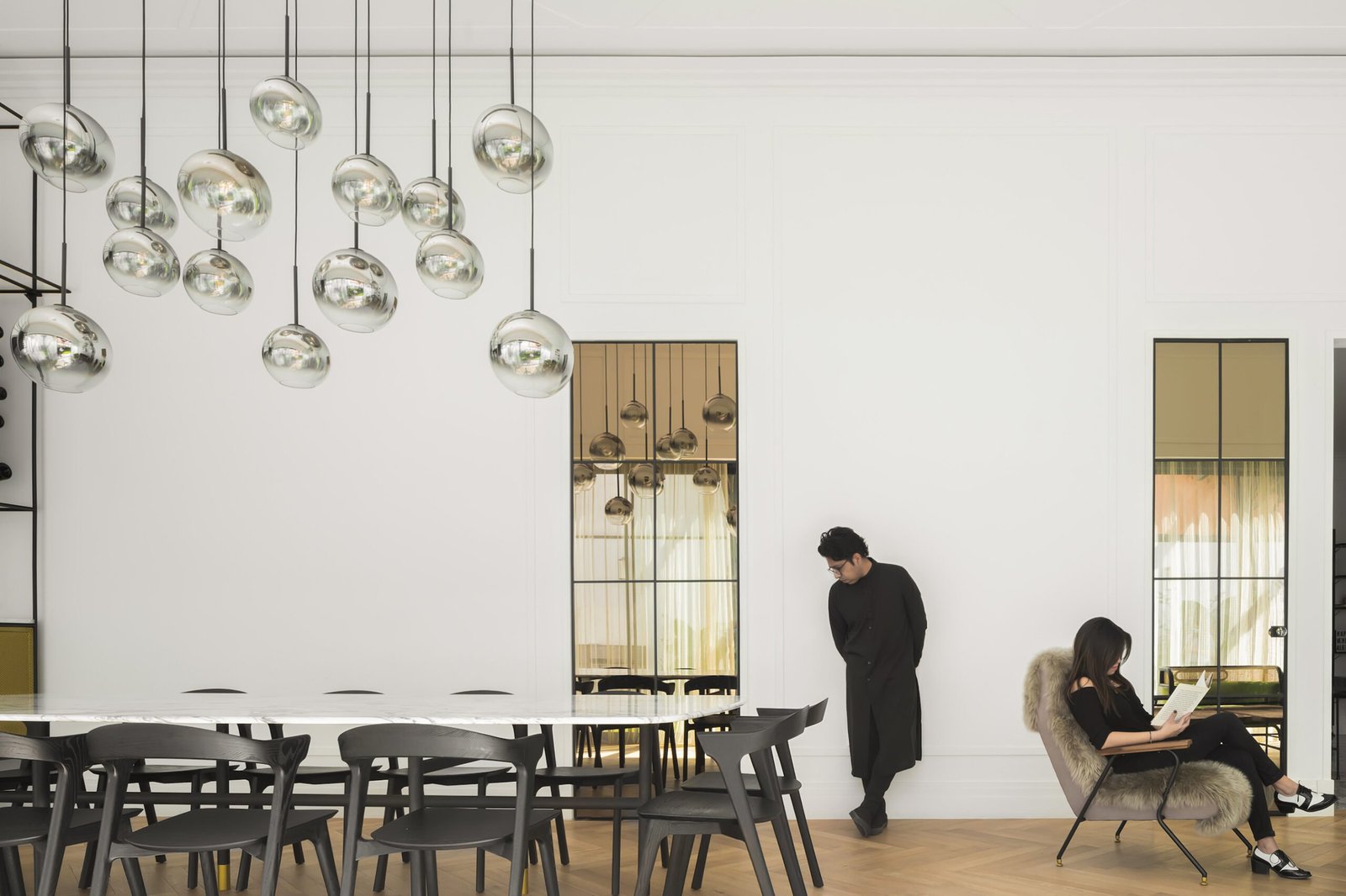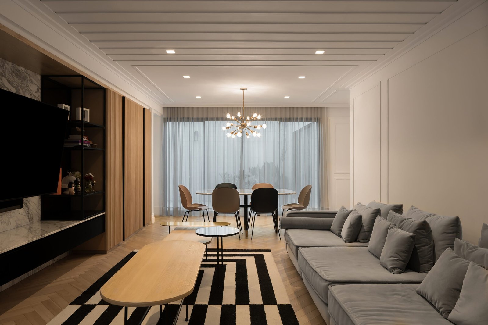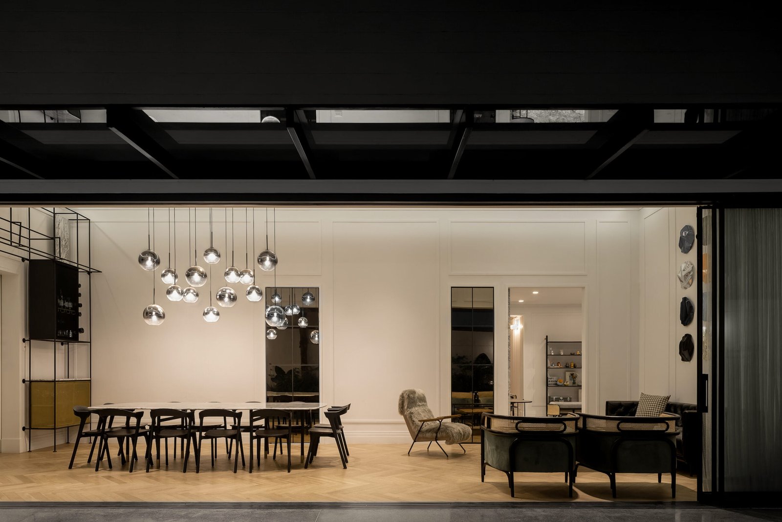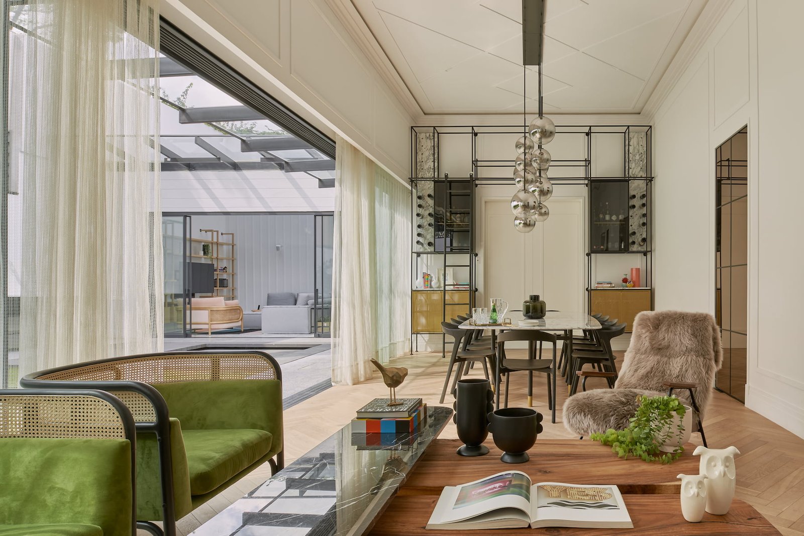 El área pública, se compone del salón principal (sala-comedor) que es un espacio a doble altura, con un cancel que abre completamente al jardín y permite la sensación de apertura total en este espacio, como remate visual, varios, en el muro del fondo se eleva una cava para vinos del total de la altura, dos puertas de cristal bronce con reflejan todo el jardín y la luminaria que cuelga sobre el comedor y una obra de arte da color al último muro. En este espacio sobresale el diseño de molduras que se encuentran en toda la casa, tanto en muros como en plafones, y la utilización de zoclos y cornisas integran el estilo nórdico que está presente en todo el proyecto.