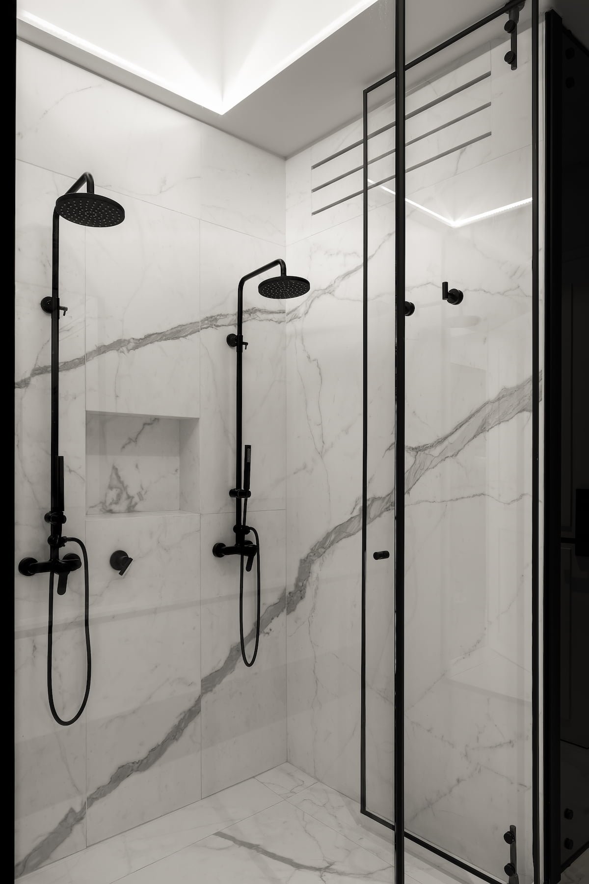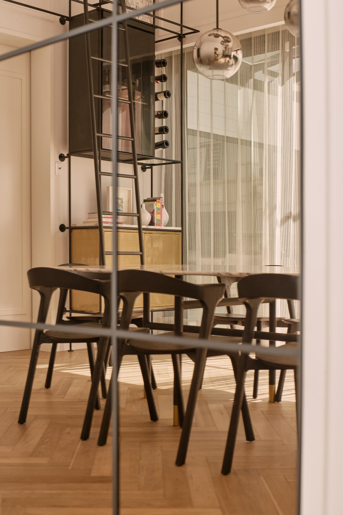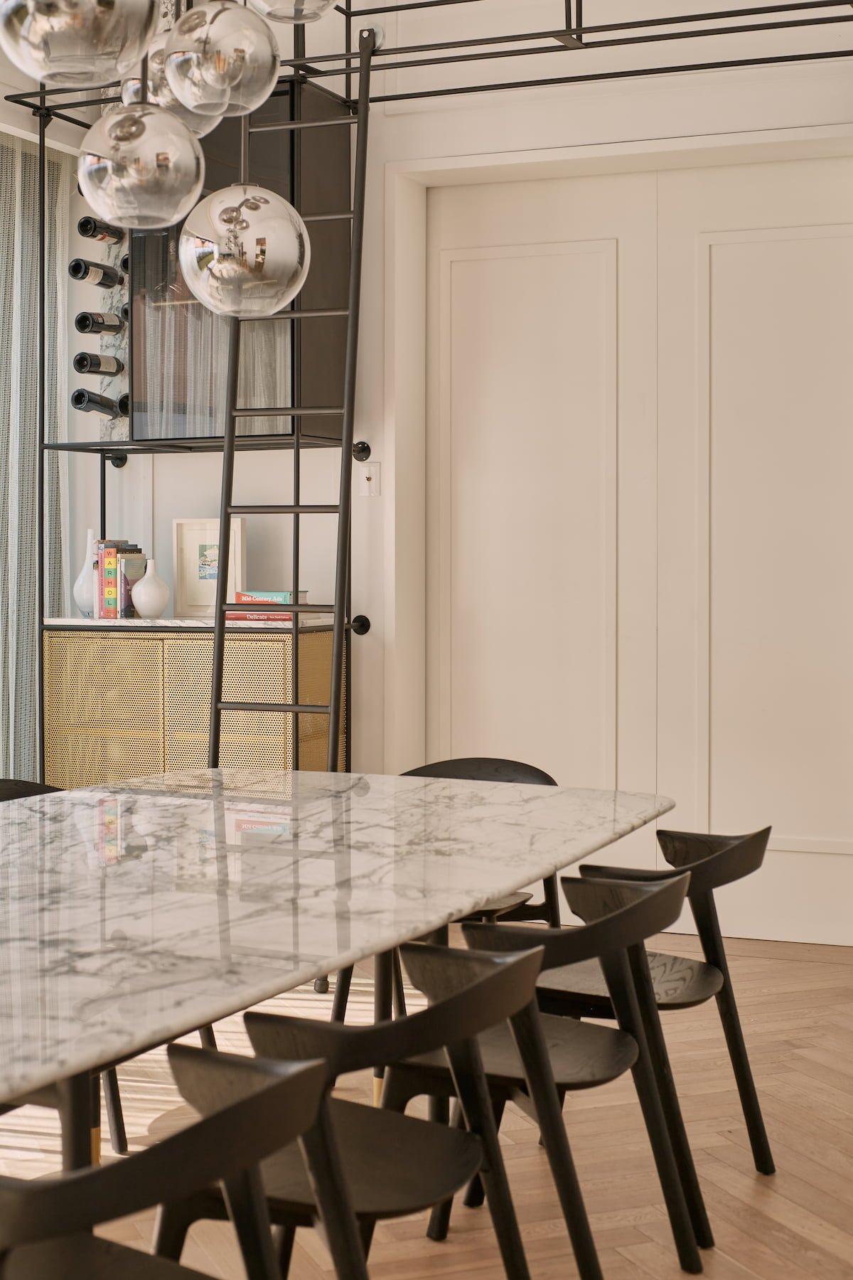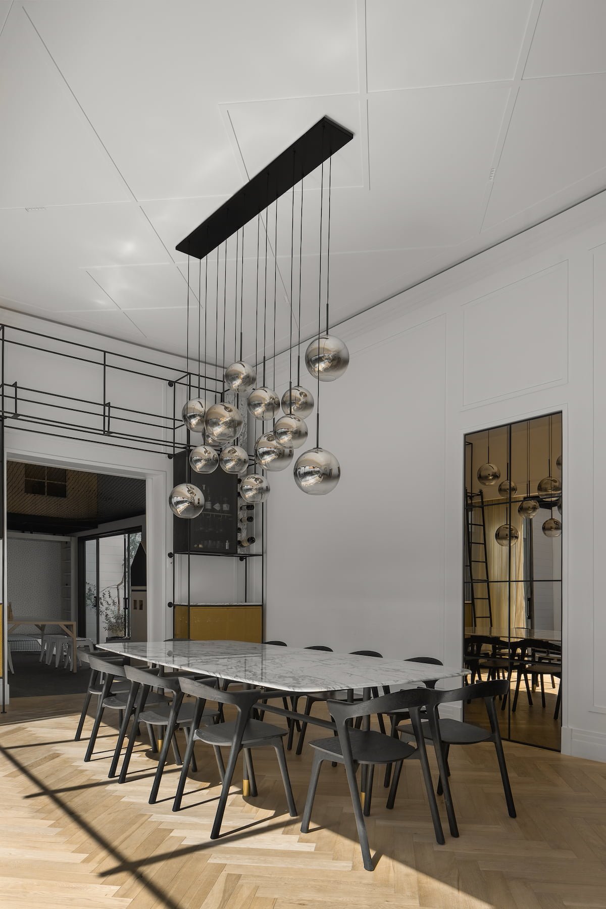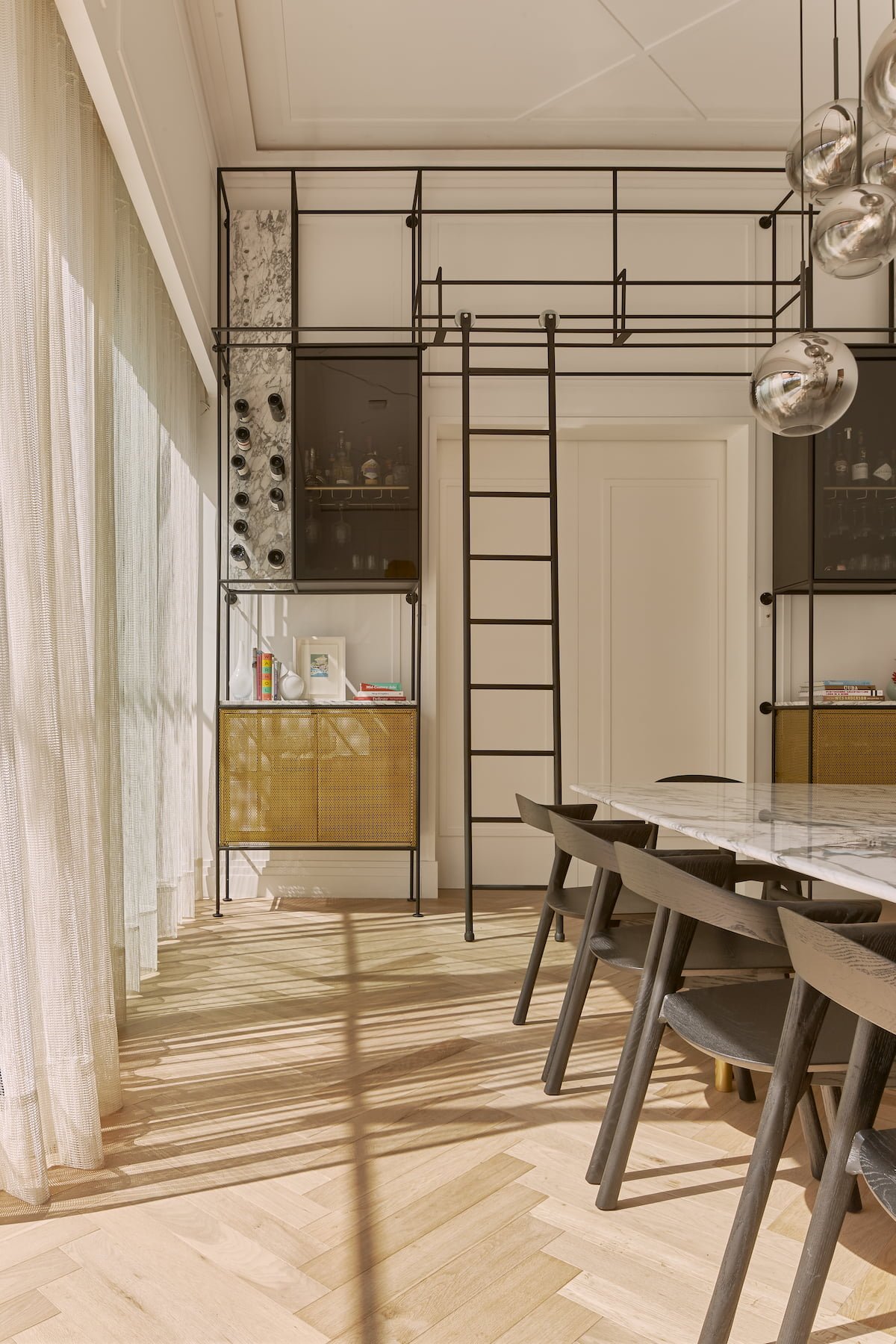 El área pública, se compone del salón principal (sala-comedor) que es un espacio a doble altura, con un cancel que abre completamente al jardín y permite la sensación de apertura total en este espacio, como remate visual, varios, en el muro del fondo se eleva una cava para vinos del total de la altura, dos puertas de cristal bronce con reflejan todo el jardín y la luminaria que cuelga sobre el comedor y una obra de arte da color al último muro. En este espacio sobresale el diseño de molduras que se encuentran en toda la casa, tanto en muros como en plafones, y la utilización de zoclos y cornisas integran el estilo nórdico que está presente en todo el proyecto.