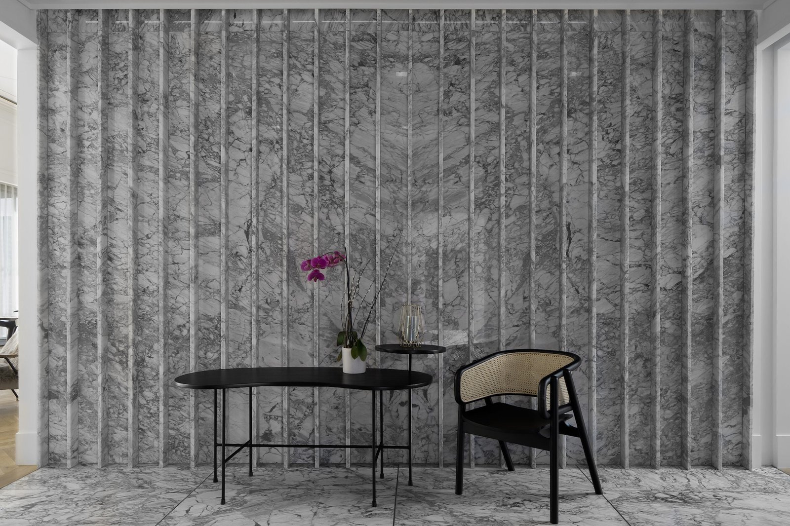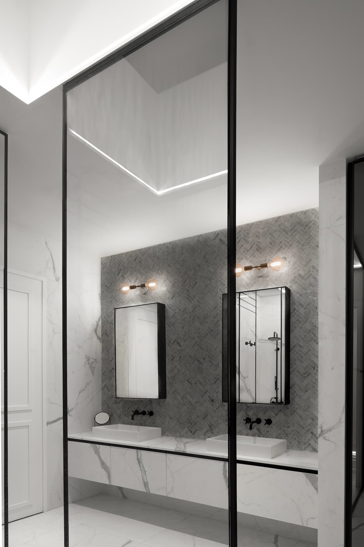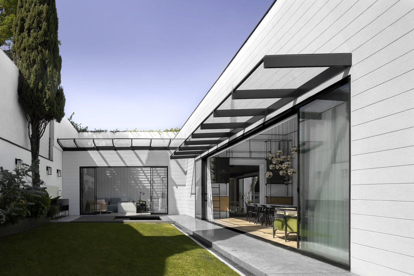 La casa se muestra con una fachada ciega hacia el exterior, de color blanco con una larga jardinera de solera negra y dos accesos embocinados con portones negros, vehicular y peatonal, escoltados por una jacaranda, el acceso / estacionamiento con cubierta de cristal y vigas metálicas, enmarcan la puerta principal de la casa con un color sábila, que permite el acceso al recibidor, con un lambrin de tiras de mármol de carrara blanco como remate visual, este espacio vestibula la casa entre la zona privada, la zona de convivencia y la oficina. Todo el programa se conecta por patios interiores, los cuales ventilan naturalmente cada espacio, además de que la luz entra a esta casa, por distintos vanos a diferentes horas del día, de ahí viene su nombre.