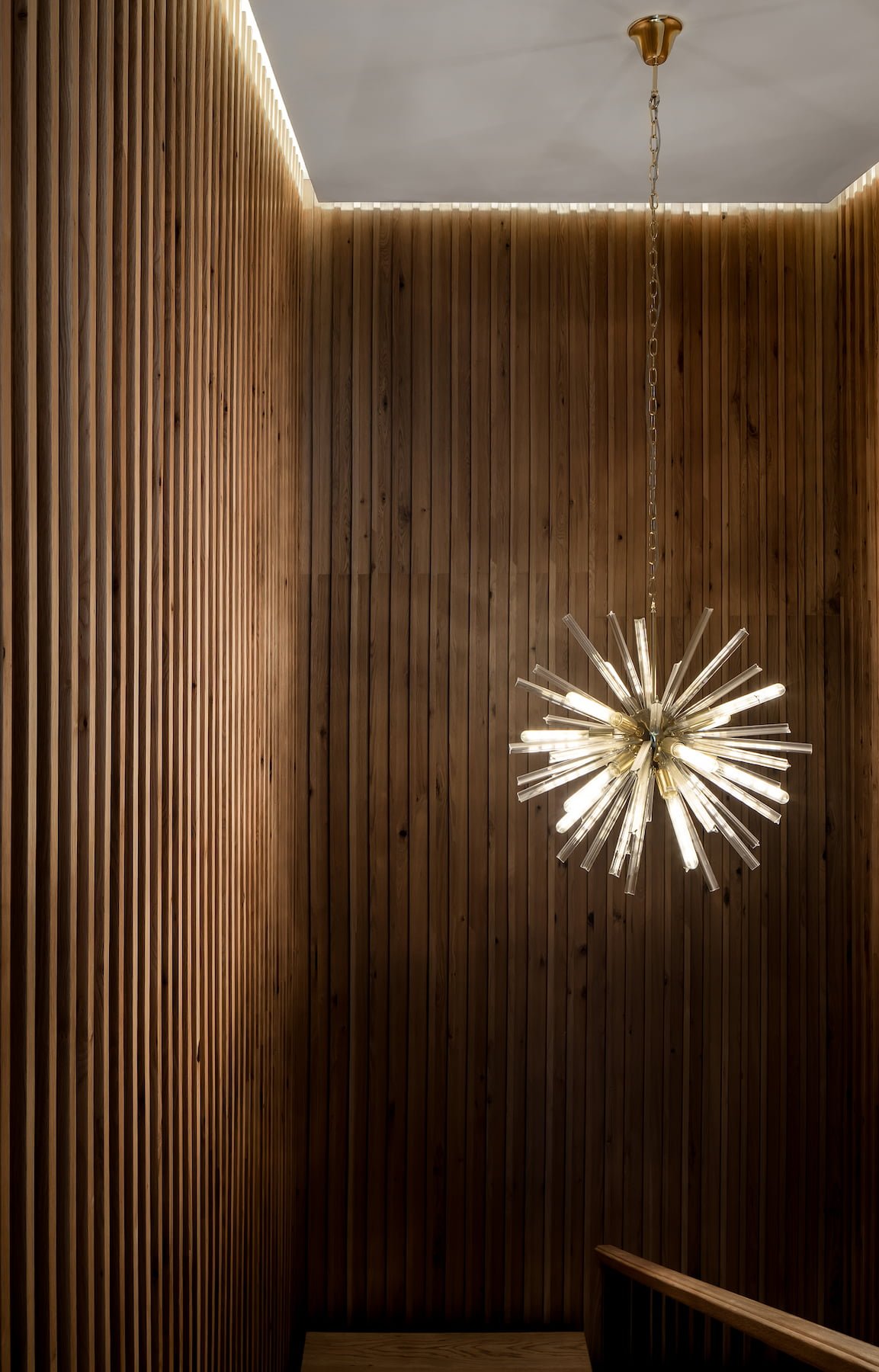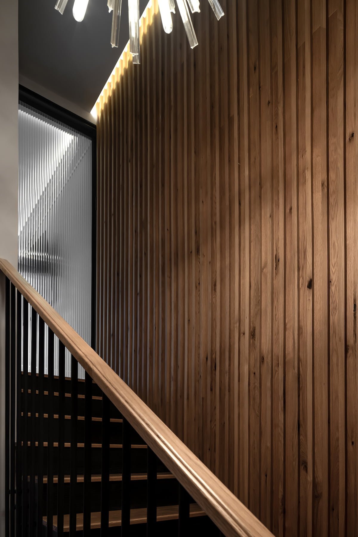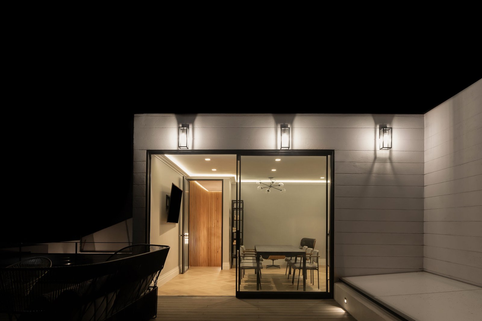 En el primer nivel de la casa se encuentra una oficina, las escaleras están envueltas con lambrin de madera de nogal y una luminaria colgante que enmarcan la transición al espacio más masculino de la casa, con una mesa de juntas para 8 personas y un espacio de lectura, con una gran terraza con mobiliario exterior y una celosía que brinda privacidad al espacio.