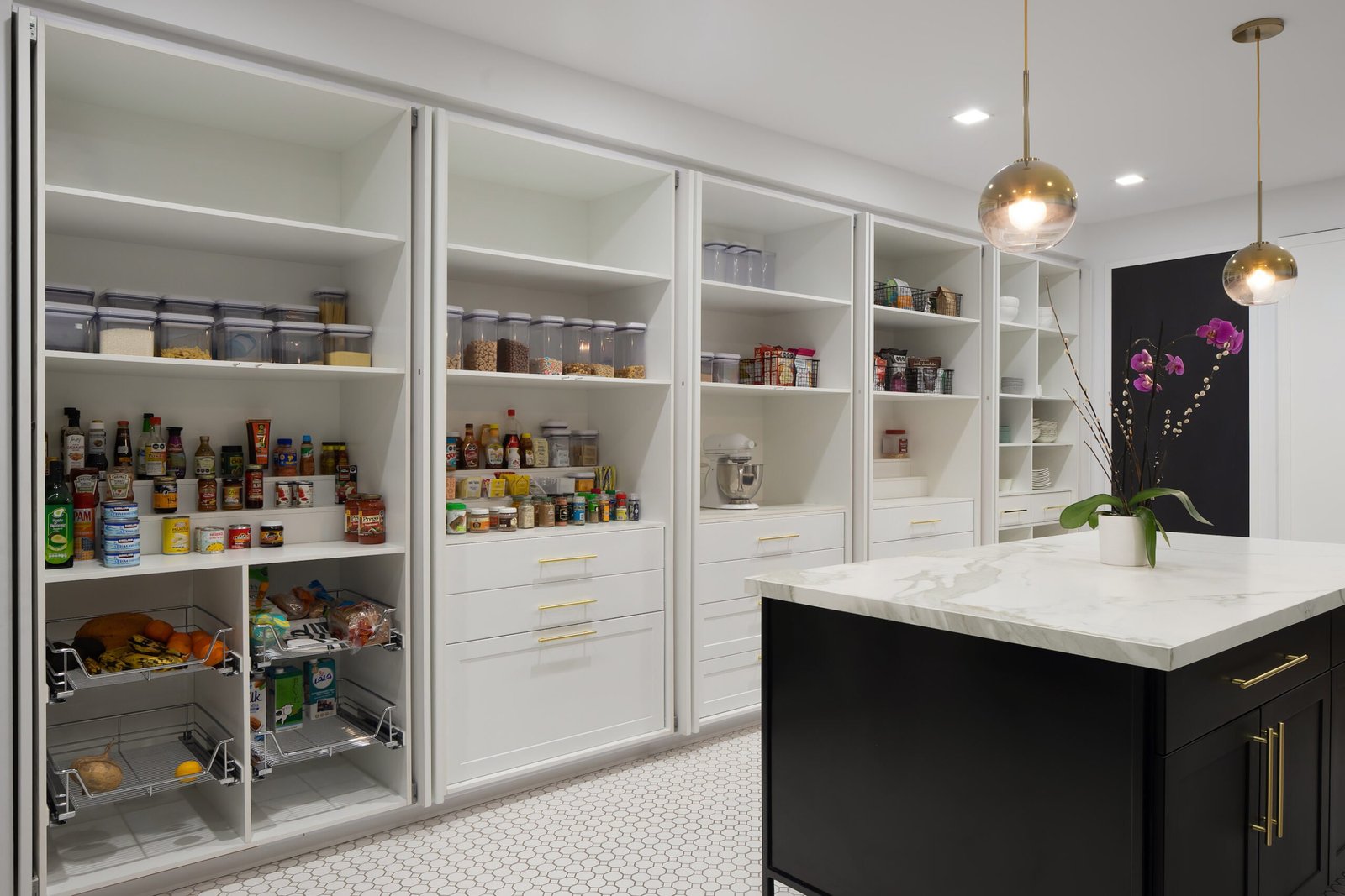 Las áreas de conexión entre los espacios públicos y privados, son las de servicio y esparcimiento, la cocina se encuentra al centro de la casa, con una gran isla central y una alacena que se extiende a lo largo de todo el muro y tiene servicio tanto al family room como al salón principal.